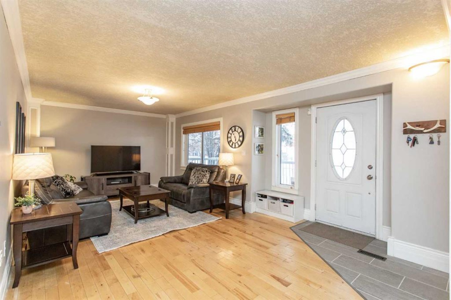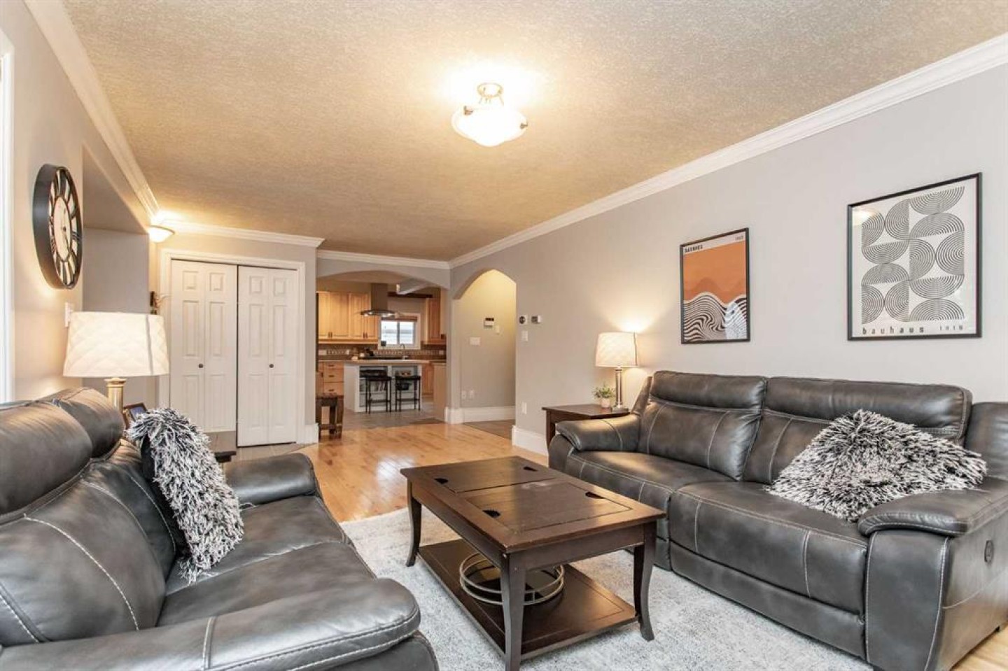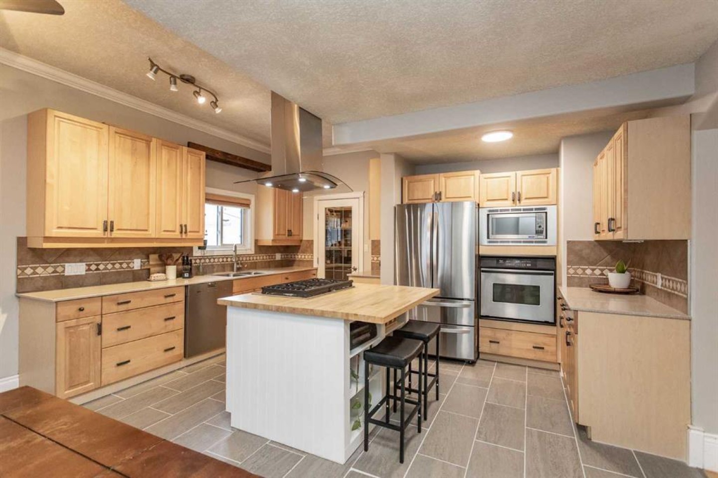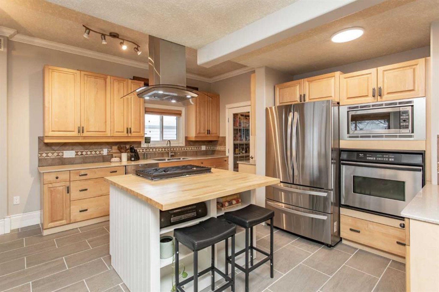 Completely remodeled and boasting over 2000 sq ft which includes 8-10' additions of all new construction this exceptional two story home sits proudly on a picturesque tree lined street. Home is perfectly located just a short block to the incredible Waskasoo trail system and within walking distance to a number of schools, Kerry Wood Nature Center and for entertainment head to the Memorial Center for live performances. Envision yourself sitting on the huge covered front porch ideal for savoring a morning coffee on. Decorative stone pillars give it a rustic wood feel. Follow inside to the open and inviting floor plan complimented with maple hardwood floors and ceramic tile throughout. Large family room with picture window allows plenty of natural light to cascade in plus the crown molding along the ceiling lines add to the finishing. An absolute chefs dream for a kitchen design offering full surround Silestone quartz counters, undermount sink, built in oven and microwave, loads of cabinet space and drawers, coffee bar station plus a center island with gas cook top, hanging exhaust fan and Butcher Block counter top. Huge walk in pantry with floor to ceiling shelving plus there is a trap door leading to an additional storage space below. Enjoy the crackling free standing wood fireplace just off the dining area adding ambience to a winter day. The sumptuous main level Primary bedroom is a true retreat away. Plenty of room for your King size furniture, large walk in closet plus a spa like en suite offering dual vanity, walk in double shower plus a soothing two person corner air tub. Head upstairs and you will find three large, comfortable bedrooms with ample space providing flexibility for growing families or guest accommodations. Fully developed basement offers a great amount of space for recreation and entertainment. Enjoy your favorite streaming in the private media room with trayed lighting plus your own wet bar. Games area perfect for the kids to have fun in plus the office/den is great for work space or studio area. The mechanical/laundry room is equipped with wash basin, functioning toilet, two newer hot water tanks, high efficiency furnace plus built in vac. Main plumbing stack has been replaced with back water valve plus new electrical panel in home as well. Home was also renovated to incorporate thermal break technology. Staggered stud framing greatly mitigates cold penetration, manages heat penetration and also minimizes noise transfer for added comfort. There is a spacious covered back deck which even offers a gas line for the bbq allowing you to grill year round. The beautiful mature yard comes with its own food forest label boasting raspberry, blueberry, black current bushes plus an apple tree. Firepit area great for sitting around and making enjoyable memories. Large 24 x 24 heated garage ideal for vehicle storage plus there is even room for RV parking plus there is a garden shed perfect for seasonal items.