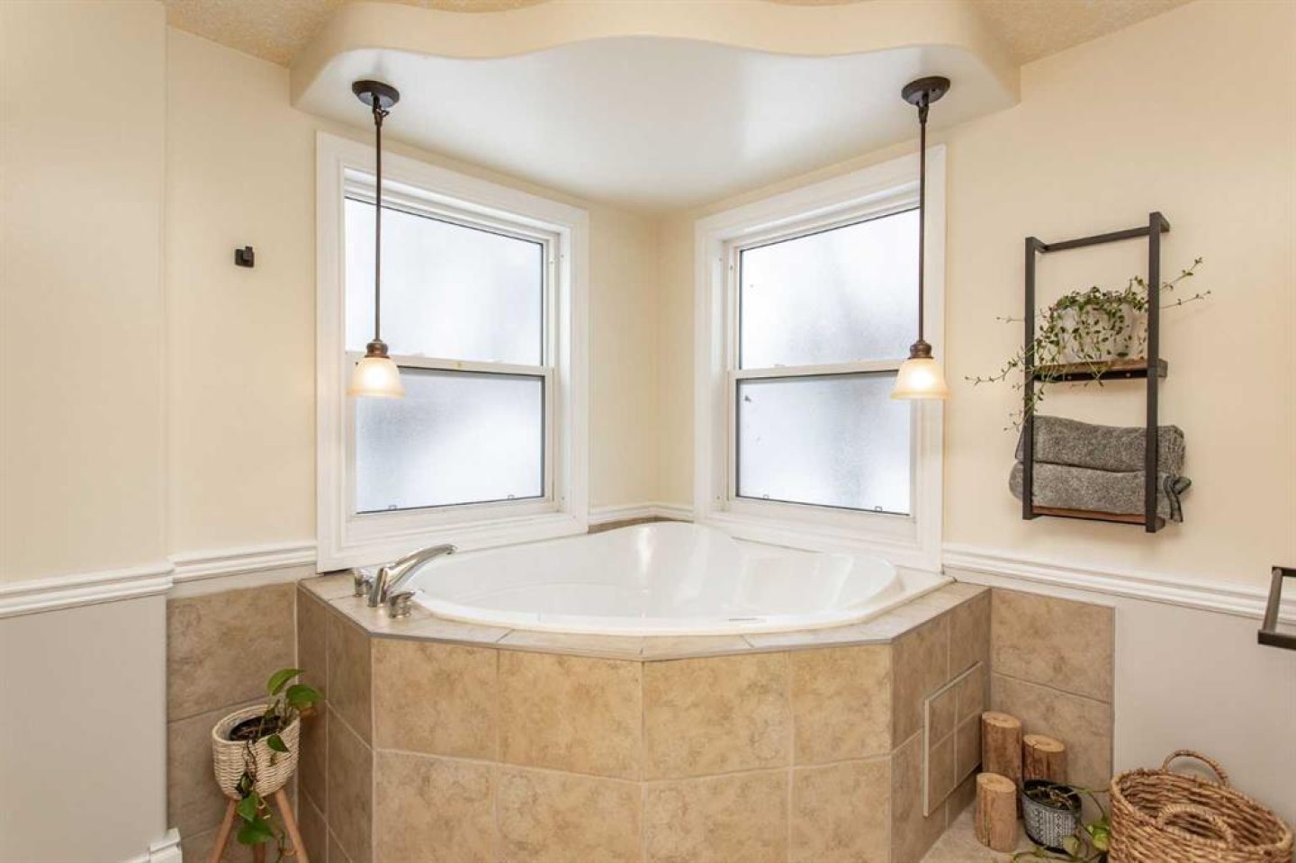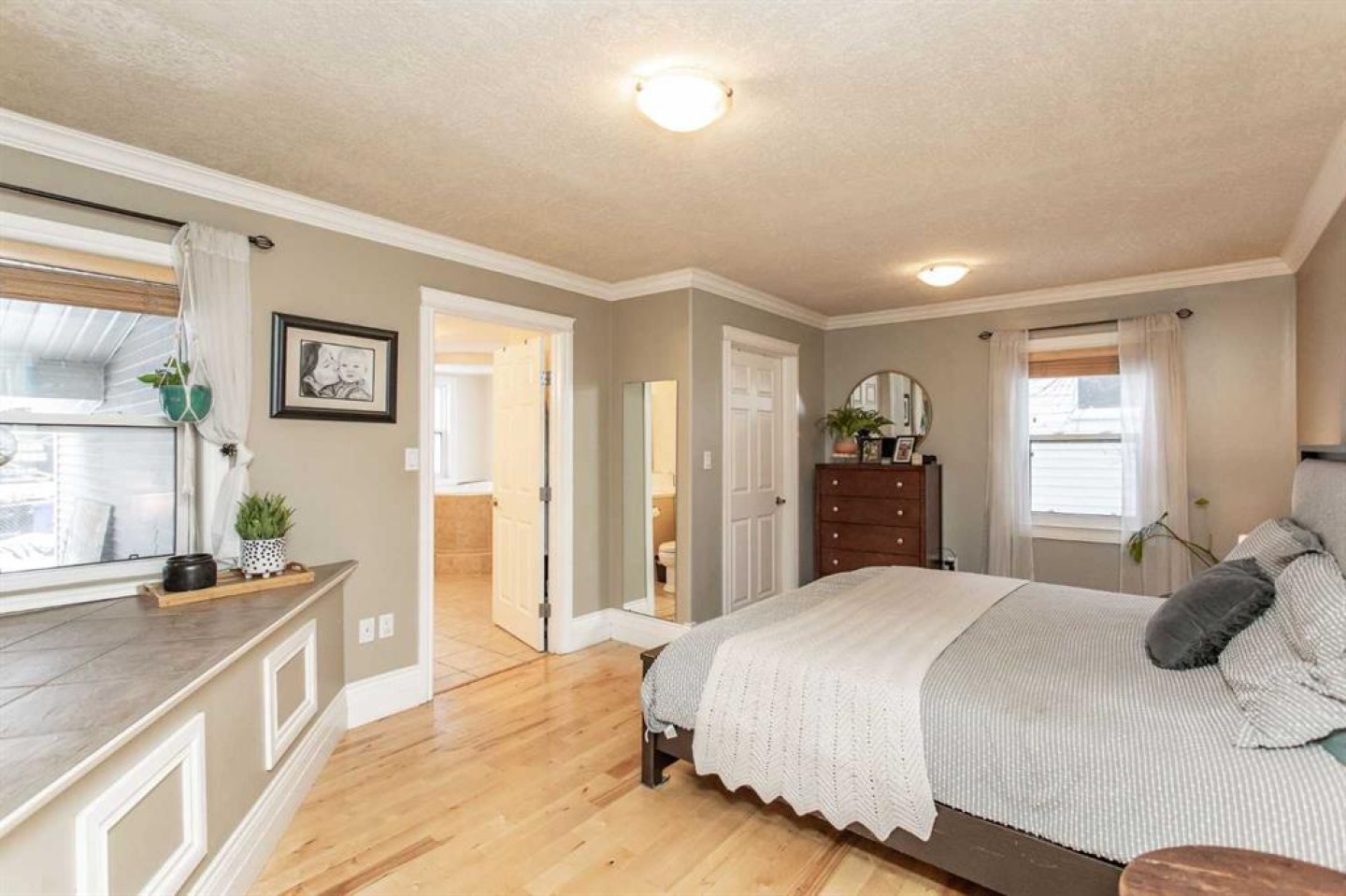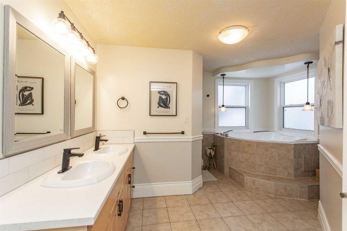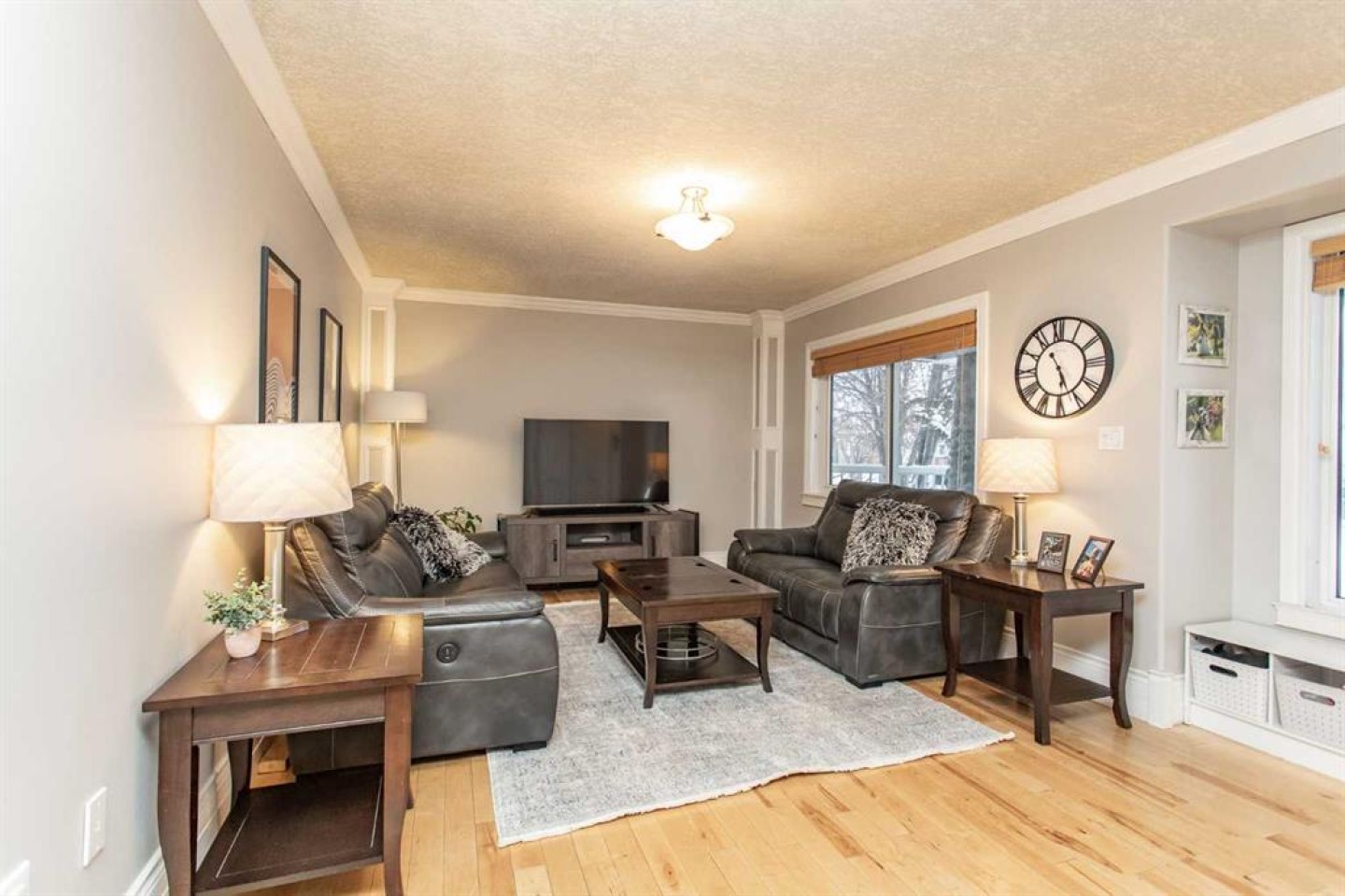 Completely remodeled and boasting over 2000 sq ft which includes 8-10' additions of all new construction this exceptional two story home sits proudly on a picturesque tree lined street. Home is perfectly located just a short block to the incredible Waskasoo trail system and within walking distance to a number of schools, Kerry Wood Nature Center and for entertainment head to the Memorial Center for live performances. Envision yourself sitting on the huge covered front porch ideal for savoring a morning coffee on. Decorative stone pillars give it a rustic wood feel. Follow inside to the open and inviting floor plan complimented with maple hardwood floors and ceramic tile throughout. Large family room with picture window allows plenty of natural light to cascade in plus the crown molding along the ceiling lines add to the finishing. An absolute chefs dream for a kitchen design offering full surround Silestone quartz counters, undermount sink, built in oven and microwave, loads of cabinet space and drawers, coffee bar station plus a center island with gas cook top, hanging exhaust fan and Butcher Block counter top. Huge walk in pantry with floor to ceiling shelving plus there is a trap door leading to an additional storage space below. Enjoy the crackling free standing wood fireplace just off the dining area adding ambience to a winter day. The sumptuous main level Primary bedroom is a true retreat away. Plenty of room for your King size furniture, large walk in closet plus a spa like en suite offering dual vanity, walk in double shower plus a soothing two person corner air tub. Head upstairs and you will find three large, comfortable bedrooms with ample space providing flexibility for growing families or guest accommodations. Fully developed basement offers a great amount of space for recreation and entertainment. Enjoy your favorite streaming in the private media room with trayed lighting plus your own wet bar. Games area perfect for the kids to have fun in plus the office/den is great for work space or studio area. The mechanical/laundry room is equipped with wash basin, functioning toilet, two newer hot water tanks, high efficiency furnace plus built in vac. Main plumbing stack has been replaced with back water valve plus new electrical panel in home as well. Home was also renovated to incorporate thermal break technology. Staggered stud framing greatly mitigates cold penetration, manages heat penetration and also minimizes noise transfer for added comfort. There is a spacious covered back deck which even offers a gas line for the bbq allowing you to grill year round. The beautiful mature yard comes with its own food forest label boasting raspberry, blueberry, black current bushes plus an apple tree. Firepit area great for sitting around and making enjoyable memories. Large 24 x 24 heated garage ideal for vehicle storage plus there is even room for RV parking plus there is a garden shed perfect for seasonal items.