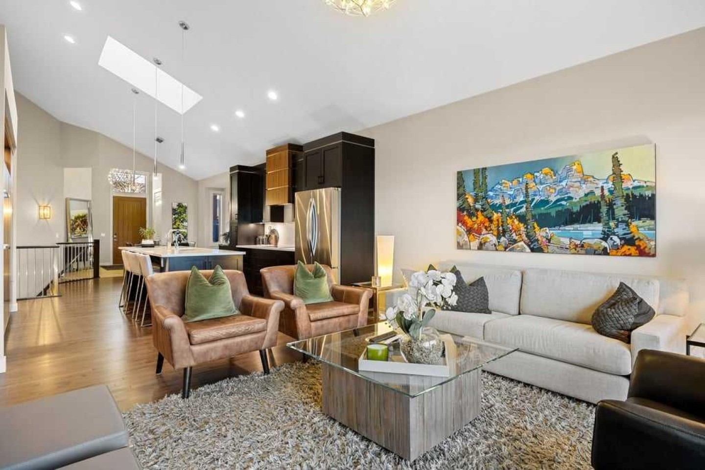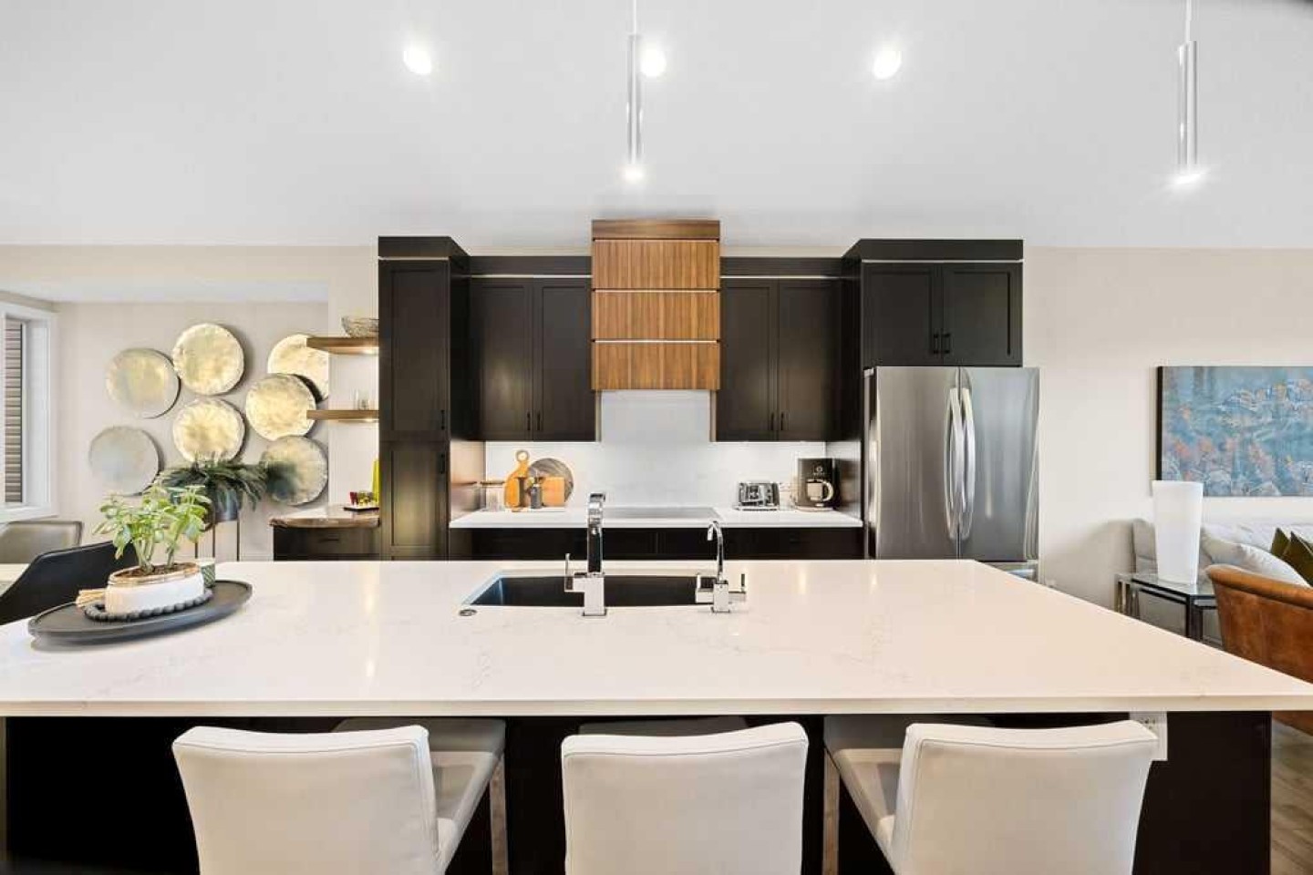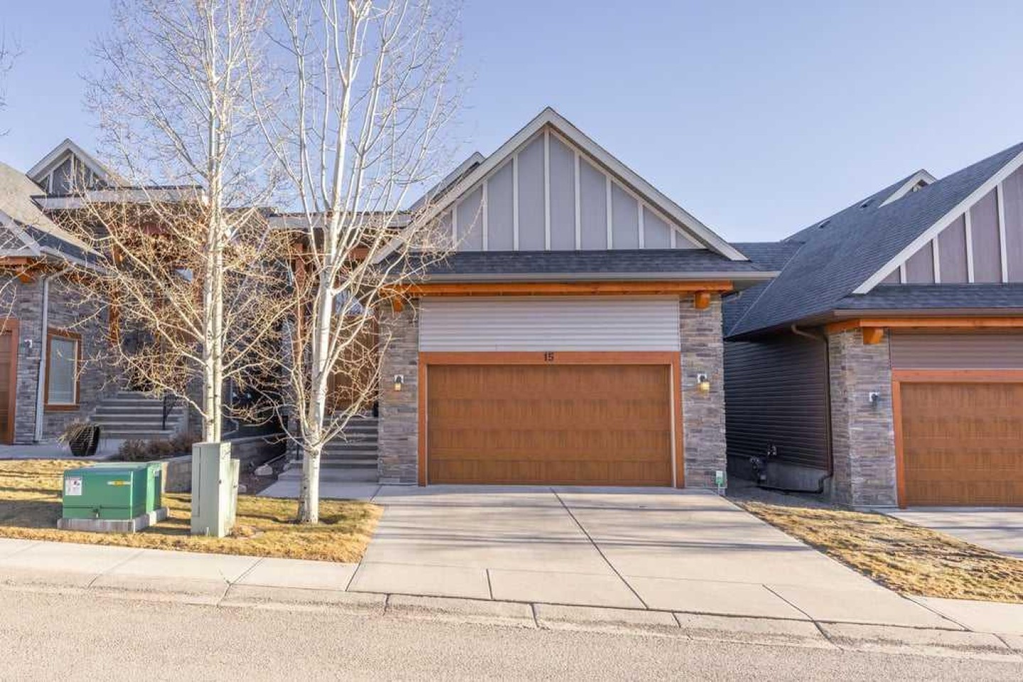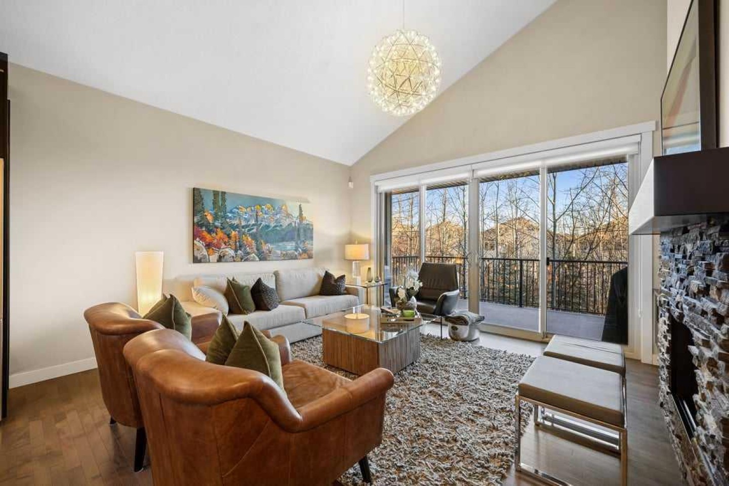 Backing onto a treed green space in Montreux and just moments from Aspen Landing, this stunning detached bungalow villa offers a rare blend of privacy, elegance, and effortless living. Part of an exclusive 30-unit bareland condominium enclave, this Trico-built home showcases quality craftsmanship and thoughtful design, with exceptional summer privacy thanks to its lush natural backdrop. Designed for both everyday comfort and refined entertaining, the main level features vaulted ceilings and a large skylight over the kitchen that fills the home with natural light, refreshed hardwood flooring, upgraded lighting throughout, and elevated finishes at every turn. The chef-inspired kitchen has been beautifully updated with new quartz countertops, a new Blanco sink, premium appliances including an induction cooktop, and seamless flow into the open living and dining areas. The main floor includes a spacious primary retreat with a luxurious 5-piece ensuite featuring a soaker tub and oversized shower, along with a second bedroom or den offering flexibility for guests or a private workspace. The mudroom is enhanced with Denca customized cabinetry, offering both style and exceptional everyday functionality. Just off the living space, a partially covered rear deck with durable Duradek surface and stairs to the backyard creates an ideal setting for outdoor living. The fully developed lower level expands the home with a generous recreation and media room centred around an electric fireplace with heater, creating a warm and inviting space to relax or entertain. The custom bar area is thoughtfully designed with a second dishwasher, wine fridge, and bar sink — perfect for hosting. Electric heated floors add comfort to the basement bathroom, laundry room, and bar area, while two additional bedrooms and a full bathroom provide excellent guest or family space. The large laundry room offers abundant storage along with a convenient laundry sink. Additional highlights include a custom-finished garage with epoxy flooring, extensive hanging storage, and a convenient hot water tap. With exterior maintenance, landscaping, and snow removal included, this residence offers a rare balance of lock-and-leave ease and elevated design — a timeless bungalow villa defined by quality craftsmanship and understated sophistication.