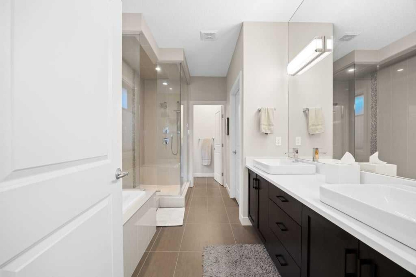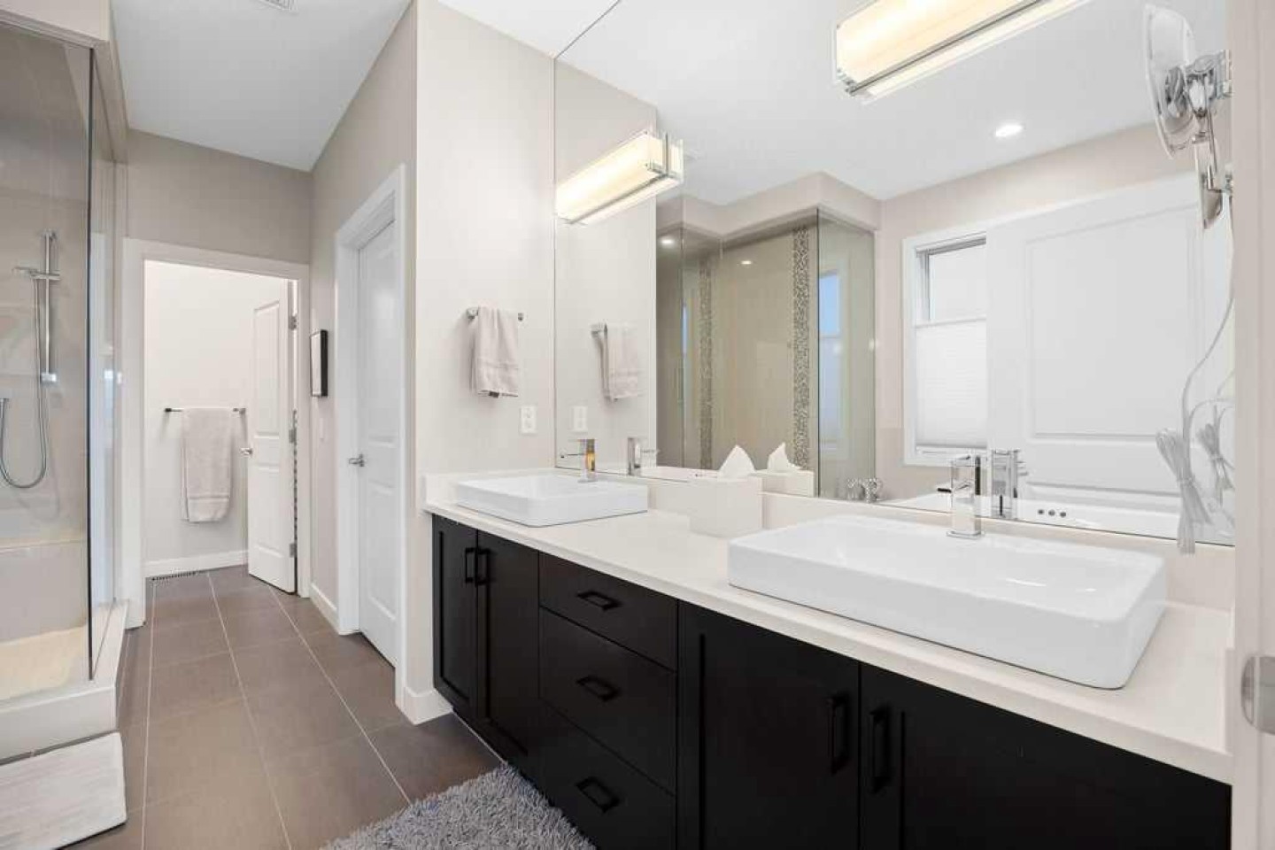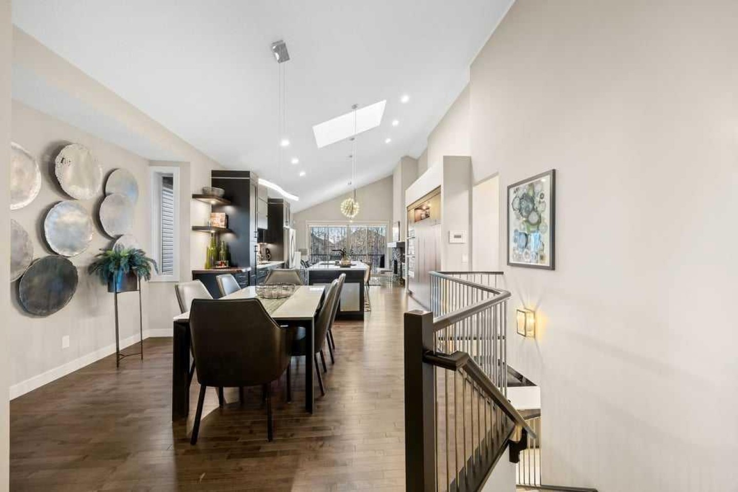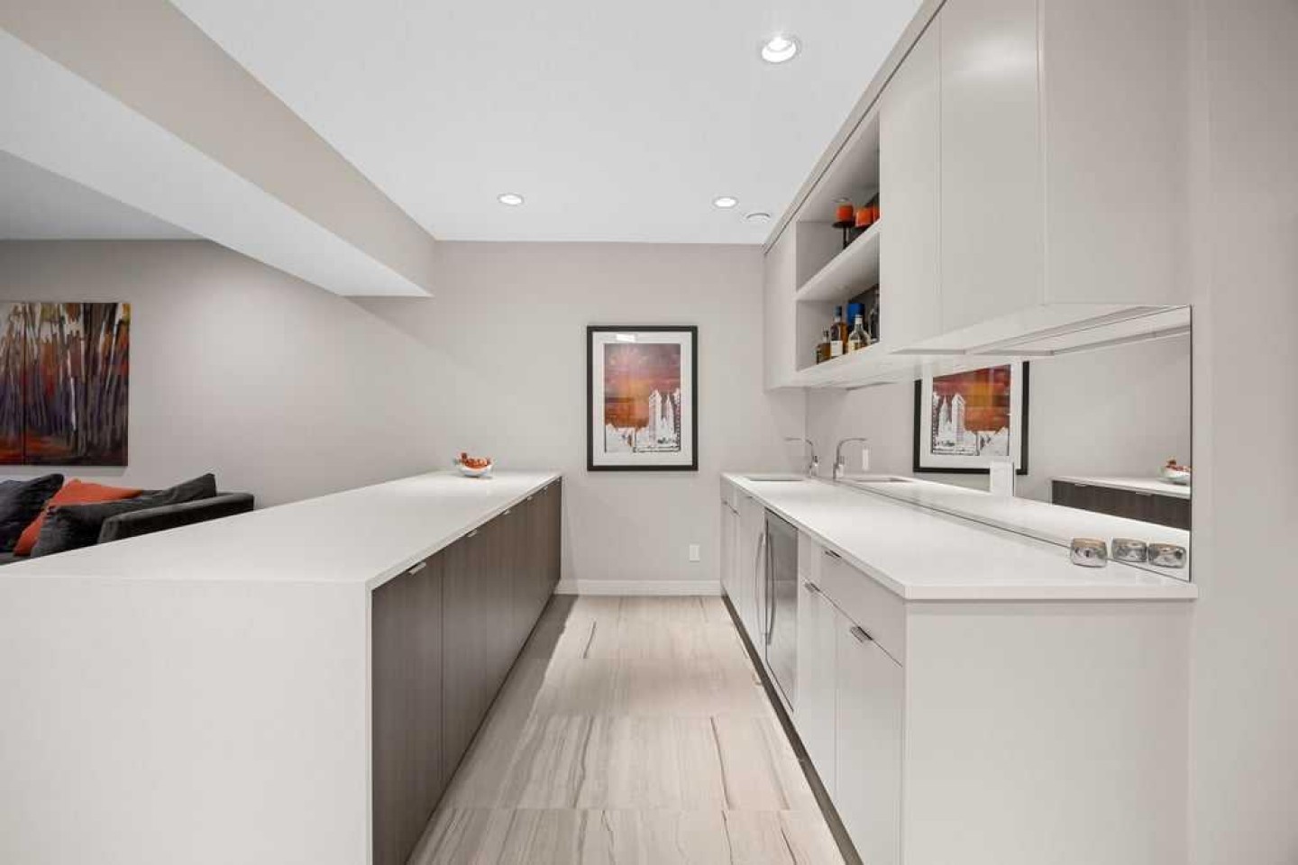 Backing onto a treed green space in Montreux and just moments from Aspen Landing, this stunning detached bungalow villa offers a rare blend of privacy, elegance, and effortless living. Part of an exclusive 30-unit bareland condominium enclave, this Trico-built home showcases quality craftsmanship and thoughtful design, with exceptional summer privacy thanks to its lush natural backdrop. Designed for both everyday comfort and refined entertaining, the main level features vaulted ceilings and a large skylight over the kitchen that fills the home with natural light, refreshed hardwood flooring, upgraded lighting throughout, and elevated finishes at every turn. The chef-inspired kitchen has been beautifully updated with new quartz countertops, a new Blanco sink, premium appliances including an induction cooktop, and seamless flow into the open living and dining areas. The main floor includes a spacious primary retreat with a luxurious 5-piece ensuite featuring a soaker tub and oversized shower, along with a second bedroom or den offering flexibility for guests or a private workspace. The mudroom is enhanced with Denca customized cabinetry, offering both style and exceptional everyday functionality. Just off the living space, a partially covered rear deck with durable Duradek surface and stairs to the backyard creates an ideal setting for outdoor living. The fully developed lower level expands the home with a generous recreation and media room centred around an electric fireplace with heater, creating a warm and inviting space to relax or entertain. The custom bar area is thoughtfully designed with a second dishwasher, wine fridge, and bar sink — perfect for hosting. Electric heated floors add comfort to the basement bathroom, laundry room, and bar area, while two additional bedrooms and a full bathroom provide excellent guest or family space. The large laundry room offers abundant storage along with a convenient laundry sink. Additional highlights include a custom-finished garage with epoxy flooring, extensive hanging storage, and a convenient hot water tap. With exterior maintenance, landscaping, and snow removal included, this residence offers a rare balance of lock-and-leave ease and elevated design — a timeless bungalow villa defined by quality craftsmanship and understated sophistication.