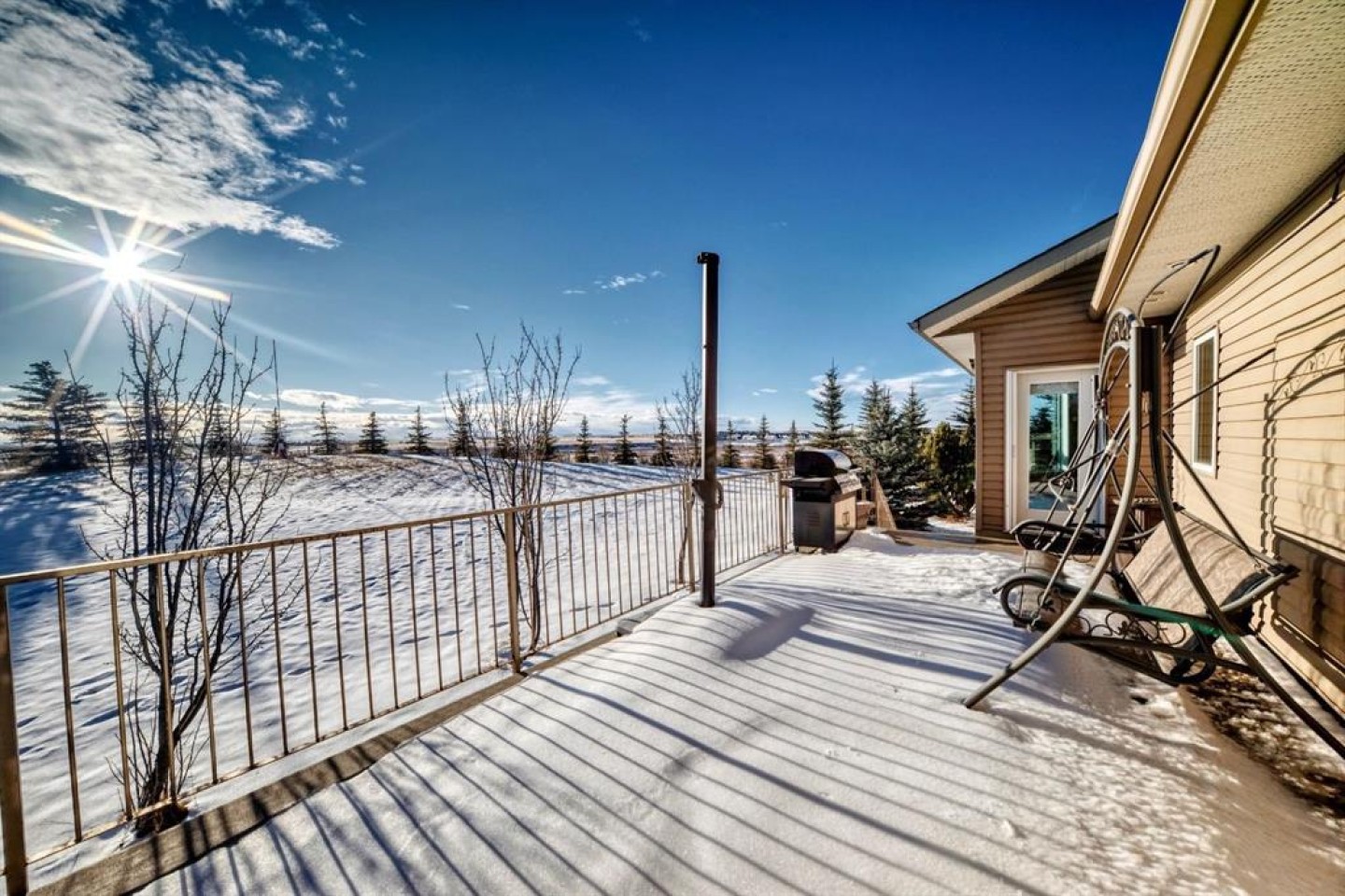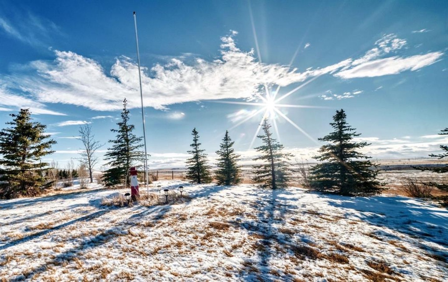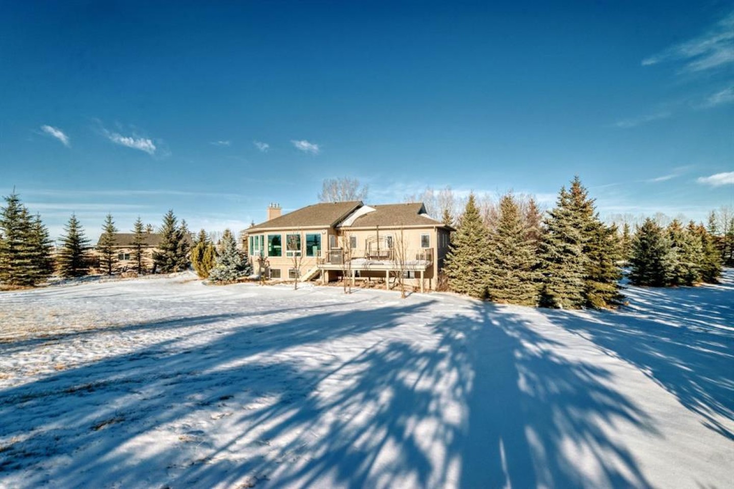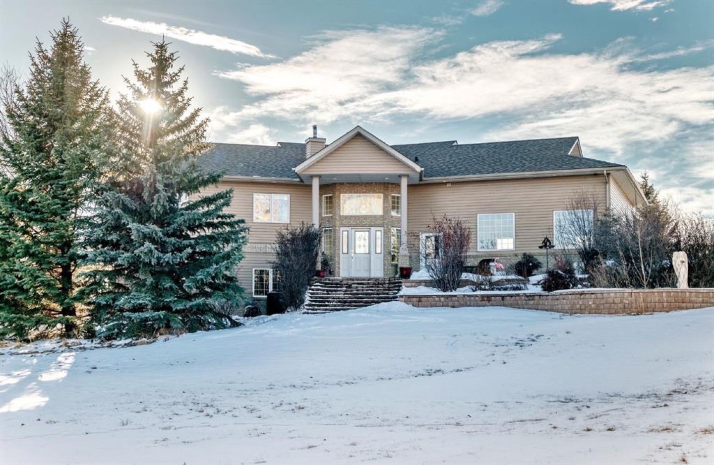 The nicest location in Sharp Hill with over 2 acres, mature trees & so much privacy! 2 heated triple garages! Welcome to this exceptional acreage retreat offering the perfect balance of privacy, luxury, & convenience—just minutes from everyday amenities. Step into the bright & welcoming foyer, highlighted by soaring vaulted ceilings and expansive windows that flood the space with natural light. Upstairs, the open-concept living, dining, & kitchen area impresses with stunning 12-foot vaulted ceilings & custom built-ins framing the cozy gas fireplace. Large windows showcase breathtaking views of mature trees, the distant Rocky Mountains, & create a warm, inviting atmosphere throughout. Just off the kitchen, step out onto the patio to enjoy spectacular sunset views. The spacious primary bedroom features a 4-piece ensuite with double sinks, a large shower, & a separate walk-in closet. Unique ceiling lighting adds an elegant ambiance. 2 additional bedrooms upstairs also feature stylish ceiling lighting, while the conveniently located main floor laundry room offers ample cabinetry. The basement boasts 9-foot ceilings, 4 additional bedrooms, and a full bathroom—ideal for larger families or multi-generational living. The expansive recreation room includes oversized windows, a wet bar, & a 2nd fireplace with custom built-ins. The walkout sliding door accesses a beautiful large concrete patio to sit among the trees. There’s also a generous storage room & an under-the-stairs playroom—perfect for kids or additional storage. Car or hobby enthusiasts will appreciate the attached triple oversized garage with 14-foot ceilings to accommodate a lift, including one 11-foot high door. This heated & drywalled space also features upper storage, a closet, man door access, & rough-in plumbing for a sink. In addition, a newer 2nd detached triple garage is powered, heated, & drywalled. Surrounded by mature trees, this private property feels like your own personal park. A picturesque gazebo sits beside the pond, which transforms into a skating rink in winter, complete with power & water access. On the back side of the home, enjoy cozy evenings gathered around the fire pit area. The yard offers both mountain & glimpses of downtown Calgary in the distance—an incredible backdrop for everyday living. The paved driveway is beautifully illuminated by classic lamp posts, creating a stunning approach to the home. All of this, just 5 minutes from Costco, CrossIron Mall, & all amenities in Airdrie Upgrades include high-end Graber blinds throughout (with electric blinds in the main living area), phantom screens, garburator, new plumbing, newer carpets, a 4-zone ultra high-efficiency furnace, water softener, two hot water tanks A rare opportunity to own a luxurious, private acreage with unbeatable access to both nature & city convenience.