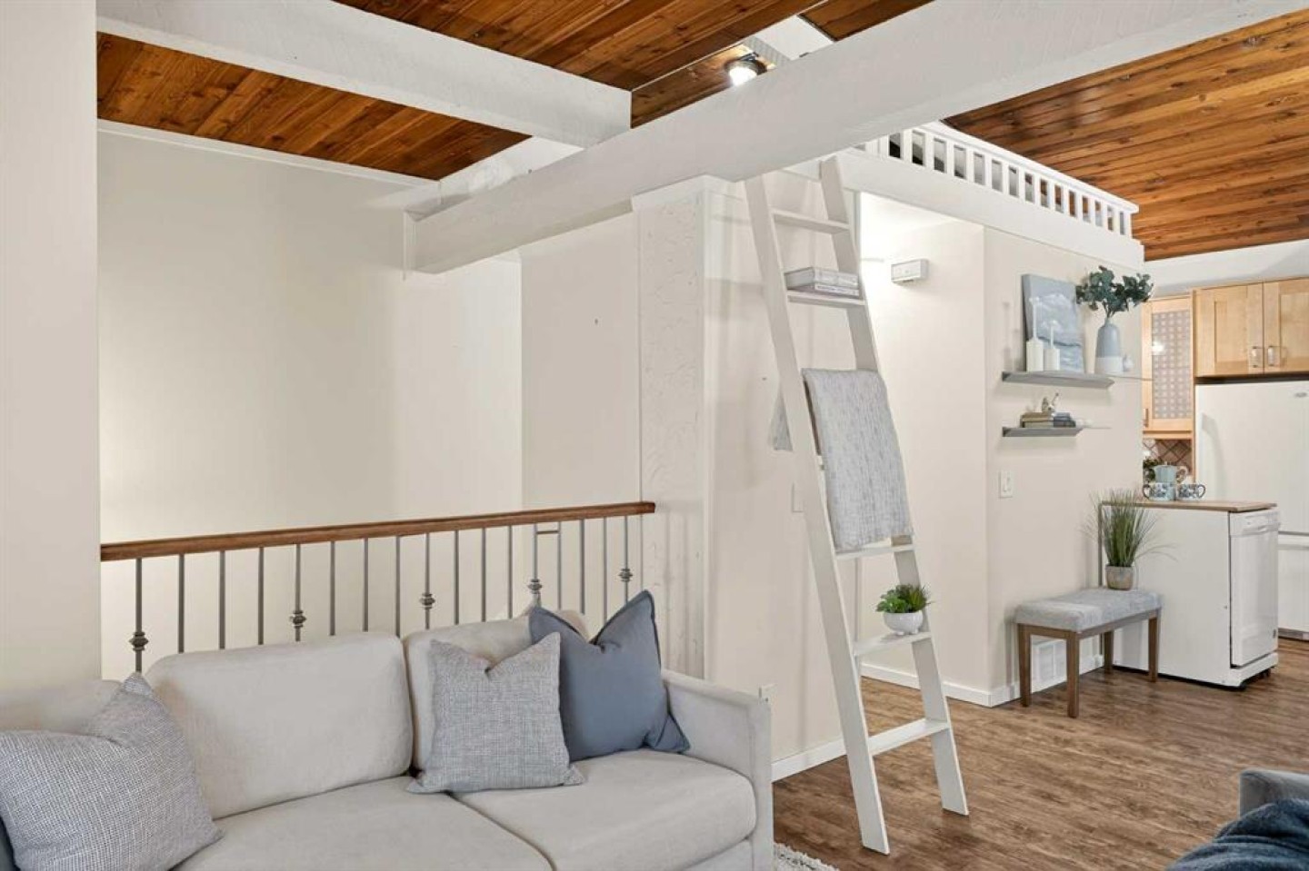 **Open House Saturday March 14** Tucked into a quiet corner of the complex and fronting a peaceful street, this UPDATED COTTAGE-CHIC townhouse feels like a little escape — the kind of place you’d hope to stumble upon for a weekend in the woods — yet it’s right here in the city. And best of all? It’s not your typical cut-and-paste condo. This home has soul. Upstairs, WOOD-BEAMED VAULTED CEILINGS wrap the main living space in warmth and character, creating a cozy, open setting where the living, dining, and kitchen gather naturally under one inviting roofline. It’s intimate without feeling tight — perfect for slow mornings with coffee, easy dinners with friends, and unhurried evenings curled up by the fireplace. The charmingly RENOVATED KITCHEN feels collected rather than cookie-cutter, blending thoughtful updates with cottage personality. And tucked above it all, a SWEET HIDEAWAY LOFT offers that rare bonus space — a secret nook for streaming, reading, overnight guests, or simply disappearing for a quiet moment. Downstairs, BOTH BEDROOMS are gently snuggled away, creating a calm and private retreat from the main living space. A clever bathroom and convenient laundry keep daily life simple and functional, while the thoughtful layout gives you that natural separation between gathering upstairs and resting below. This location delivers a sense of calm AND places you just steps from shopping, restaurants, cafés, and transit. Whether it’s a quick grocery run, dinner out, or an easy commute, everything you need is within walking distance, making day-to-day life effortless and connected. If you’ve been waiting for something with heart — something that feels curated, cozy, and one-of-a-kind — this is it. Be sure to check out the video and virtual tour and call your favourite Realtor to book a showing today!