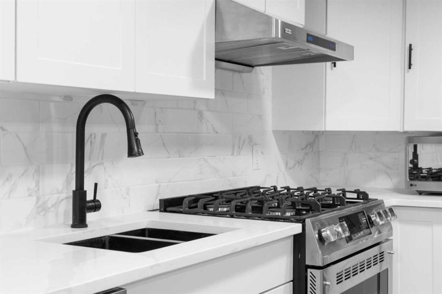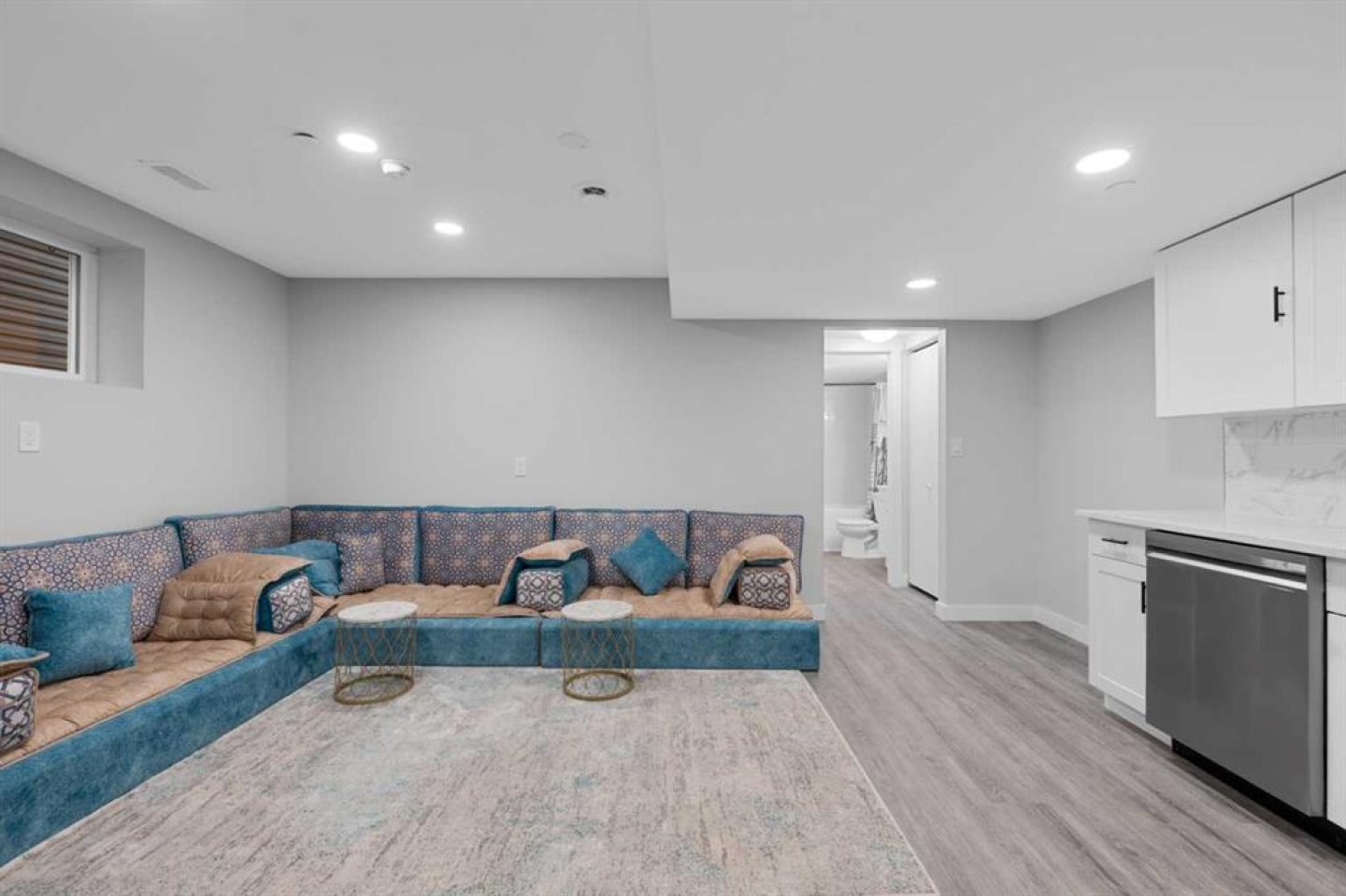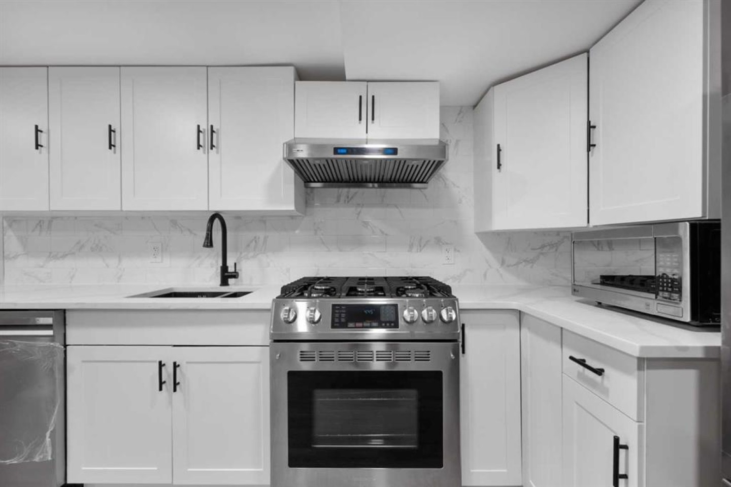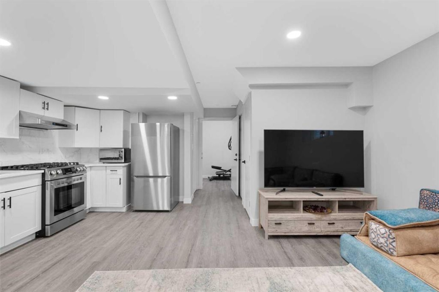 Basement appliances - Gas range, hood fan, dishwasher, microwave, refrigerator, washer, dryer,
