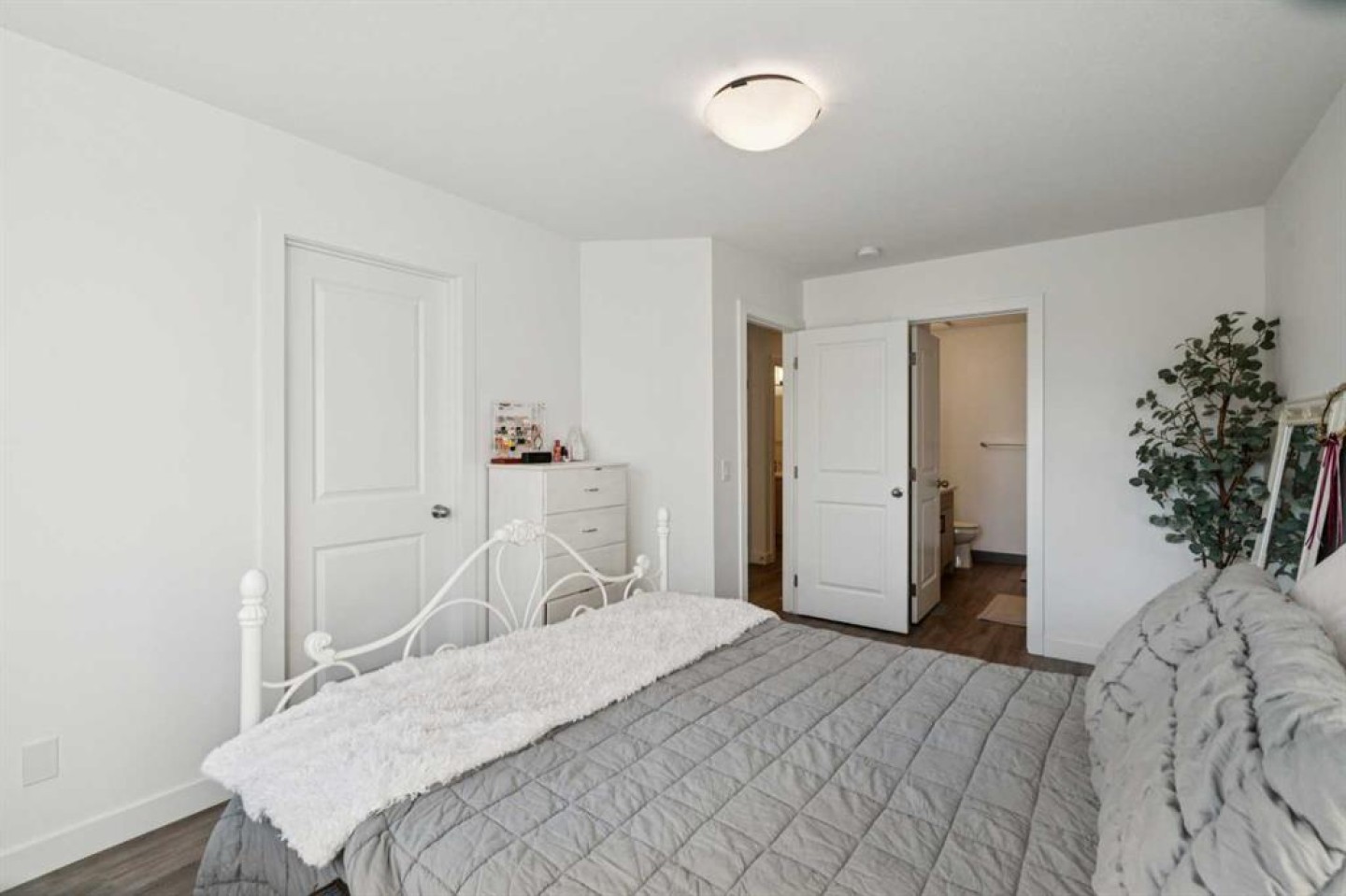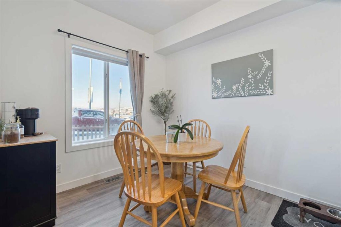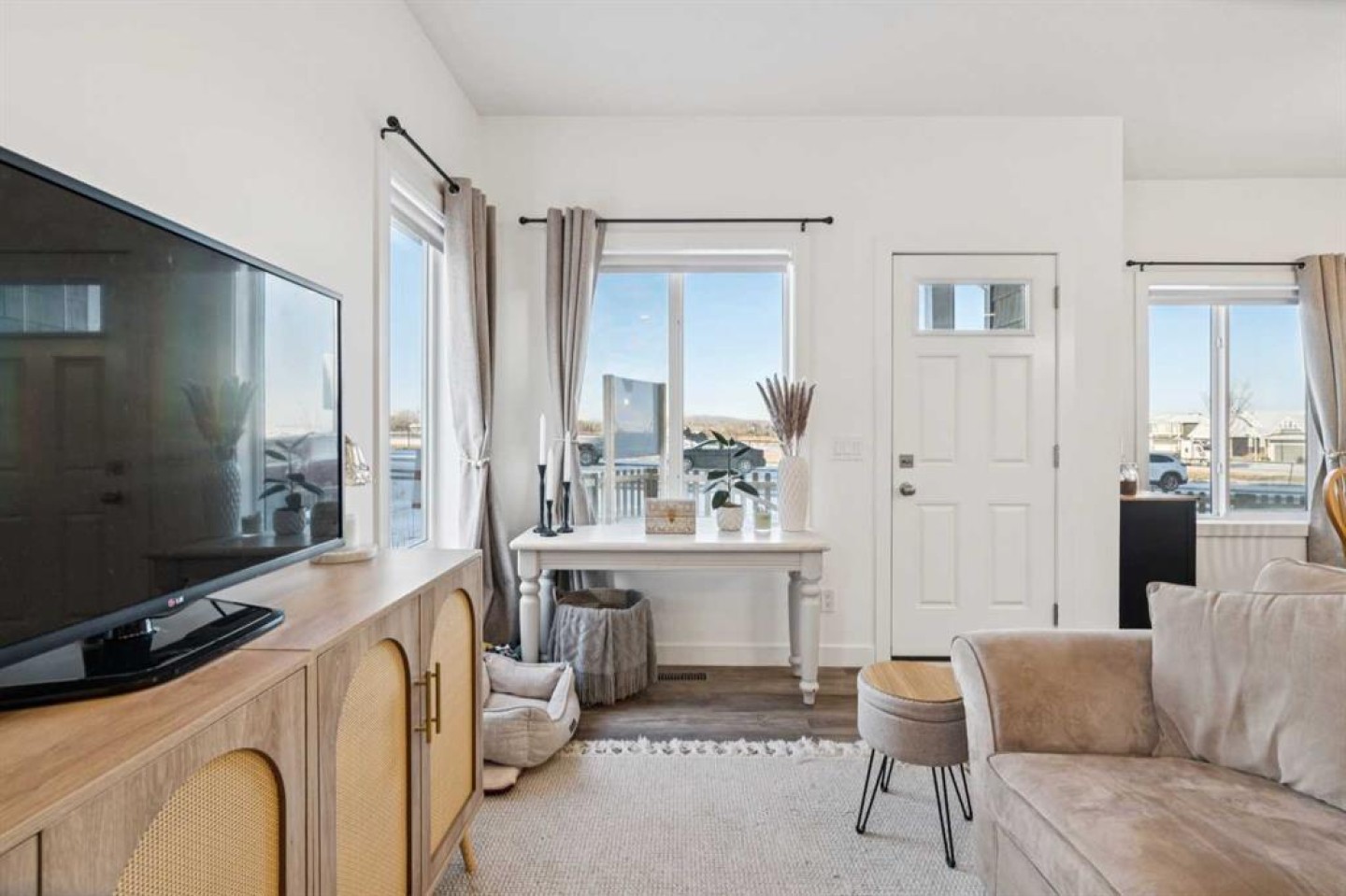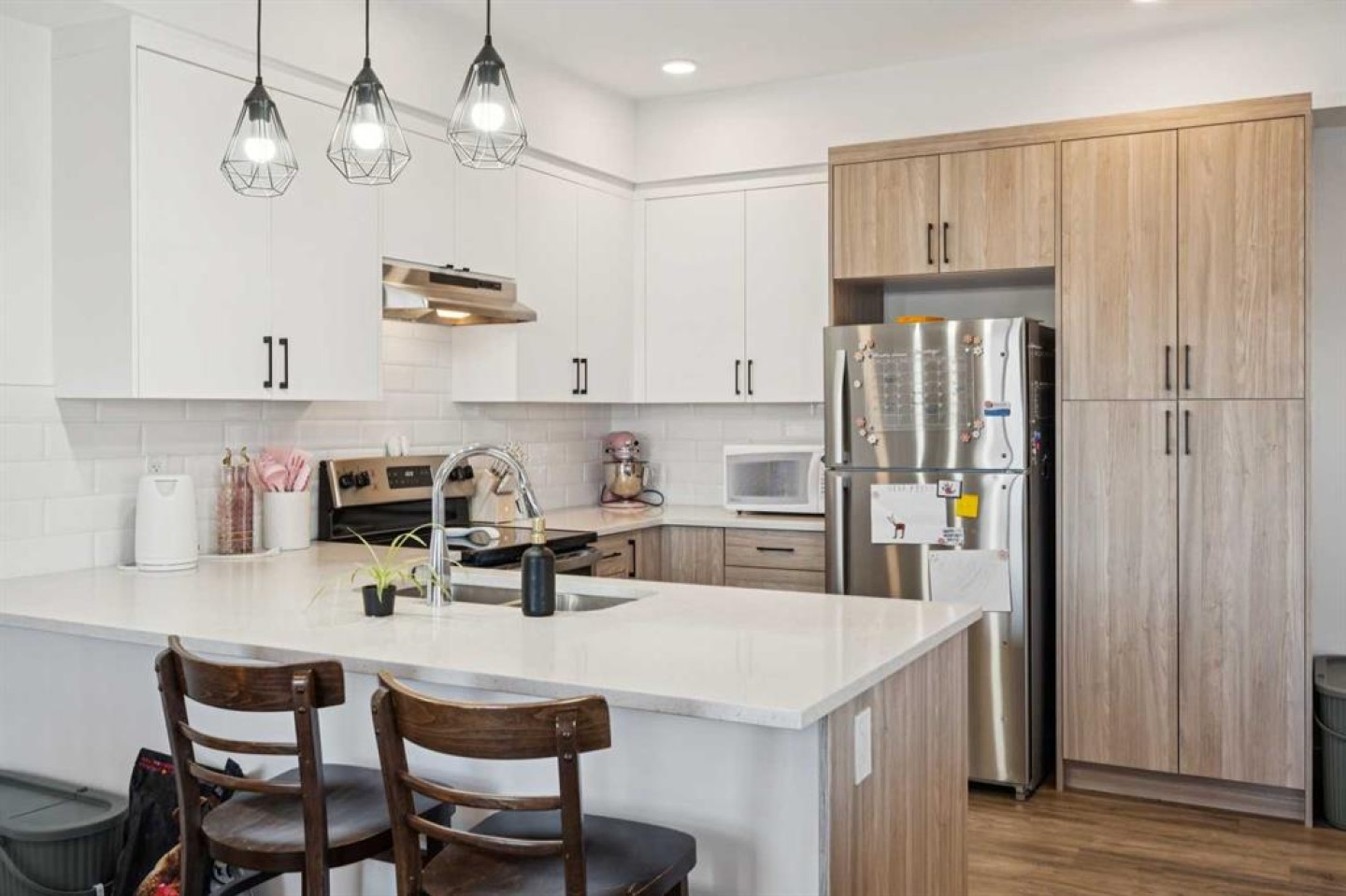 Discover the charm of contemporary living in this thoughtfully designed townhome. Filled with natural light from ample windows, the open-concept layout spans three inviting levels and offers beautiful mountain views. The stylish kitchen includes sophisticated cabinetry, quartz counters, a generous island, and stainless steel appliances. Offering 3 bedrooms, 2.5 baths. This home provides flexible living spaces. The primary bedroom boasts ample storage and direct access to the ensuite bath featuring a luxurious deep soaker tub/shower combo. A convenient half bath on the main level enhances functionality. Features include vinyl plank floors, main-level laundry, complete blinds, a single garage, and driveway plus street parking. Enjoy nearby pathways, local shopping, and convenient access to both Calgary and mountain adventures.
