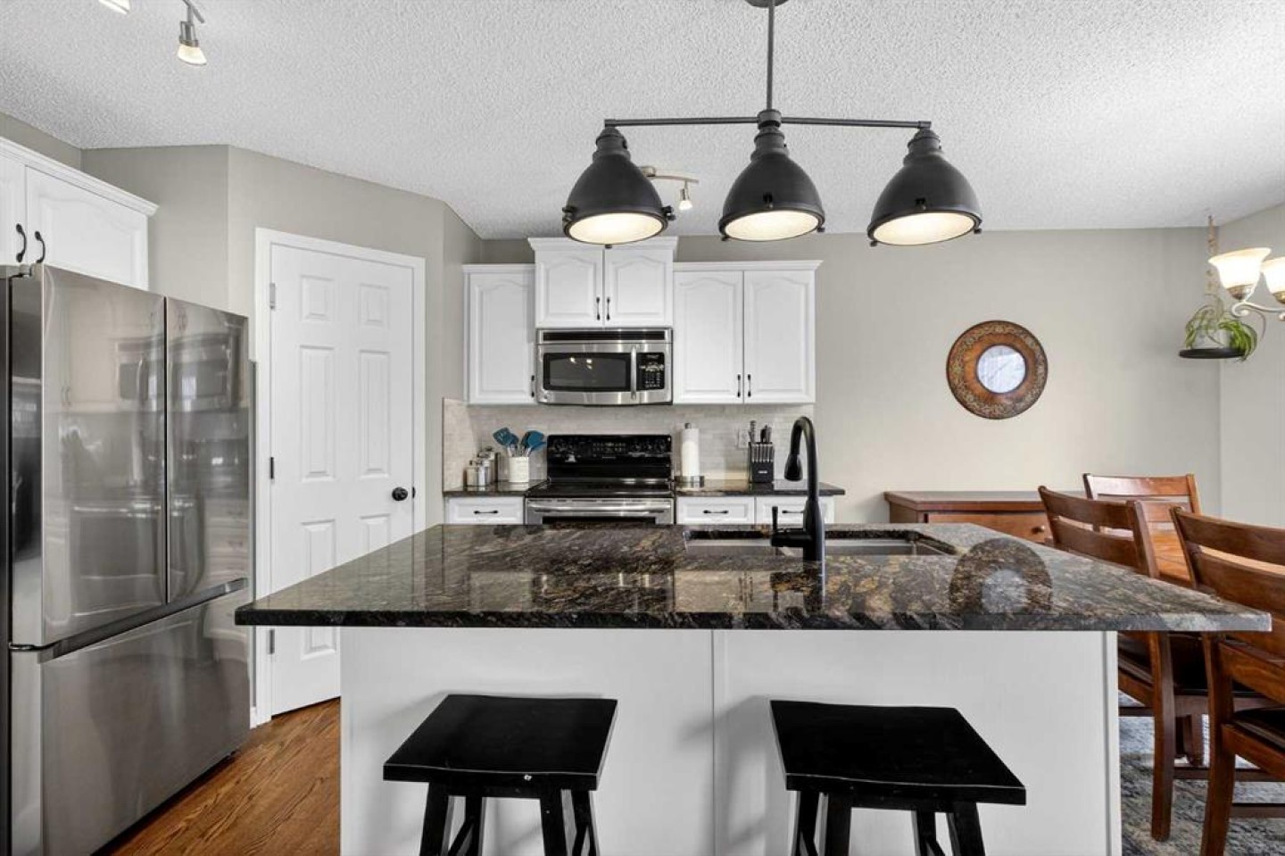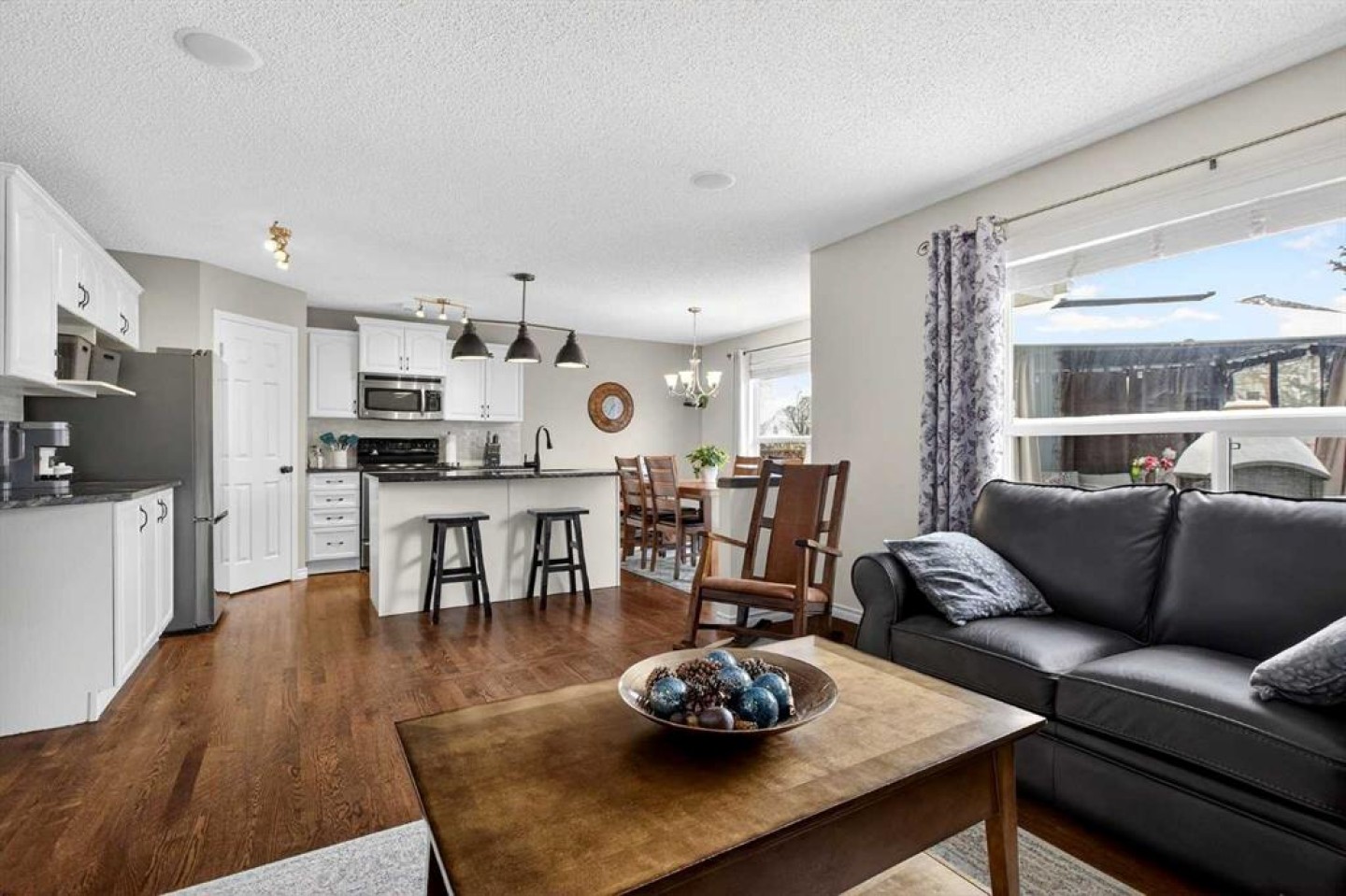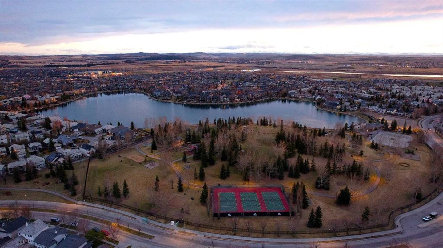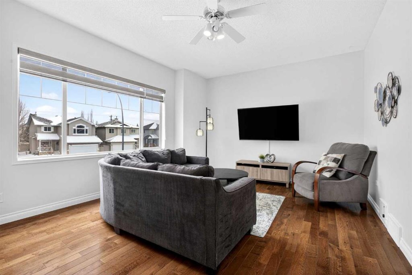This beautifully maintained original owner two-storey home offers a functional layout and thoughtful finishes throughout. Hardwood flooring extends across the main and upper levels, creating a seamless and inviting feel. The main floor features a warm and welcoming living room anchored by a corner stone-faced fireplace, a well-appointed kitchen complete with pantry, stainless steel appliances, and stone countertops, as well as a spacious dining area ideal for everyday living and entertaining. A convenient powder room and dedicated laundry/mud room add everyday practicality. Upstairs, a bright bonus room provides flexible living space, complemented by two well-sized bedrooms and a four-piece bathroom. The primary suite offers a private retreat with its own four-piece ensuite, including a relaxing soaker tub. The fully finished basement has a large carpeted recreation room, an additional bedroom, and a three-piece bathroom. Outside, enjoy the fully fenced backyard featuring a wood deck with gazebo and firepit—perfect for summer evenings. A double attached front garage and additional driveway parking complete the home. Recent updates include shingles (2025), paint throughout (2025), dishwasher (2025), HWT (2024), refrigerator (2024), furnace humidifier(2023) Residents enjoy access to exceptional community amenities including a private lake with beach, boat rentals and fishing, basketball and volleyball courts, tennis and pickleball courts, BBQ pits, fitness facilities, playgrounds, and a tobogganing hill, all within walking distance. Chaparral School and St. Sebastian are mere blocks away. With convenient access to Stoney Trail and Deerfoot Trail, commuting throughout the city is quick and easy.