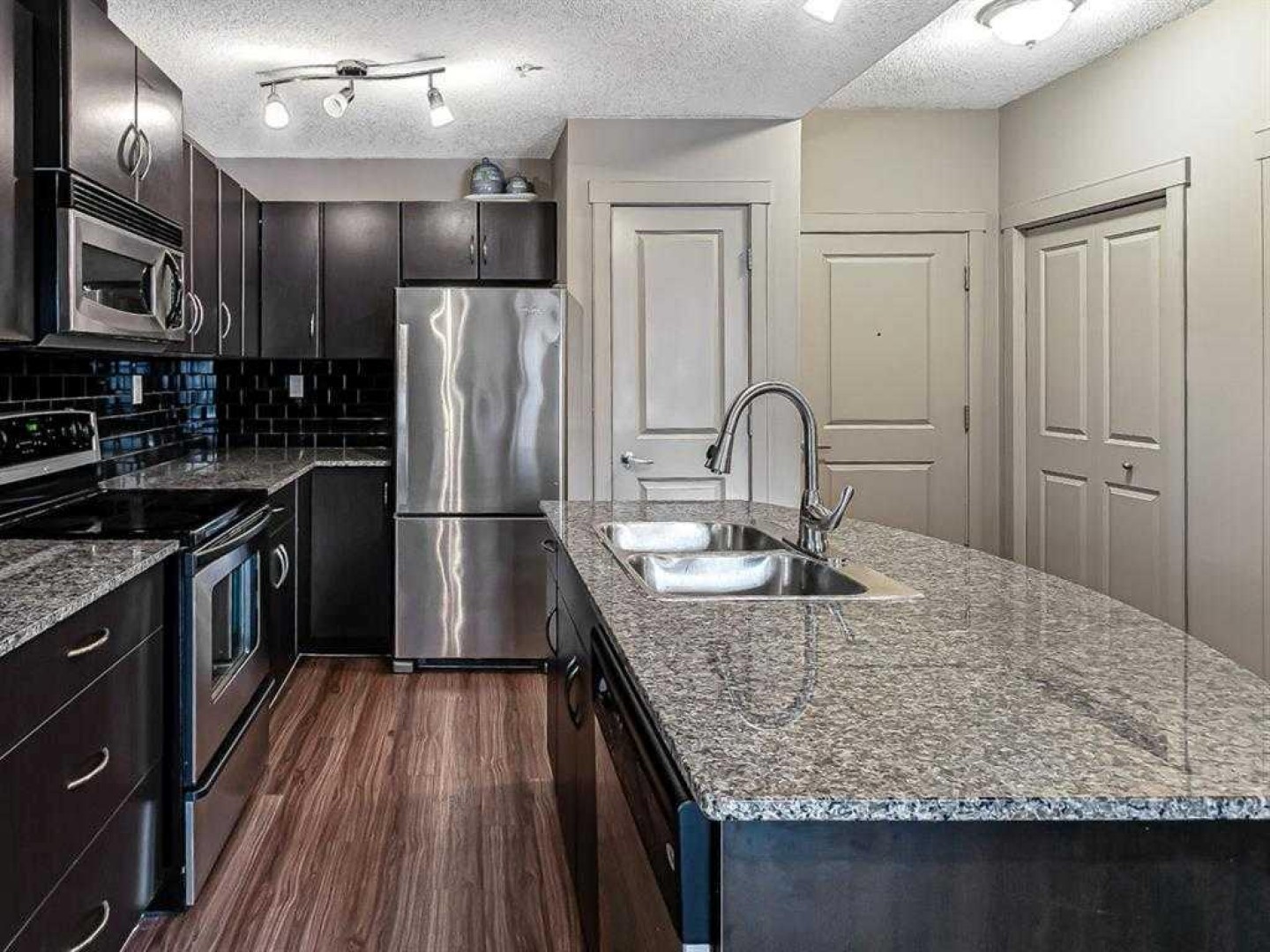 Welcome to this beautifully maintained second-floor, one-bedroom condo in the highly sought-after community of Garrison Green. Located in a quiet concrete building, this home offers excellent sound insulation and peaceful living. The unit features an open-concept layout highlighted by a modern kitchen with granite countertops, stainless steel appliances, pantry storage, laminate flooring, and impressive 9-foot ceilings. The bright and spacious bedroom overlooks the tranquil inner courtyard, while the upgraded bathroom includes a granite countertop and a full tub and shower combination. As a desirable corner unit, the home also features a generously sized private deck with bbq gas line with relaxing courtyard views, in-suite laundry, and convenient elevator access just steps from the titled underground parking stall. For added ease, the garbage and recycling room, along with the loading dock for simple move-ins and move-outs, are located just down the hall. Residents enjoy a fantastic selection of amenities designed to enhance everyday living, including a well-equipped fitness centre, an entertaining and party room, two guest suites for visiting family and friends, heated underground visitor parking, secure bike storage, a library, professional onsite management, and a beautifully landscaped central courtyard. Reasonable condo fees provide excellent value by including all utilities except internet. The surrounding neighbourhood offers picturesque tree-lined streets, parks, and green spaces and is within walking distance to Mount Royal University. Commuting is convenient with quick access to Glenmore Trail, Crowchild Trail, and Stoney Trail. Shopping, dining, and entertainment are just minutes away at Chinook Centre and Westhills Towne Centre. This exceptional condo offers the perfect balance of comfort, convenience, and vibrant community living. Pet Policy: One pet per home with a maximum weight of 50 lbs. Schedule your private viewing today!