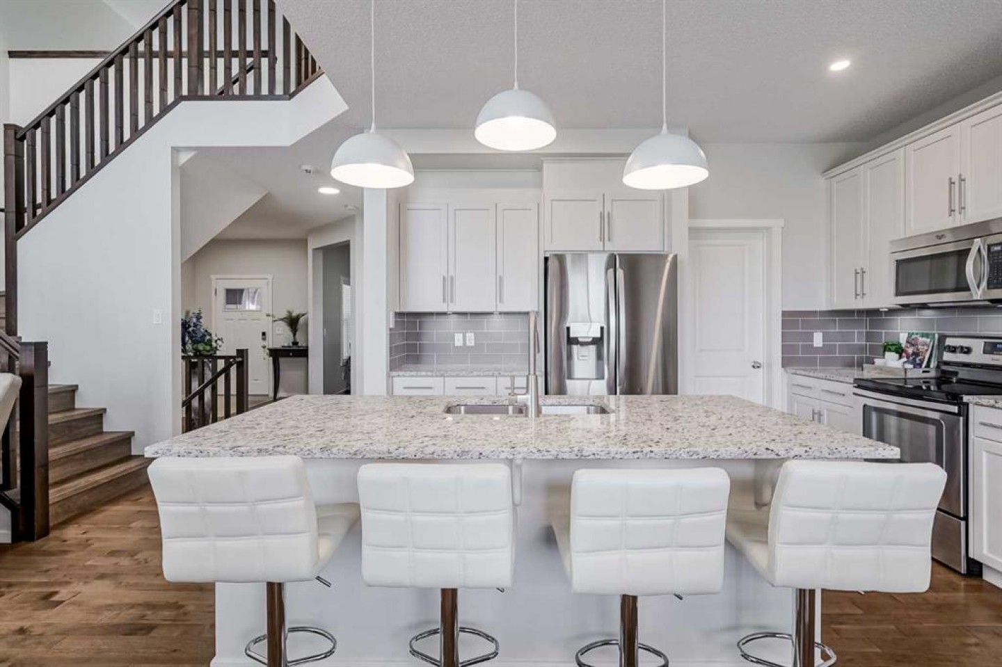 Imagine starting your mornings with coffee on a large WEST-FACING deck, overlooking a peaceful pond and lush greenspace. Welcome to 225 Kingsmere Cove — a home where everyday life feels just a little more special. Perfectly set in the friendly, family-focused community of King’s Heights, this 4-bedroom, 3.5-bathroom WALK-OUT home delivers the space, style, and setting your family deserves. Inside, 15-foot open-to-below ceilings flood the living room with natural light, making it a true gathering place. Rich HARDWOOD floors add warmth, while a MAIN FLOOR OFFICE provides a quiet spot for work or study. The kitchen is refreshed with ivory-white cabinetry, GRANITE countertops, and stainless-steel appliances, and includes a spacious walk-through pantry for effortless organization. The pantry connects directly to a large mudroom — the ideal drop zone to keep jackets, boots, and everyday clutter neatly out of sight. From the dining room, sliding doors open to your oversized west-facing deck — your private front-row seat to glowing sunsets over the pond, evening barbecues with friends, and quiet mornings with coffee in the fresh air. Upstairs, NEW VINYL PLANK flooring gives the entire level a fresh, modern feel. A versatile bonus room adapts to your lifestyle — whether it becomes a home theatre, playroom, reading lounge, or fitness space. Three bedrooms provide space for everyone, while the primary suite stands out as a private retreat. Overlooking the pond, it features a spa-inspired ensuite with a deep soaker tub, stand-up shower, and updated counters. A walk-in closet completes the suite, keeping everything neatly organized and within reach. The fully finished walk-out basement is a complete extension of your living space with bright windows and direct yard access. IN-FLOOR HEATING, a fourth bedroom, and a full bathroom make it perfect for guests, teens, or even a home gym. The yard is landscaped with premium turf for a lush look without the upkeep and highlighted by pear and cherry trees that add a touch of natural beauty each season. Add in a HEATED GARAGE and a NEW AIR CONDITIONING unit, and you’re set for comfort in every season. Here, every day feels a little easier — with sunsets over the pond, welcoming streets, and a home built for both comfort and connection.