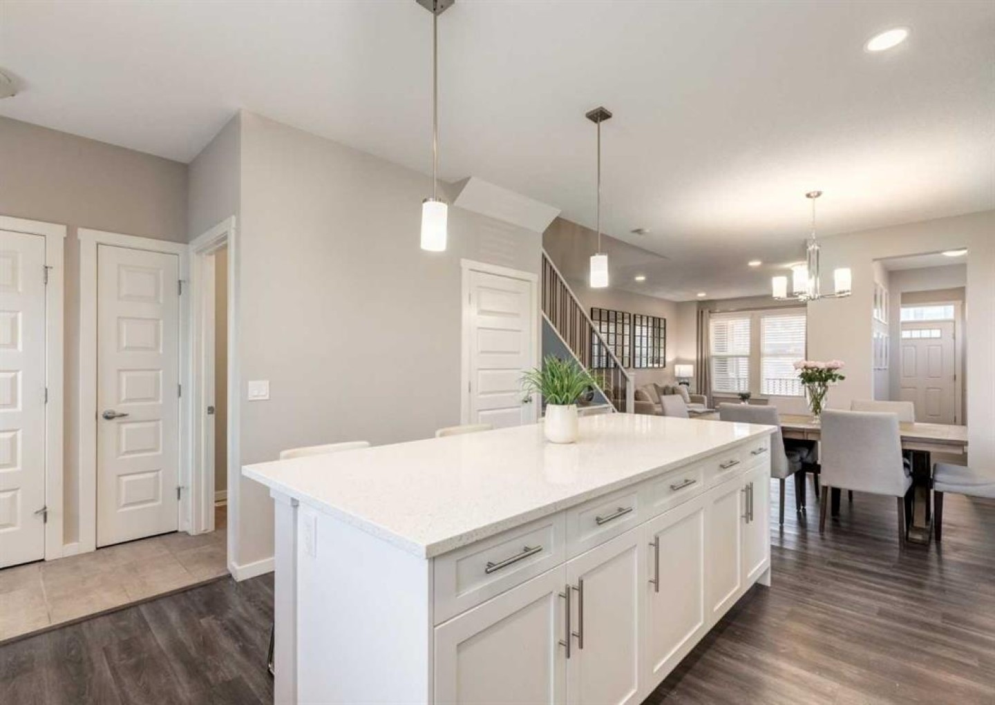 Welcome to this beautifully maintained 1,700 sq ft two-storey home offering 3 bedrooms and 2 ½ bathrooms, ideally situated on a large pie-shaped lot in the family-friendly community of Legacy. The open-concept main floor is thoughtfully designed for everyday living and entertaining, featuring a chef-inspired kitchen with a large center island topped with stone countertops, seating for several bar stools, stainless steel appliances, 42" upper cabinets, and generous counter space, all flowing seamlessly into a spacious dining area that easily accommodates a full-size table for hosting family and friends. The inviting living room is anchored by a stylish electric fireplace, while a versatile flex space offers the perfect setup for a home office, study nook, or craft room. A convenient 2-piece powder room & large mud room completes the level. Upstairs, you’ll find three well-sized bedrooms including a primary retreat with a walk-in closet and luxurious 5-piece ensuite, along with a 4-piece main bath and upper-level laundry with stacked washer and dryer. The unfinished basement provides excellent potential for future development with two large windows and a bathroom rough-in already in place, and central air conditioning ensures maximum comfort throughout the summer months. Outside, enjoy the expansive backyard with a concrete patio, a double detached garage, and an oversized parking pad ideal for extra vehicles or RV storage, all just steps from schools, parks, pathways, and the growing selection of shops and restaurants that make this community such a sought-after place to call home.
