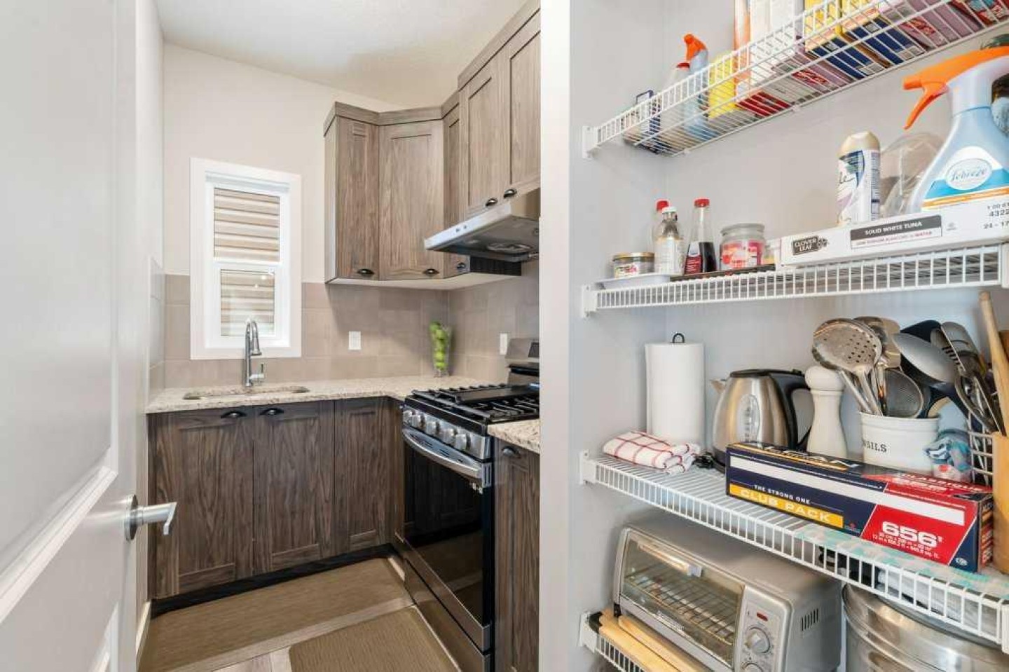 Hood fan in spice kitchen, Blinds