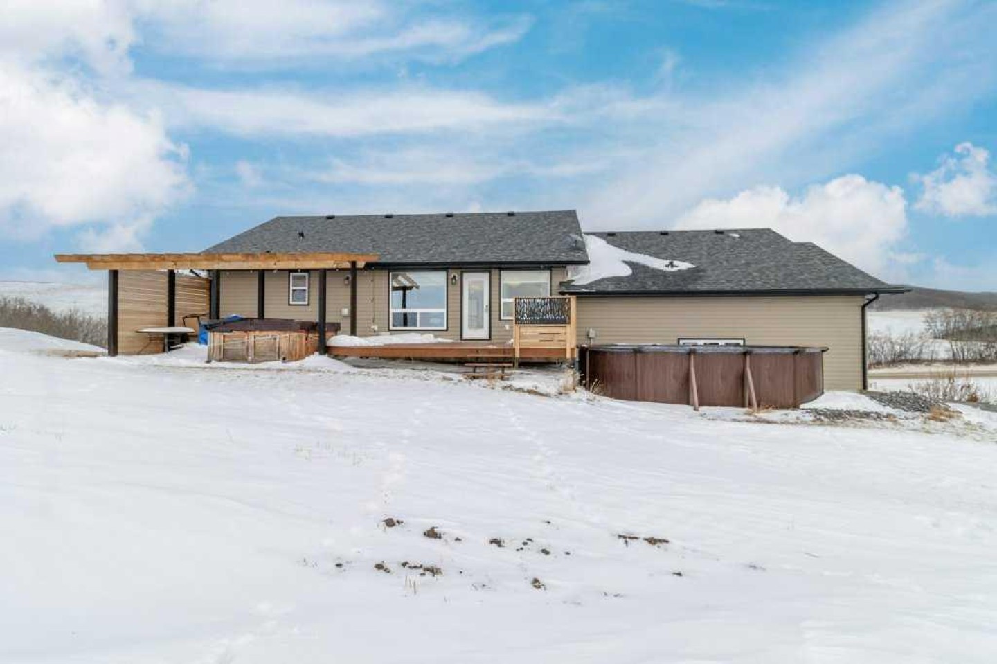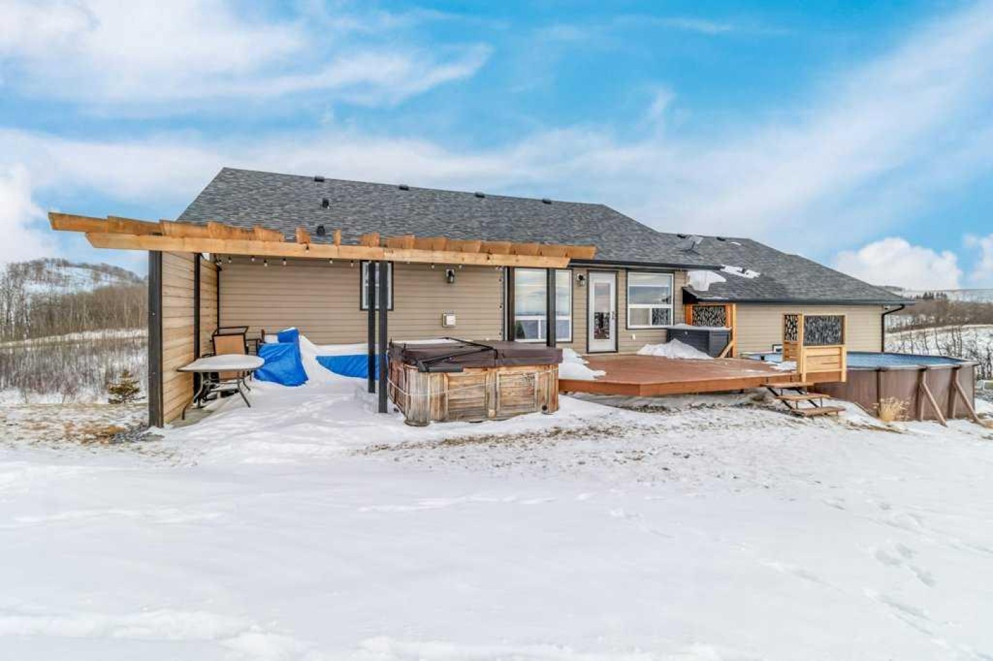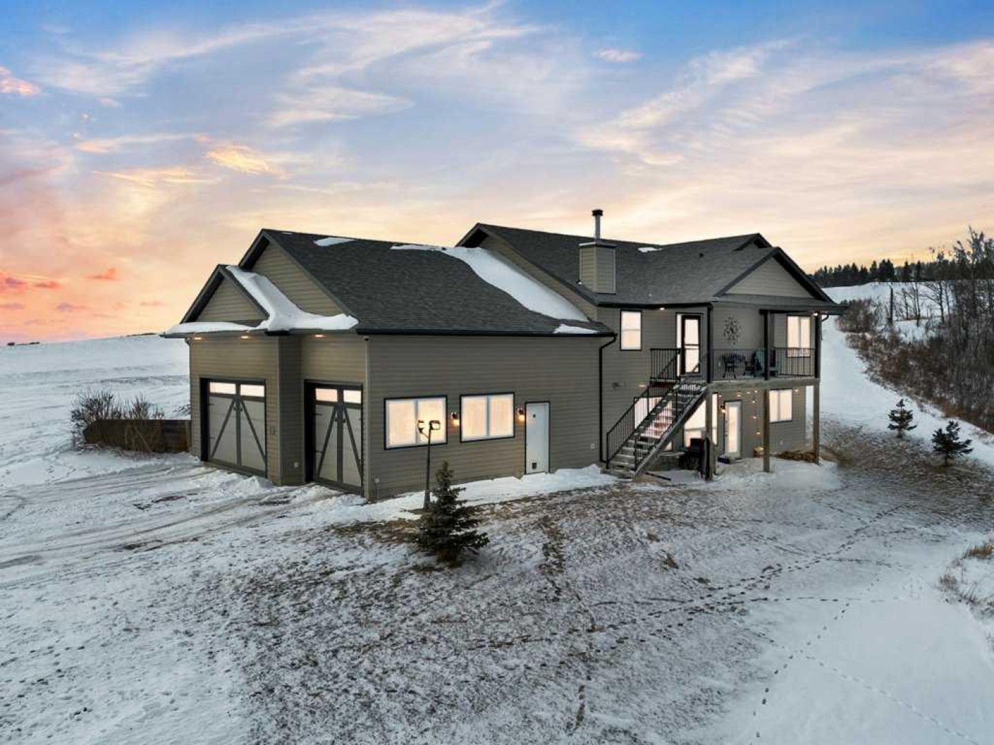 Hillside Bungalow on 3.68 private acres is just 10 minutes from Red Deer. This exceptional Trueline-built walk-out perfectly balances peaceful country living with convenient access to the city. Designed with quality and comfort in mind, the home welcomes you with vaulted ceilings and an open-concept main floor featuring a warm and inviting living room with a gas fireplace and stunning views of the surrounding countryside. The spacious kitchen is complete with maple cabinetry, stainless steel appliances, a gas stove, and a generous pantry, while the island features a bamboo countertop with ceramic sink, providing both style and functionality at the heart of the home. The main level hosts two bedrooms, including a primary suite with a 5-piece ensuite, a soaker tub, separate shower, and walk-in closet. A convenient laundry room and mudroom complete the main floor layout. The fully finished walk-out basement impresses with 9-foot ceilings, in-floor heating, a cozy wood-burning fireplace, and a dedicated media room. Entertain with ease in the bar area featuring a small sink and bar fridge, perfect for hosting family and friends. Guests will appreciate the comfort of a 3-piece bathroom with shower, along with additional under-stair storage and a new in 2021, on-demand water heater. The triple car garage is insulated and has under slab heat with a bonus mezzanine for extra storage. Step outside to the expansive rear deck overlooking the backyard, where you can unwind in the hot tub and take in the peaceful surroundings and beautiful views. The property is serviced by a well, tank and field system with a 2014 pressure tank, and shingles have been replaced on 2017. This remarkable acreage offers space, privacy, scenic vistas, and thoughtful upgrades throughout—an ideal place to call home.