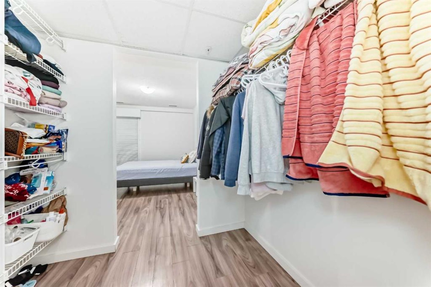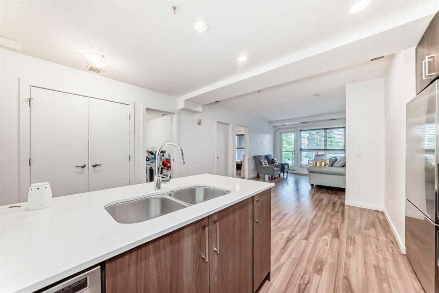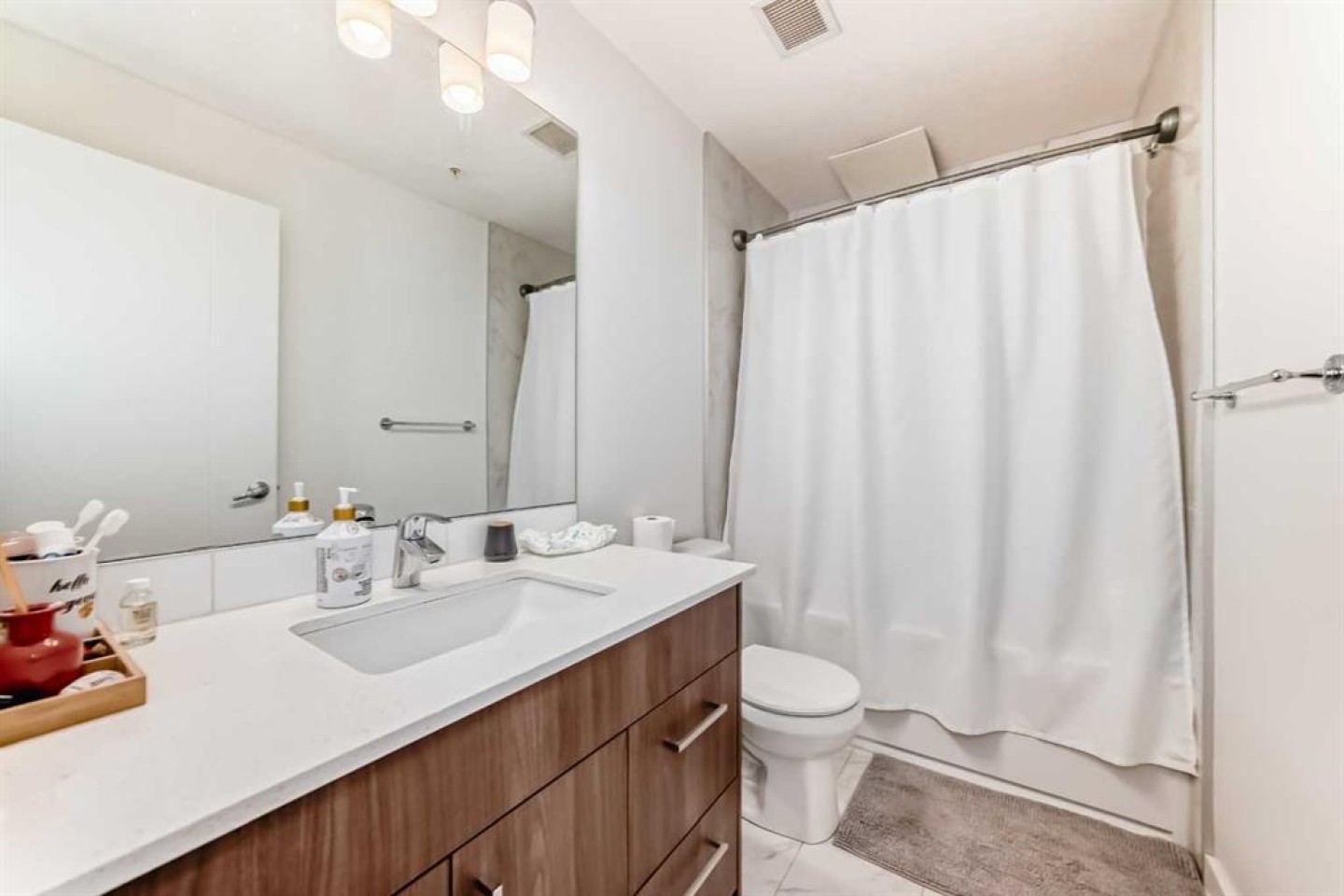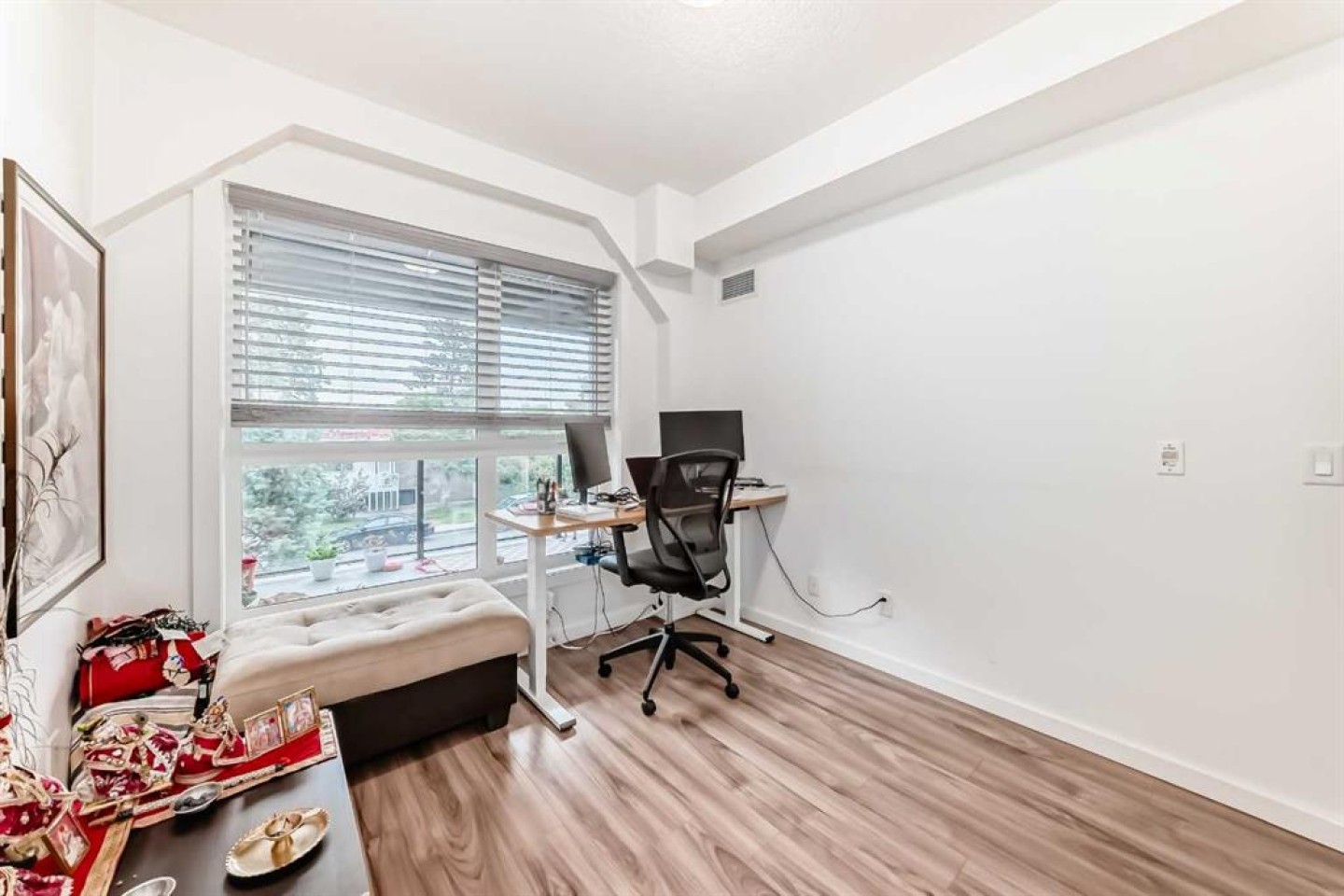 CONCRETE AND STEEL FRAME CONSTRUCTION offering superior noise reduction, reduced insurance costs, and exceptional durability. The building features high-efficiency boilers and HRV systems, with geothermal heating and cooling throughout. Equipped with Cat 5(e) wiring for advanced data and phone connectivity. This spacious 2-bedroom, 2-bathroom unit includes a den, in-suite laundry, and a titled underground parking stall. Designed with modern finishes, the interior boasts wide plank laminate flooring, bright polished white quartz countertops, and premium European-designed Fisher & Paykel appliances, including a dishwasher, induction cooktop, and convection microwave/hood fan combo. Stackable Whirlpool laundry machines are included, and the refrigerator is equipped with a microprocessor that monitors usage to extend food freshness. The primary suite features a walk-in closet and a full ensuite. Ideally located just steps from the C-Train station, shopping, and minutes from Westhills and downtown. Currently tenant occupied on a month-to-month basis—24 hours' notice required for showings.