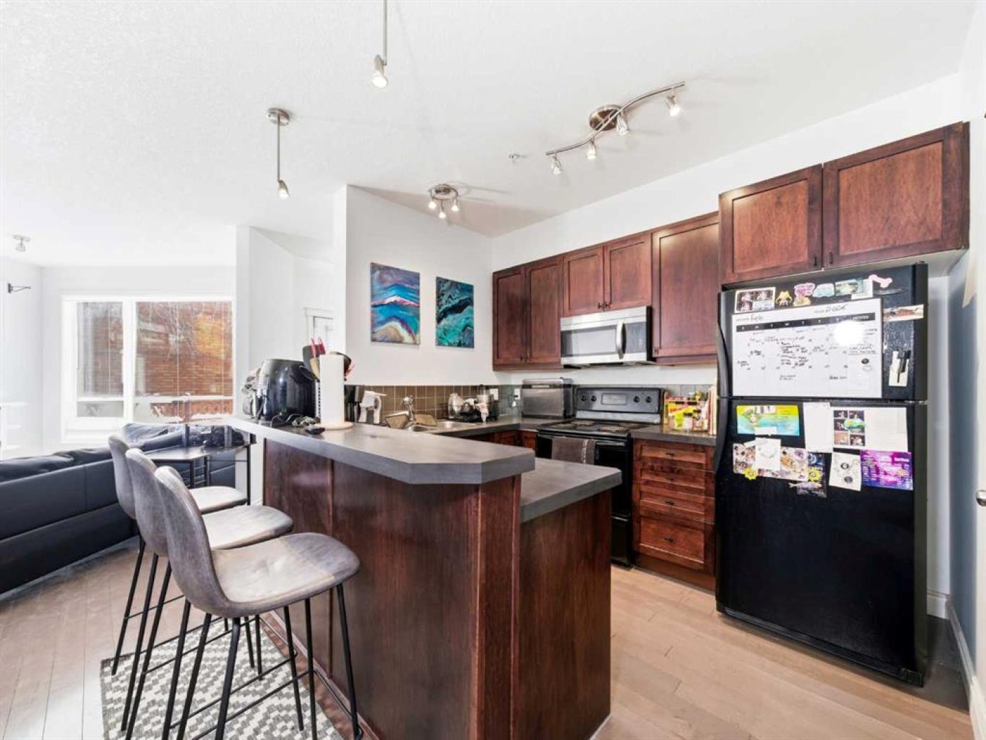 Welcome to inner-city living in the heart of Altadore, just steps from everything that makes Marda Loop one of Calgary’s most vibrant and sought-after communities: shopping, restaurants, Mount Royal, bike paths, and Sandy Beach and River Park. This well-managed 2-storey townhome offers outstanding value and the rare bonus of an OVERSIZED ATTACHED SINGLE GARAGE, giving you the privacy and convenience you won’t find in most inner-city condos. Located in the well-managed Spirit of Marda Loop 2 complex, this home is perfect for anyone looking to enter the market in a desirable community: first-time buyers, young professionals, or anyone looking to enjoy a walkable lifestyle with cafés, shops, restaurants, parks, and everyday amenities right outside their door. The building is pet-friendly (with board approval), making it an ideal option for pet owners who want inner-city convenience without compromise. Inside, the main floor features 9-FOOT CEILINGS and knockdown ceilings throughout, creating a bright, open feel. The living room is warm and inviting with a cozy GAS FIREPLACE, perfect for relaxing evenings at home. The functional kitchen includes a LARGE PANTRY for extra storage and flows nicely into the dedicated dining area, making everyday living and entertaining easy. Step outside to your private patio, ideal for summer evenings, morning coffee, or unwinding after a long day. The private entrance adds to the townhouse-style feel, offering a true sense of home rather than apartment living. Upstairs, you’ll find two generously sized bedrooms with LARGE WINDOWS that bring in beautiful natural light. The primary bedroom features a walk-in closet and a full ensuite, while the second bedroom is ideal for a guest room, home office, or roommate setup. A second full bathroom on the upper level adds everyday convenience. Additional features include a BRAND-NEW WASHER AND DRYER (2025) and a NEW HOT WATER TANK (2025), giving you peace of mind for years to come. The oversized attached single garage comfortably fits your vehicle with extra room for bikes, seasonal items, or additional storage, or even for a second small car. There is plenty of street parking nearby for guests. If you’ve been waiting for the right townhome in Marda Loop with space, parking, and true walkability, this is an opportunity you won’t want to miss. Book your private showing today.