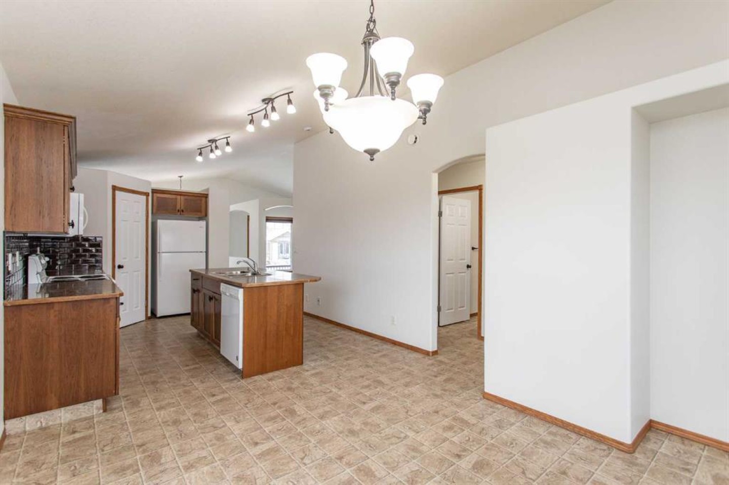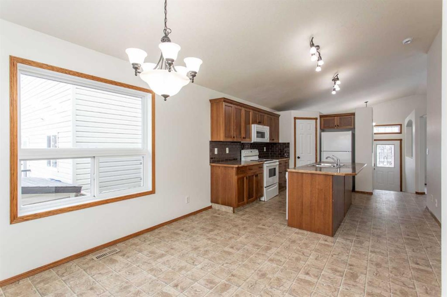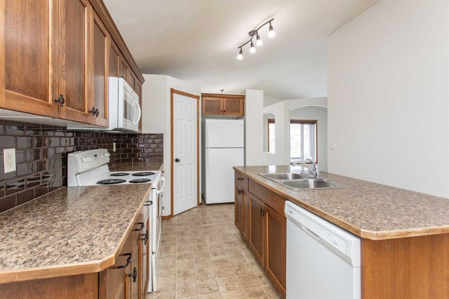 Turn the keys and make the dream of home ownership a reality. Ideal home for a first time buyer or even a retired couple looking to downsize. Walk right up and be greeted with the large covered front veranda perfect for relaxing on and enjoying a warm morning coffee or an evening beverage to unwind the day. The spacious entrance allows all your guests to come in with ease and admire the bright open design. Freshly painted main floor and brand new carpet throughout you can be the first to enjoy the upgrades just completed. Vaulted ceilings enhance the sense of space and natural light throughout. The large front sitting room is cleverly designed with a niche area perfect for media stand to allow more usable floor space for your furnishings. The generous kitchen design offers a fantastic amount of work space with plenty of counter top room, large center island, decorative sub way tile, deep corner pantry plus rich dark stained oak cabinets. A roomy dining area boasts enough room to host a dinner party or just the right amount of space for an intimate evening for two. Garden door just off the space leads to the covered back deck so you can even bbq all year round. Two bedrooms on the main floor allows for larger room sizes. Sizable Primary bedroom even has a three piece en suite with 4 ft shower plus a deep walk in closet. Head down to the partially finished basement and tap into future potential and equity builder. With a bedroom and three piece bathroom already in place why not carry on and easily finish the area that would develop perfectly into a family room with games area or the addition of an extra bedroom if needed. Large storage space for seasonal items can be incorporated into the laundry area as well. A nice deep lot allows plenty of space to build a future garage and still have yard left over to enjoy. Take a stroll anytime you want as the house sits just adjacent to the city walking trail system which takes you right to the neighborhood amenities.