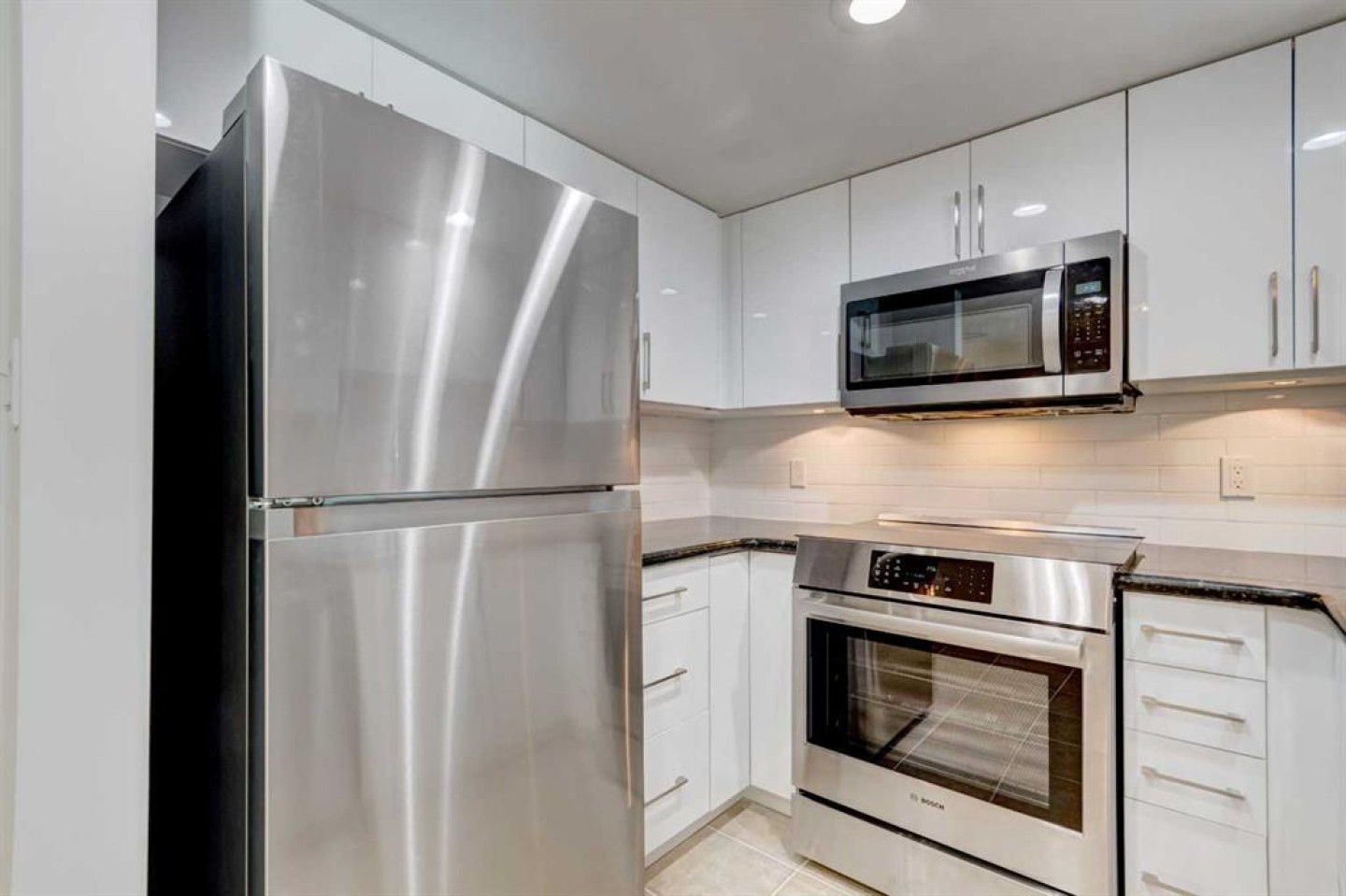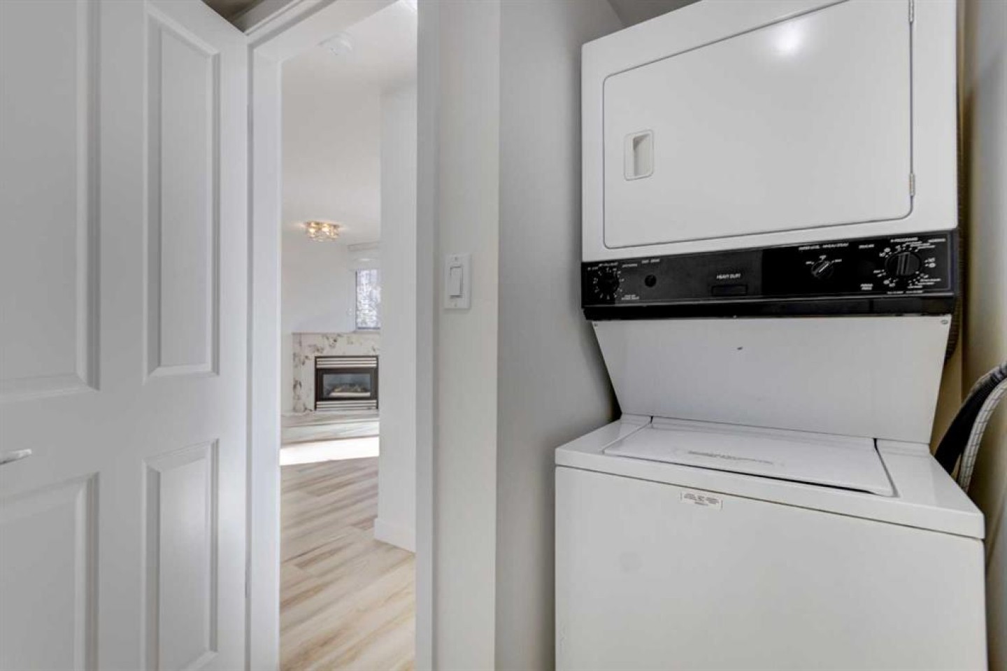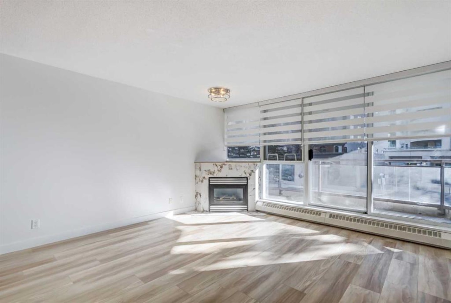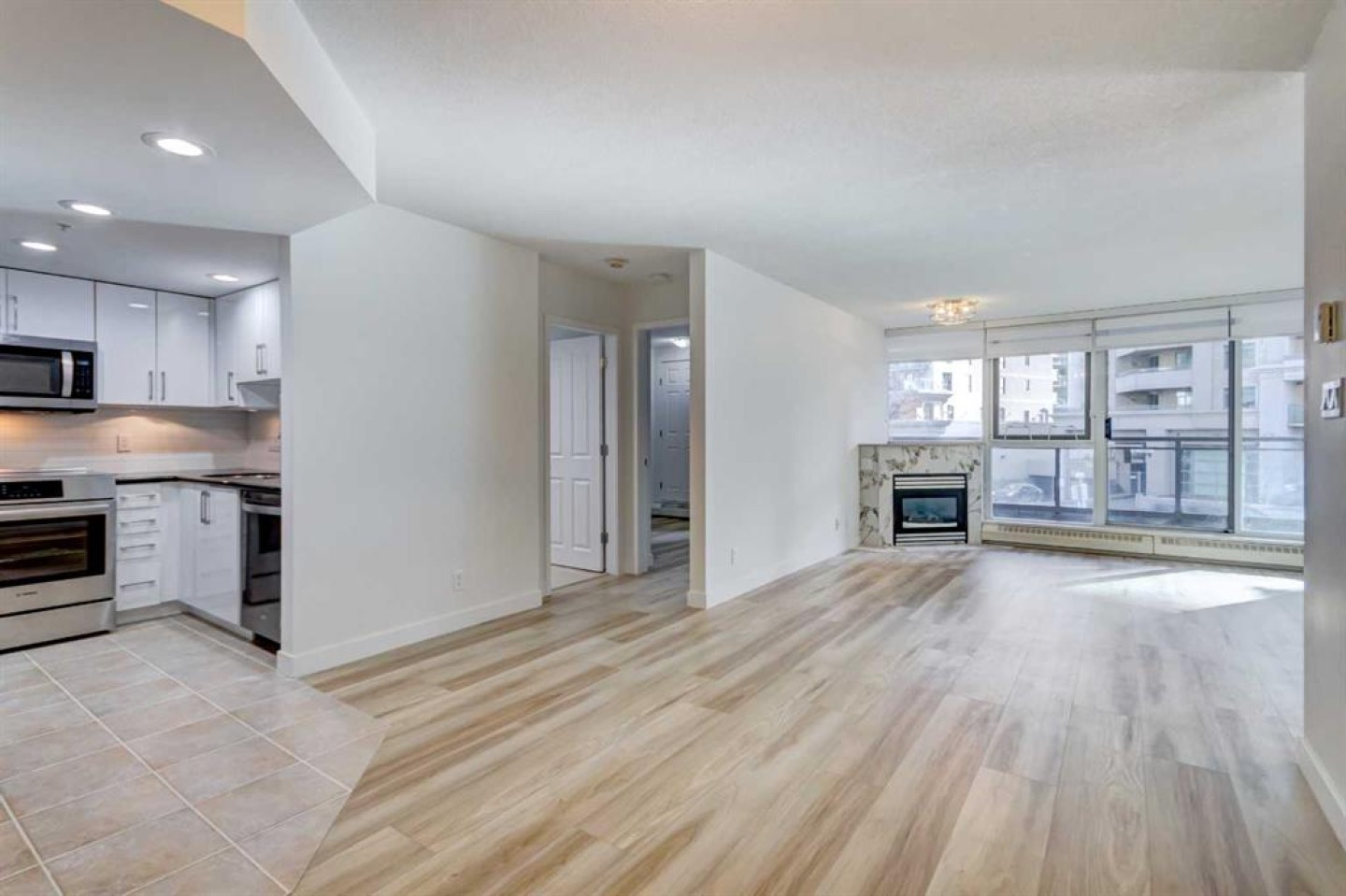 Welcome to this beautifully renovated 2-bedroom, 2-bathroom condo in The Marquis, ideally located in the desirable west end of downtown. Offering nearly 1,000 sq ft of bright, open-concept living space, this stylish unit has undergone approximately $30,000 in quality upgrades. Recent renovations include NEW stainless steel appliances (stove and fridge), newer dishwasher and microwave, NEW kitchen cabinetry and backsplash, NEW bathroom vanity and sink, NEW closet doors, NEW lighting, NEW window coverings, NEW paint throughout, and NEW durable vinyl plank flooring that complements the cozy gas fireplace perfectly. The thoughtfully designed layout is both functional and inviting. The spacious primary bedroom features a full ensuite and direct access to the private, south-facing balcony surrounded by mature trees for added privacy. The second bedroom is ideally positioned near the second full bathroom, making it perfect for guests, roommates, or a home office. Enjoy an unbeatable urban lifestyle just steps from the Bow River pathways and only a two-minutes to the C-Train within the free fare zone. Added conveniences include easy stair access to avoid elevator wait times and close proximity to the titled underground parking stall. Building amenities include a fitness center, yoga studio, social/party room, landscaped courtyard, secure bike storage, and visitor parking. Pet-friendly (with board approval). An exceptional opportunity for professionals, downsizers, or investors seeking turnkey living in a prime downtown location.