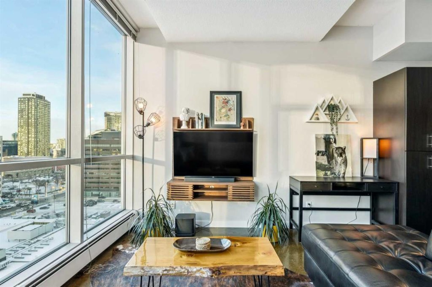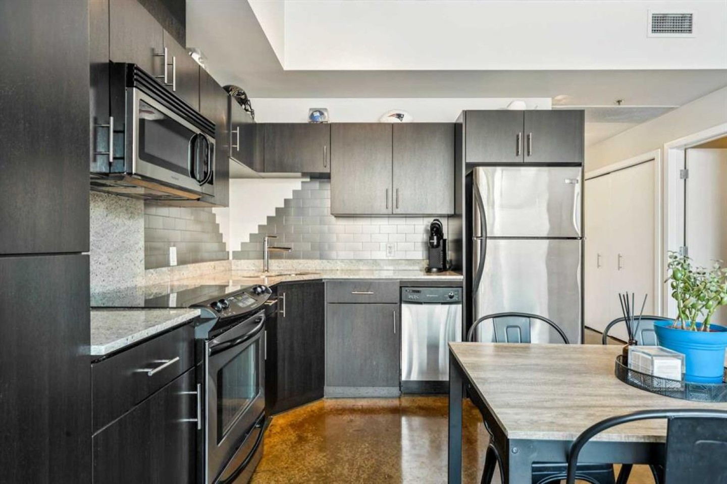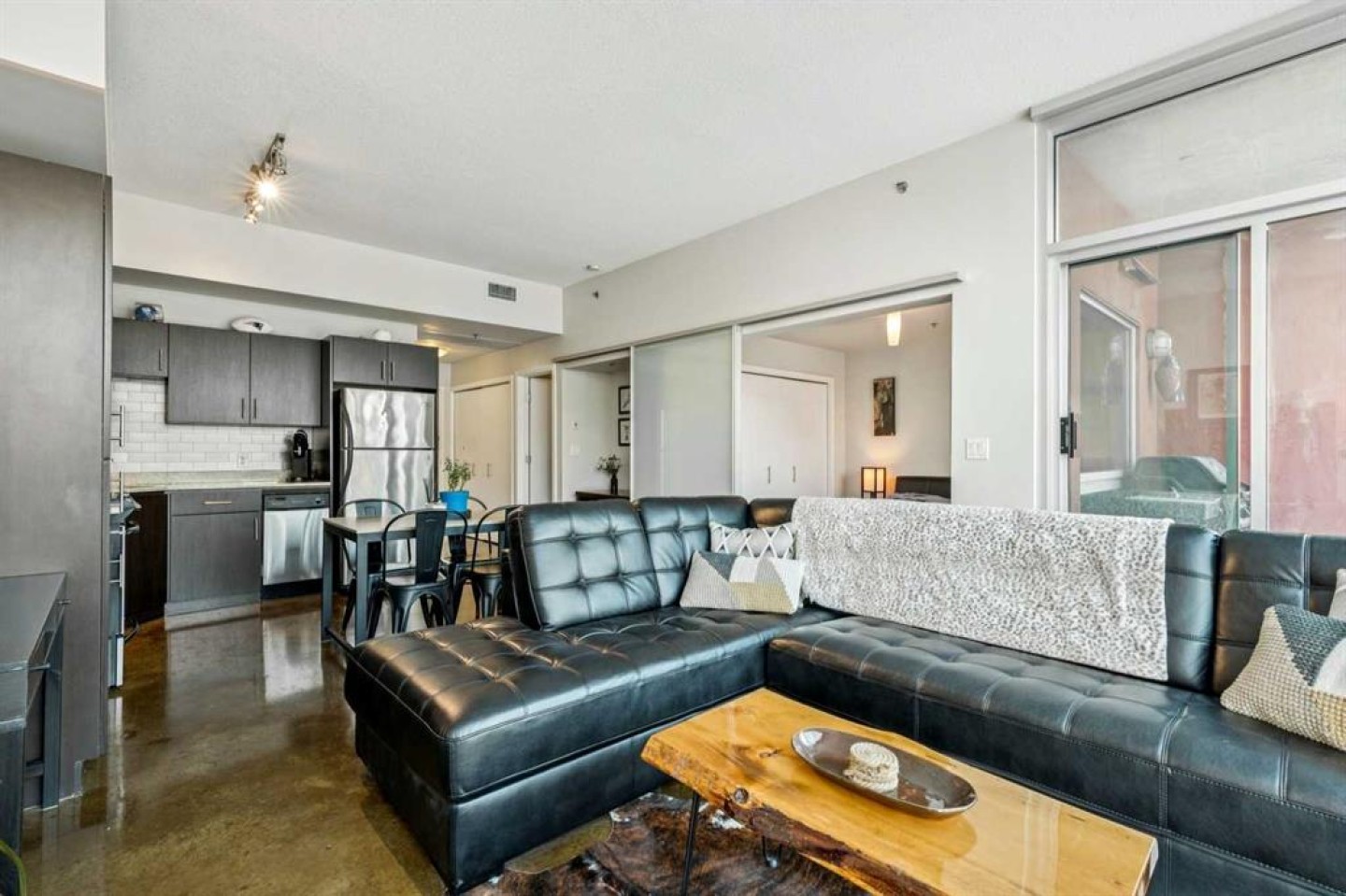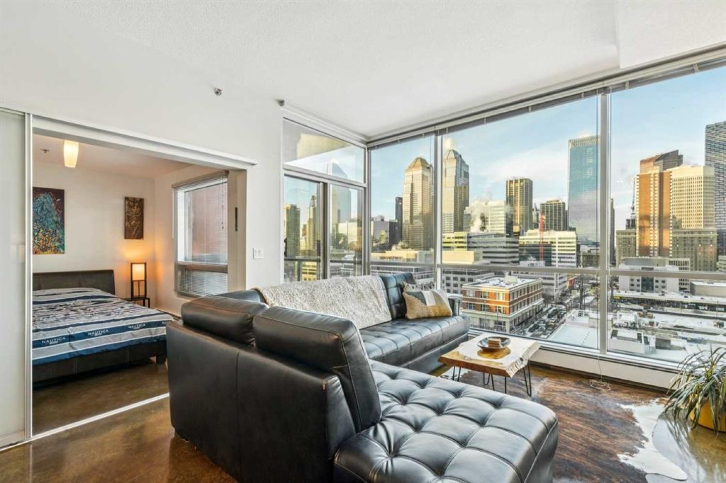 Wake up every day to postcard-worthy views of Calgary’s downtown skyline in the highly sought-after Colours building. This desirable two-bedroom floorplan showcases stunning floor-to-ceiling, north-facing windows that flood the space with natural light and frame incredible city views—an exceptional opportunity for buyers seeking both style and value. Upon entry, you’ll appreciate the polished concrete floors that add warmth and modern character throughout. The open-concept kitchen, dining and living areas offer seamless flow and flexible design possibilities for both everyday living and entertaining. The primary suite serves as a peaceful retreat with captivating downtown views, while the second bedroom easily adapts to your needs—whether as a guest room, work-from-home office, or creative studio. Step outside to your private balcony, complete with a natural gas hookup, perfect for evening barbecues and sunset lounging. Central air conditioning ensures year-round comfort, even on the hottest summer days. Residents of Colours enjoy communal bike storage, rentable private storage units, and a shared outdoor space. Downstairs, indulge in cocktails at the award-winning Proof, or pick up your favorite bottle from Vine Arts before settling in for a cozy night at home. You’re also just steps from First Street Market and acclaimed restaurants like Pat & Betty, Ten Foot Henry, and Calcutta Cricket Club. Enjoy walking access to the Stampede Grounds, the Scotiabank Saddledome, the upcoming Entertainment District, and everything the vibrant Beltline has to offer. Ideal for young professionals, first-time buyers, empty nesters, or investors, Colours is a short-term rental-friendly building—making this an exceptional lifestyle opportunity and a smart investment. This is downtown living at its finest!