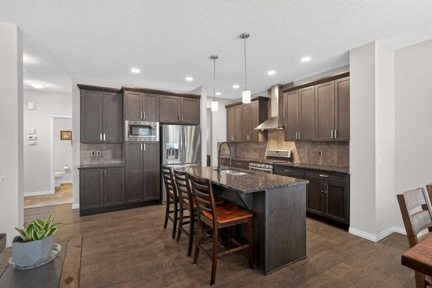 Nestled in a quiet, family-friendly cul-de-sac within one of Okotoks’ most sought-after communities, this stunning residence offers the perfect balance of small-town charm and city convenience. Situated on an expansive, sun-drenched pie-shaped lot, the property provides a massive private retreat for outdoor entertaining or play. The location is second to none—just minutes from premier shopping and world-class golf, with a seamless, 20-minute commute to South Calgary. Built in 2016 and meticulously maintained, this 2,417 sq. ft. home showcases high-quality, original finishes that stand the test of time. As you enter, you are greeted by an open-concept main floor featuring gleaming hardwood and durable tile flooring. The heart of the home is the chef-inspired kitchen, a true showpiece boasting rich custom cabinetry, premium granite countertops, a high-end gas range, and a built-in microwave. Whether hosting a dinner party or a quiet family night, the transition from the kitchen to the living room—complete with its stately gas fireplace—is effortless. Best of all, the entire home remains a sanctuary of comfort year-round thanks to the central air conditioning. The upper level is thoughtfully designed for the modern family. It features four generously sized bedrooms, including a spacious primary suite with a private 5-piece ensuite for a spa-like experience. A versatile central bonus room offers the perfect space for a home theatre or play area, while the convenience of an upper-floor laundry room, a second 4-piece bath, and upgraded finishes throughout elevate the daily routine. The Professionally Finished Basement, the living space continues into a builder-finished basement, ensuring the same high quality and seamless design as the rest of the home. This lower level is a cozy retreat featuring plush carpeting, a massive family/media room, and a fifth large bedroom with a legal egress window for maximum safety and natural light. A third full 4-piece bath completes this level, making it ideal for guests or older children. With premium A/C and an oversized lot, this property is a rare find. It combines the space of a luxury estate with the warmth of a true family home.