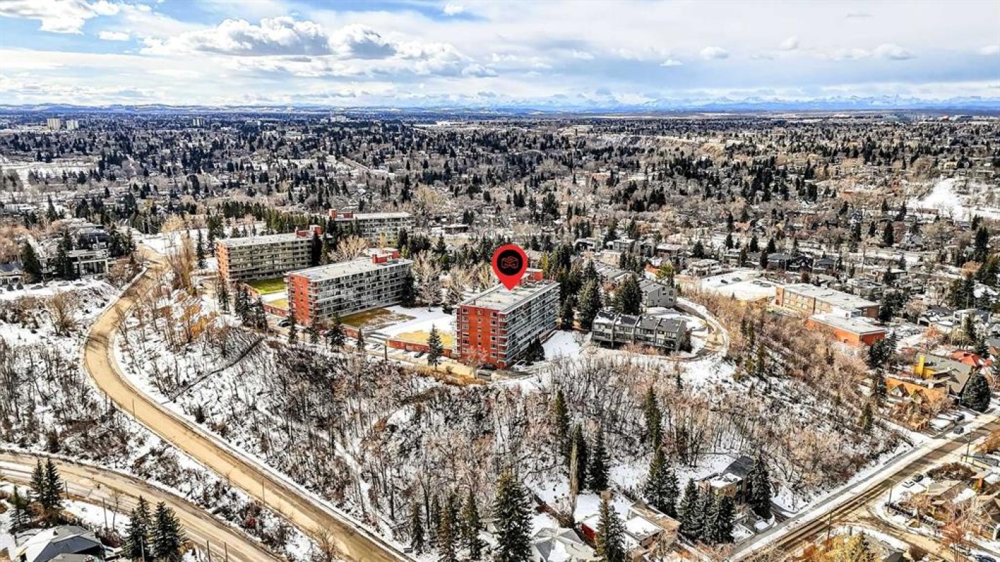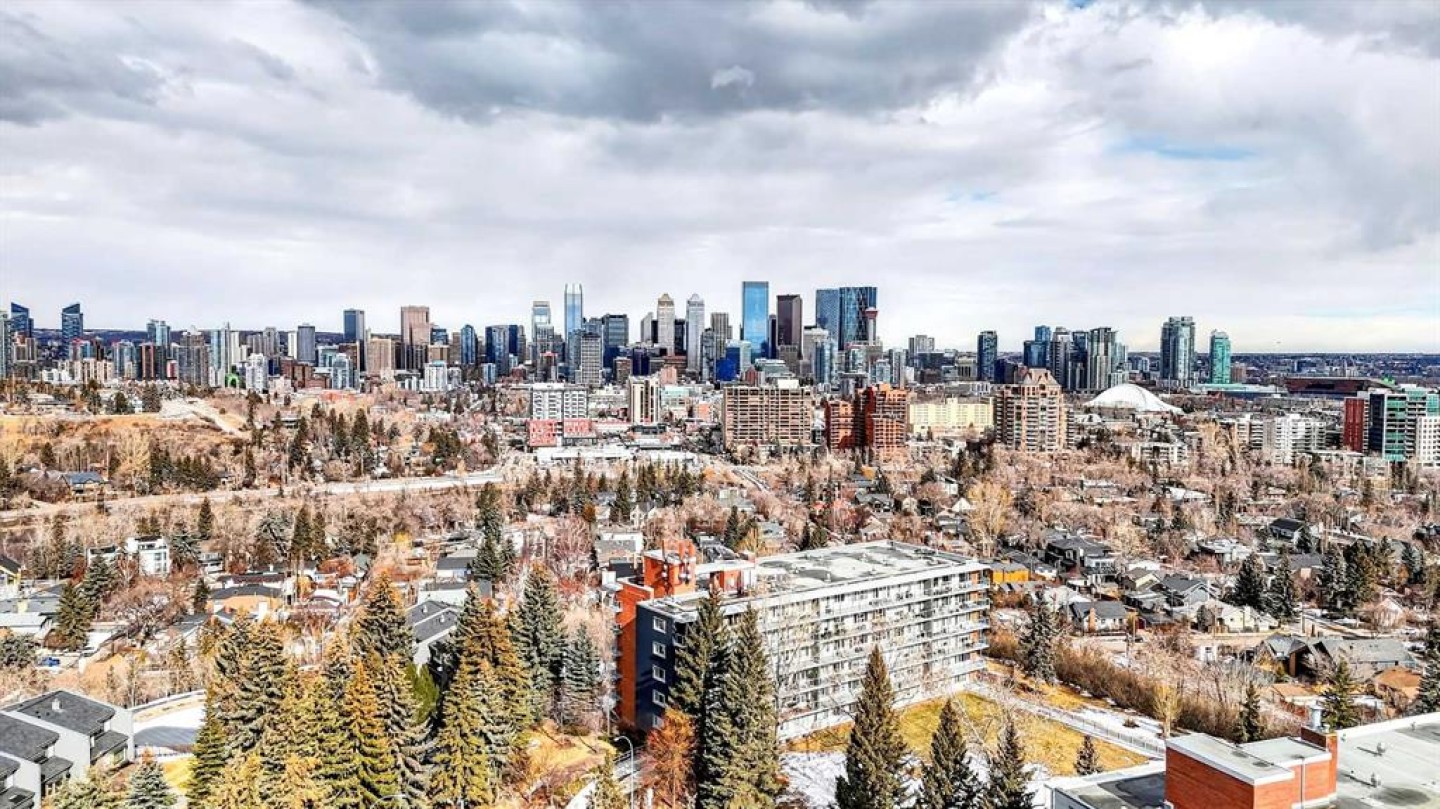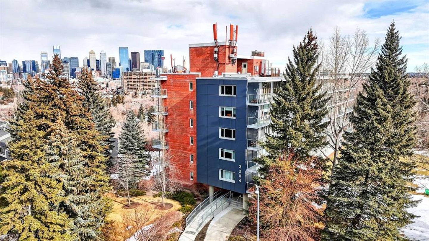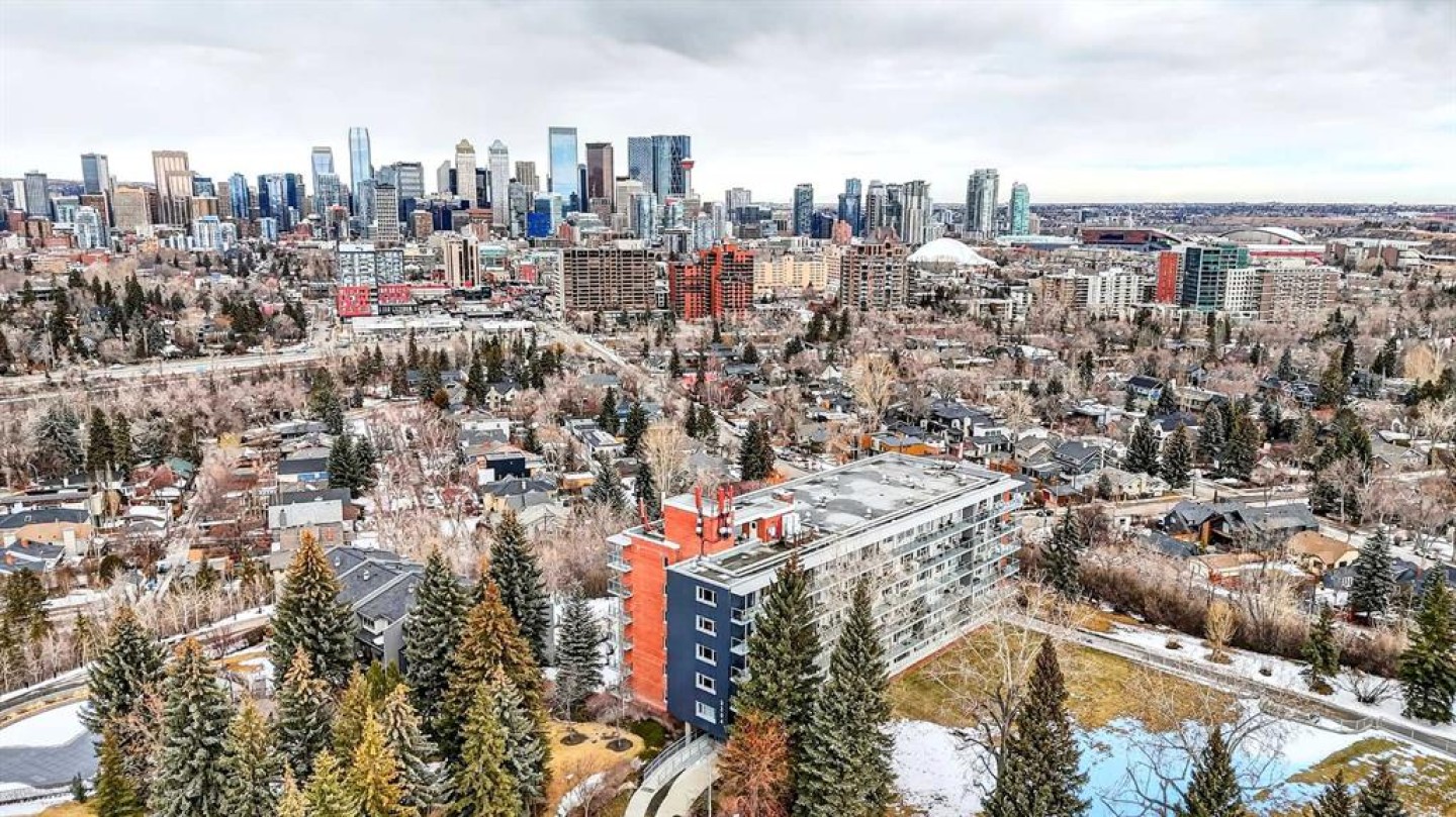 Welcome to the King of the Castle at Rideau Towers!! One of Calgary’s greatest hidden gems. Perfectly perched in an unbeatable inner-city location, this beautifully reimagined residence blends timeless character with modern sophistication in a fully accessible building rich with history. Step inside to a bright, open-concept living space filled with natural light from expansive south-facing windows. Elegant raised paneling and wide luxury vinyl plank flooring create a refined yet inviting atmosphere throughout. The thoughtfully redesigned kitchen is a culinary dream, featuring ceiling-height white cabinetry, a stylish white brick backsplash, sleek black quartz countertops, and generous counter space perfect for both everyday living and entertaining. The bathroom showcases art-deco inspired tilework, complemented by warm brass fixtures, a luxurious 12-inch rain showerhead, and a cleverly integrated mirrored cabinet for additional storage. Opposite the kitchen, the living room offers a stunning focal point with raised paneling and a charming weathered white brick fireplace frame, providing the perfect canvas for your own creative décor. The bedroom is equally impressive, offering 10 feet of built-in closet space along the far wall. Step outside to your 30 foot south facing balcony, where you can enjoy peaceful sunrise views overlooking the lush greenery surrounding Rideau Towers and the Parkhill community. Additional features include a spacious front entry closet that can double as a pantry, secure underground parking, and a separate storage unit. Residents also enjoy access to the 13-acre park-like grounds, complete with a private outdoor swimming pool, a rare amenity in the heart of the city. Built in 1955, Rideau Towers stands apart as a truly unique complex where each unit has been individually designed, creating a sense of character and individuality rarely found today. Surrounded by some of Calgary’s most prestigious communities such as Rideau Park, Roxboro, Parkhill, Mission, and the Stampede Grounds. This stunning unit is just a short walk to trendy 4th Street and downtown, the lifestyle offered here is second to none. A rare opportunity to own in one of Calgary’s most distinctive and charming buildings. Book your showing today.
