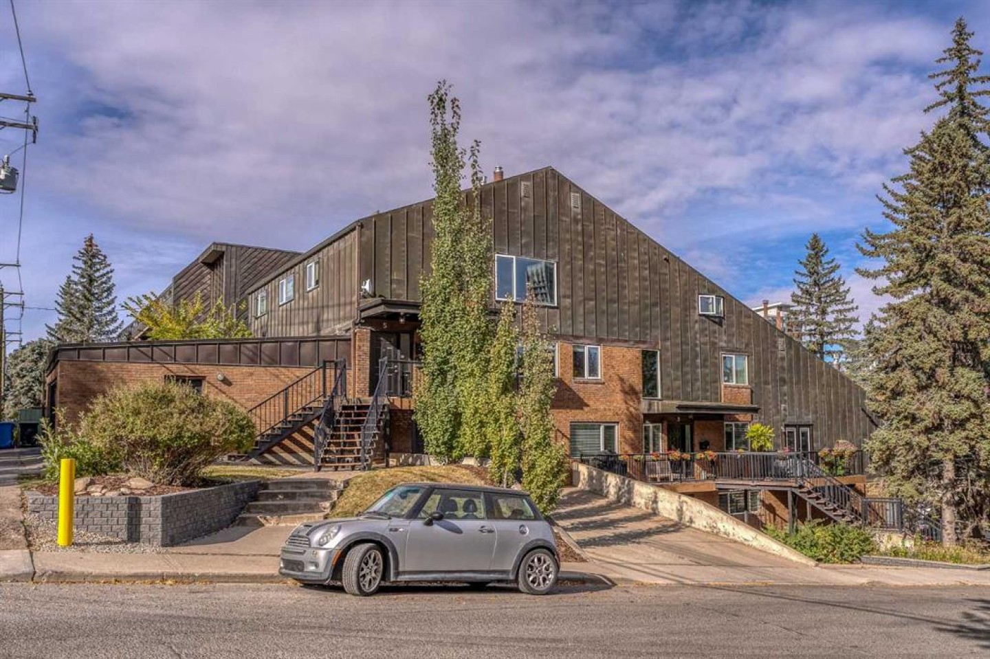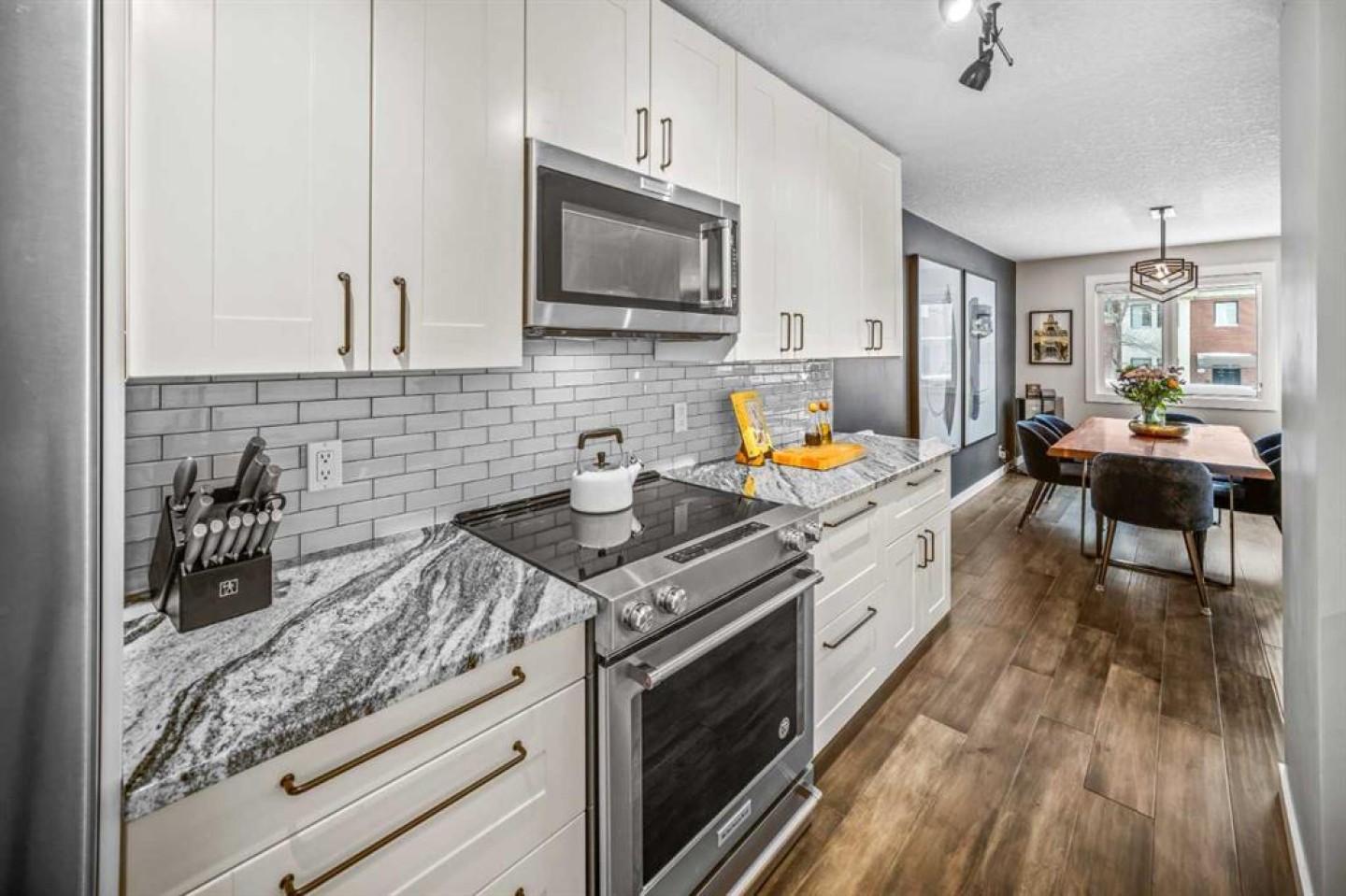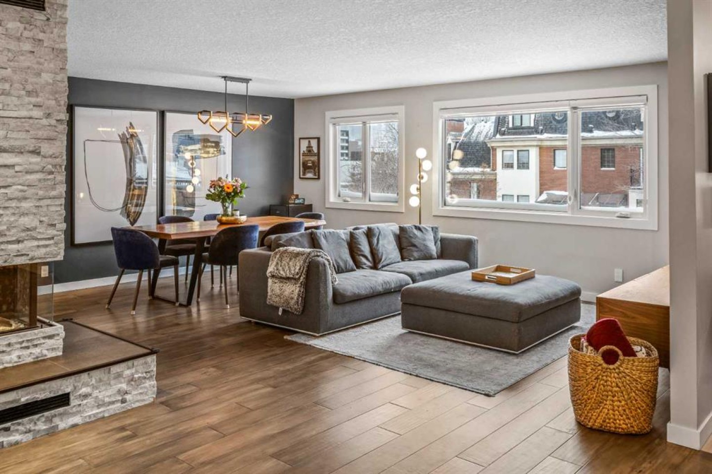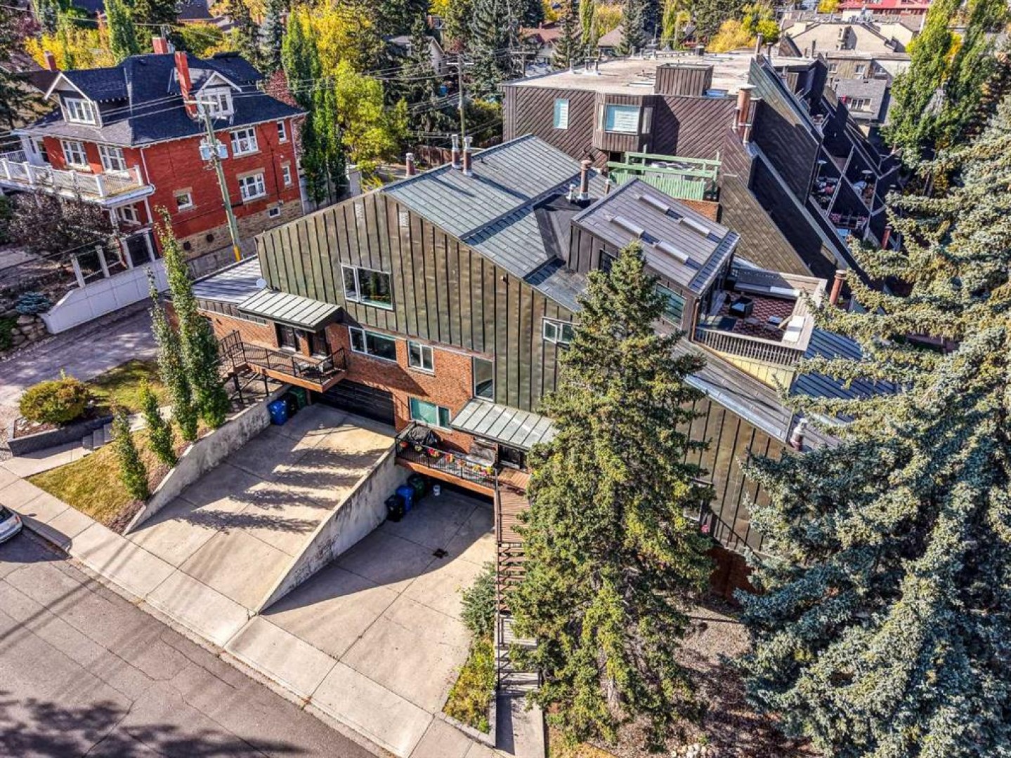 Welcome to Copper Castle — a bold, unique, and one-of a-kind complex in Calgary’s inner-city. Defined by its copper and brick exterior. This distinctive industrial-modern design is far from your typical townhouse. Quietly tucked between the vibrant 17th Avenue and the prestigious community of Upper Mount Royal this location is truly unmatched. Offering over 1,300 sqft of bungalow-style living, this unit delivers all the modern upgrades in the comfort of single-level living. Inside, an spacious open floor plan. Large triple-pane windows face the front of the unit. The living room is anchored by a modern two-sided gas fireplace, creating warmth and comfort. The generous size dining room flows seamlessly into the contemporary galley kitchen - featuring white shaker cabinetry, stainless steel KitchenAid appliances, subway tile backsplash, and marble-granite countertops. Through the kitchen is your walk-in pantry and your main-floor laundry room. Both bedrooms are generously sized. The primary features a walk-in closet and a fully tiled 4-piece ensuite, complete with a shower and freestanding soaker tub. A separate stairwell leads directly to your oversized garage (with driveway), providing exceptional storage and parking flexibility. At the rear of the garage — a recently updated flex space that creates the perfect setup for a home office, gym, or creative studio. Additional storage space is found in the utility room. This home is also equipped with central AC and a newer hot water tank (2021). Whether you're looking to downsize or if you are buying your first home, this home is one you won’t want to miss. Book your showing today!