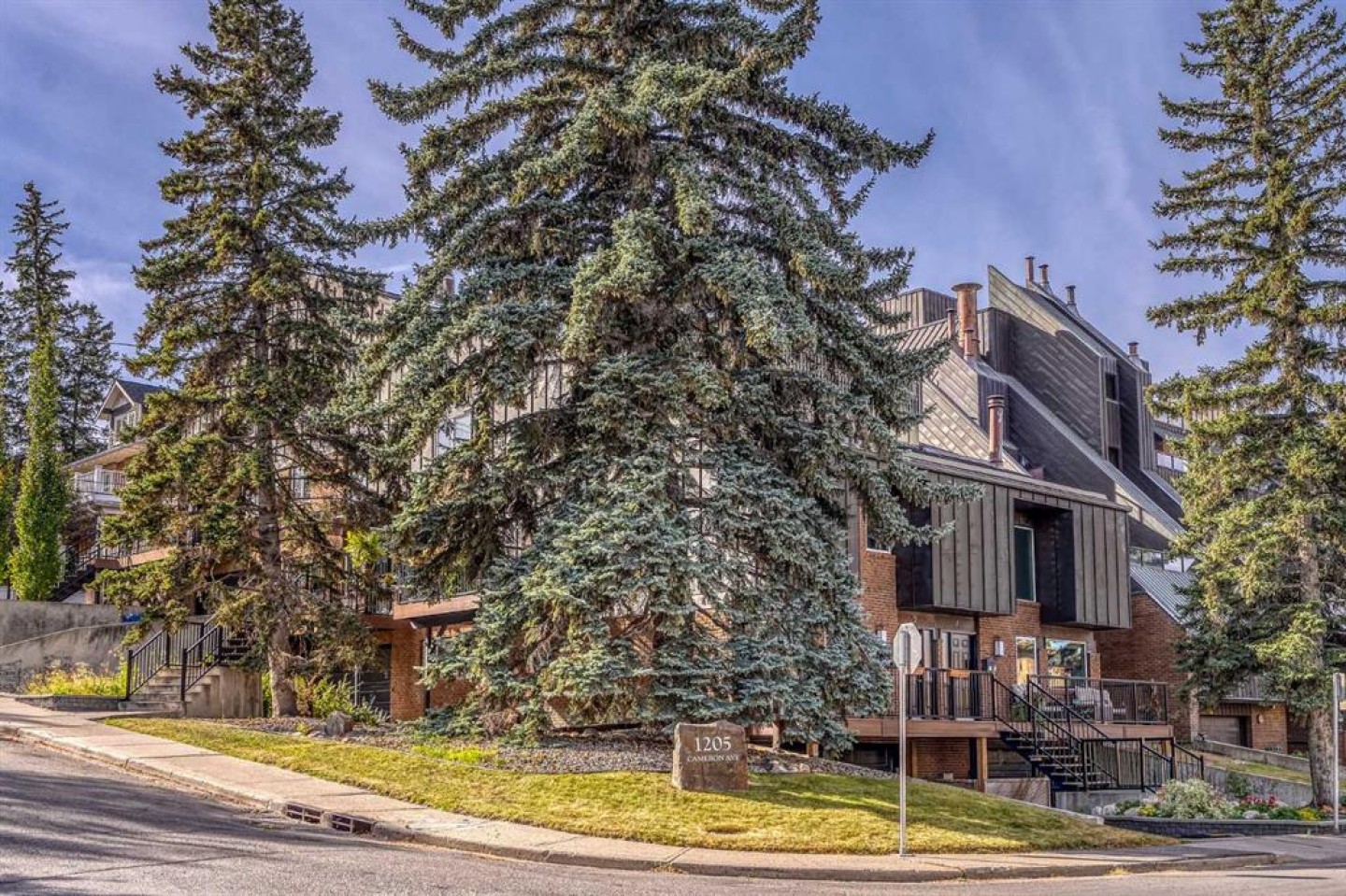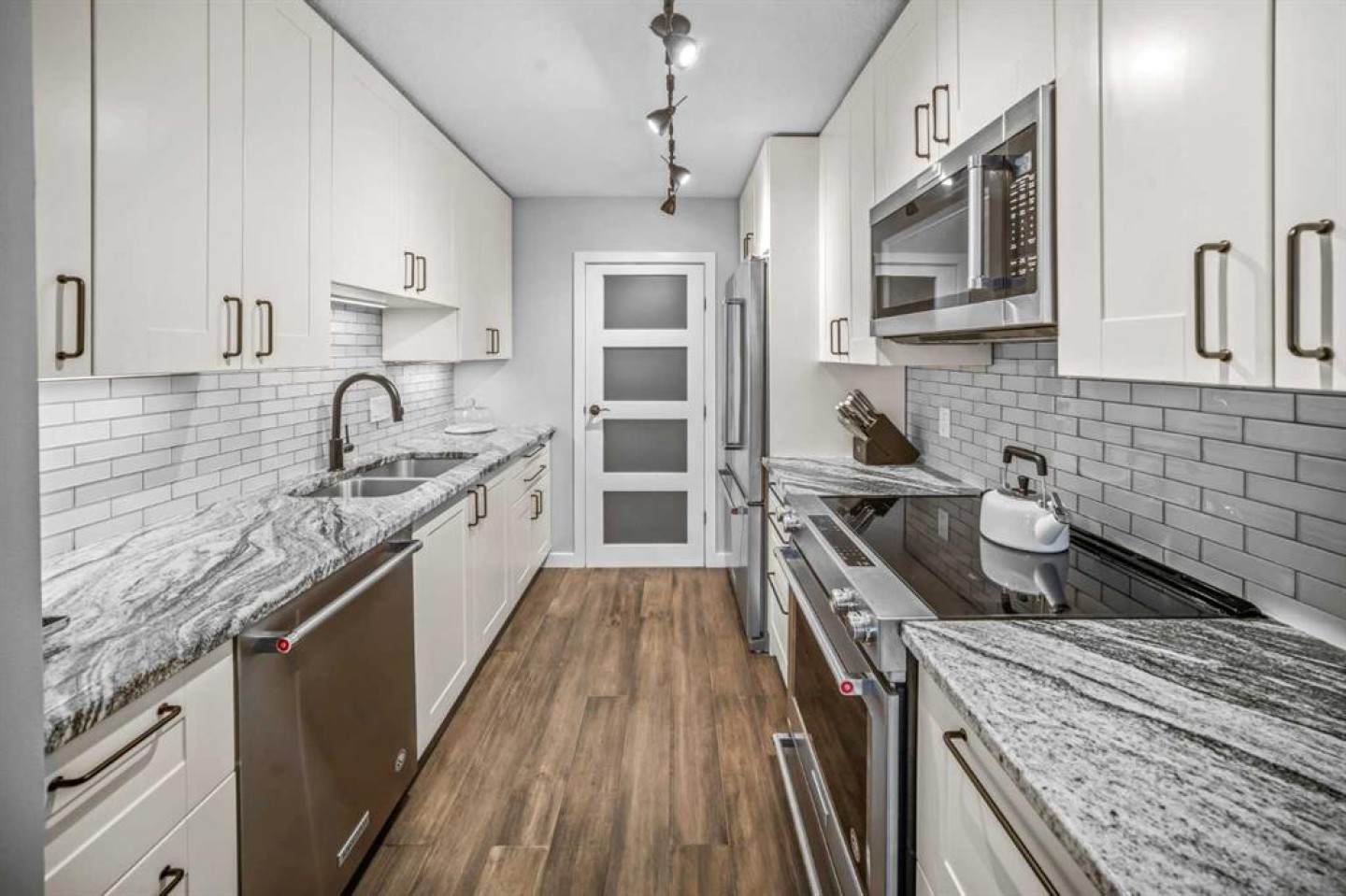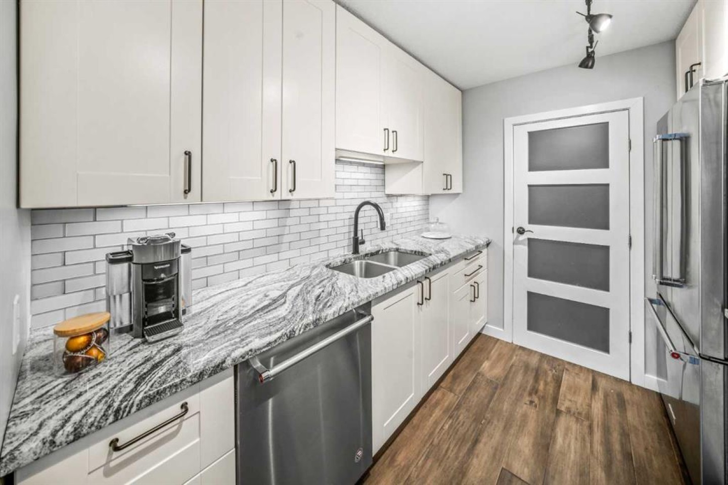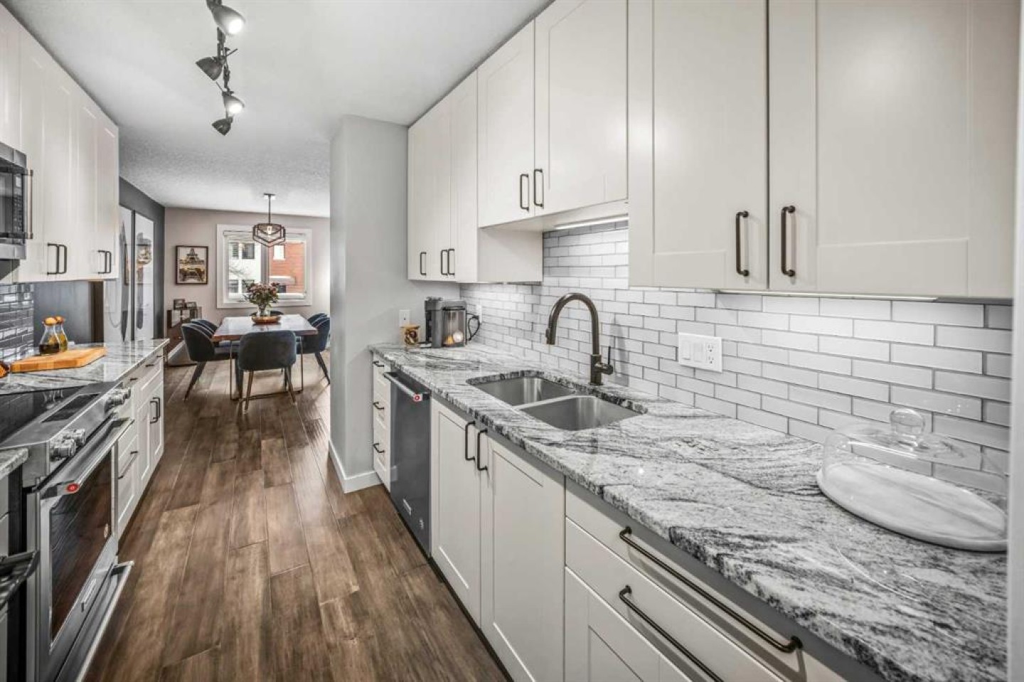 Welcome to Copper Castle — a bold, unique, and one-of a-kind complex in Calgary’s inner-city. Defined by its copper and brick exterior. This distinctive industrial-modern design is far from your typical townhouse. Quietly tucked between the vibrant 17th Avenue and the prestigious community of Upper Mount Royal this location is truly unmatched. Offering over 1,300 sqft of bungalow-style living, this unit delivers all the modern upgrades in the comfort of single-level living. Inside, an spacious open floor plan. Large triple-pane windows face the front of the unit. The living room is anchored by a modern two-sided gas fireplace, creating warmth and comfort. The generous size dining room flows seamlessly into the contemporary galley kitchen - featuring white shaker cabinetry, stainless steel KitchenAid appliances, subway tile backsplash, and marble-granite countertops. Through the kitchen is your walk-in pantry and your main-floor laundry room. Both bedrooms are generously sized. The primary features a walk-in closet and a fully tiled 4-piece ensuite, complete with a shower and freestanding soaker tub. A separate stairwell leads directly to your oversized garage (with driveway), providing exceptional storage and parking flexibility. At the rear of the garage — a recently updated flex space that creates the perfect setup for a home office, gym, or creative studio. Additional storage space is found in the utility room. This home is also equipped with central AC and a newer hot water tank (2021). Whether you're looking to downsize or if you are buying your first home, this home is one you won’t want to miss. Book your showing today!