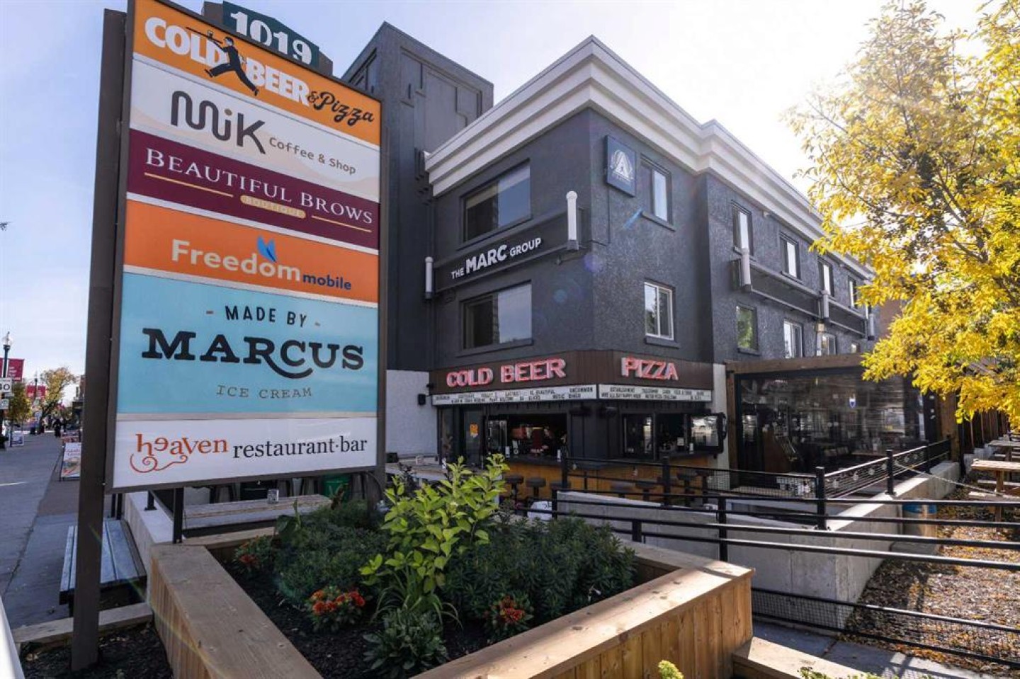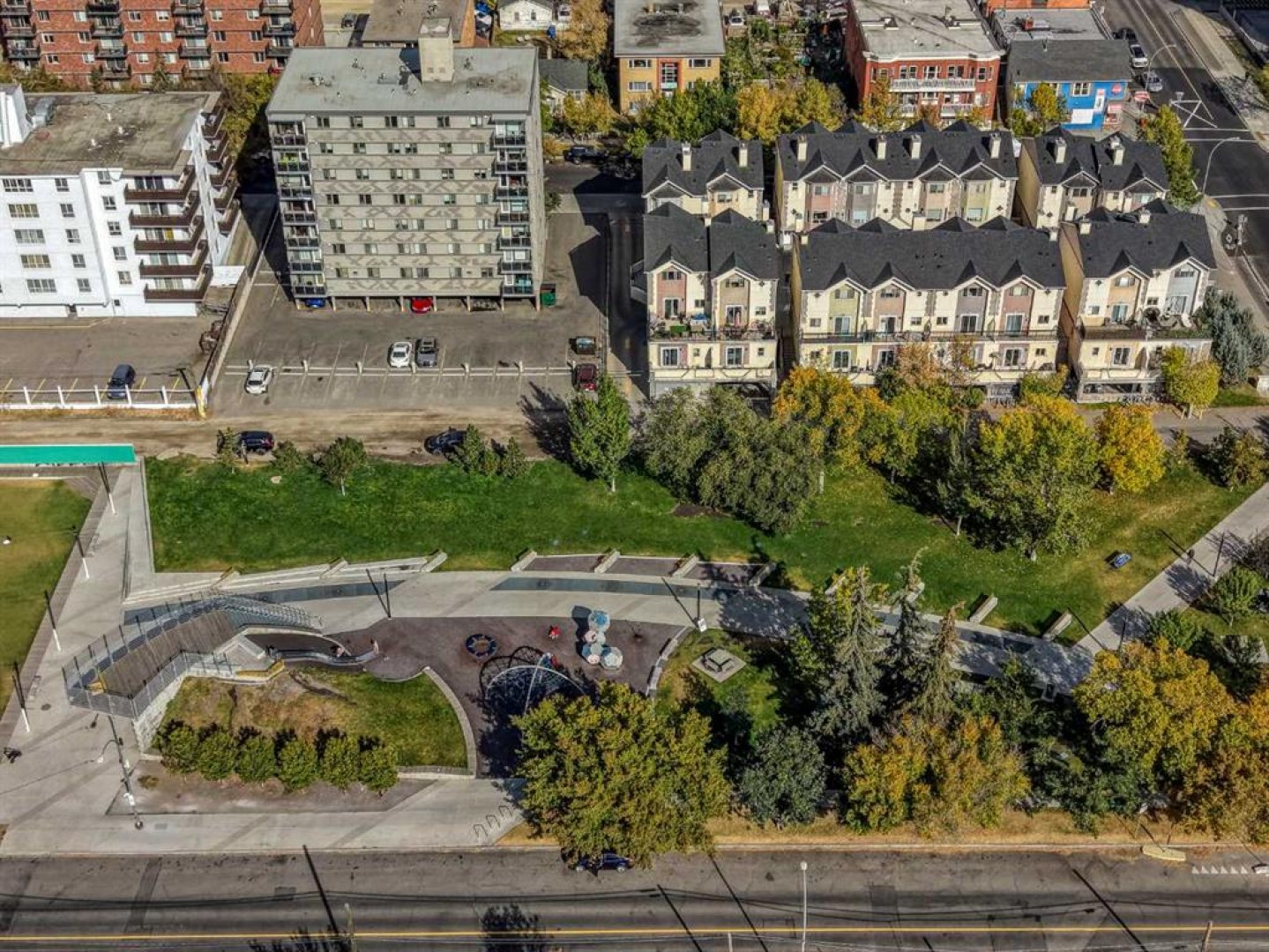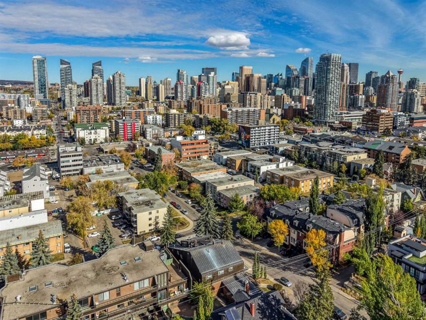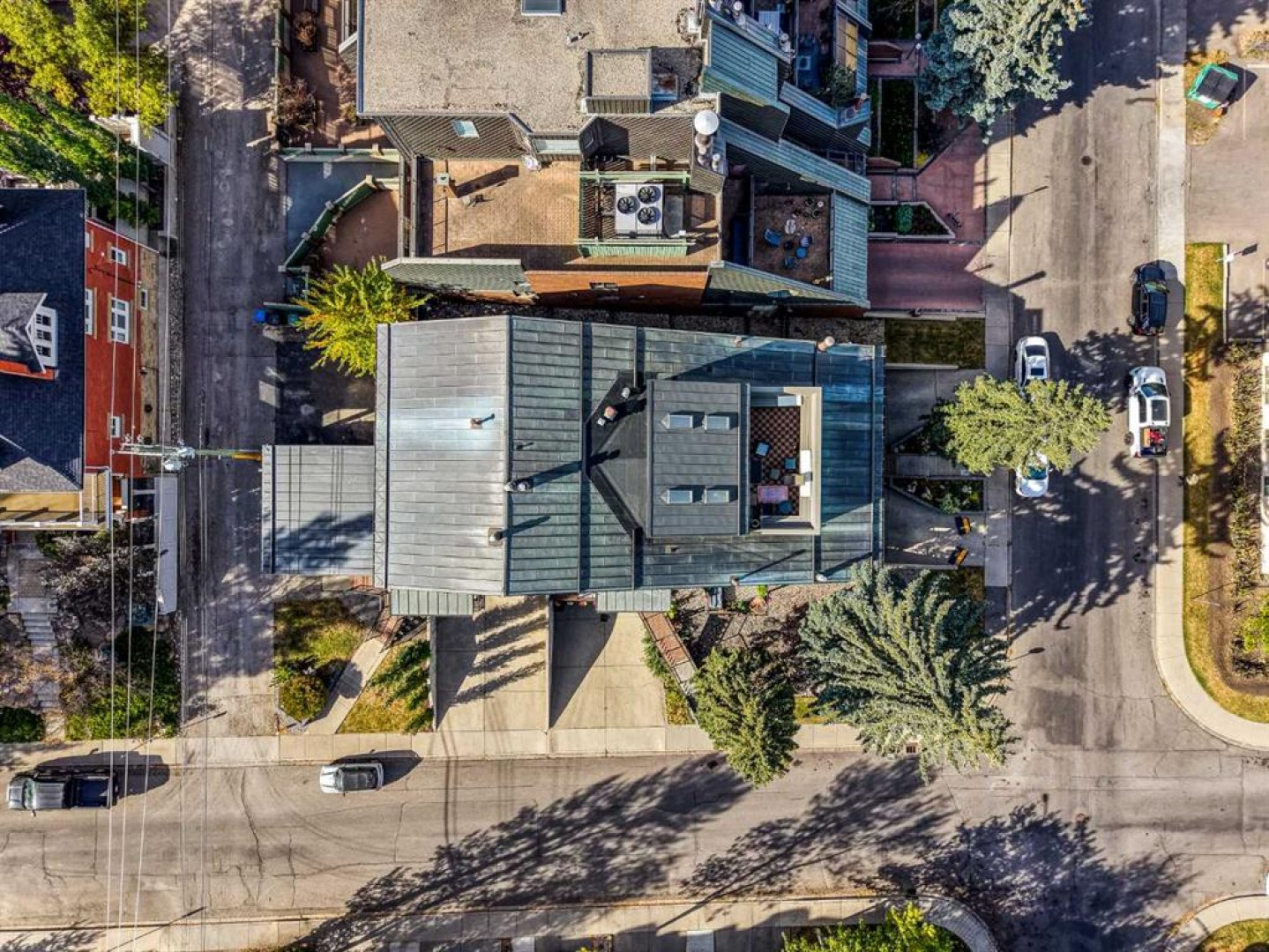 Welcome to Copper Castle — a bold, unique, and one-of a-kind complex in Calgary’s inner-city. Defined by its copper and brick exterior. This distinctive industrial-modern design is far from your typical townhouse. Quietly tucked between the vibrant 17th Avenue and the prestigious community of Upper Mount Royal this location is truly unmatched. Offering over 1,300 sqft of bungalow-style living, this unit delivers all the modern upgrades in the comfort of single-level living. Inside, an spacious open floor plan. Large triple-pane windows face the front of the unit. The living room is anchored by a modern two-sided gas fireplace, creating warmth and comfort. The generous size dining room flows seamlessly into the contemporary galley kitchen - featuring white shaker cabinetry, stainless steel KitchenAid appliances, subway tile backsplash, and marble-granite countertops. Through the kitchen is your walk-in pantry and your main-floor laundry room. Both bedrooms are generously sized. The primary features a walk-in closet and a fully tiled 4-piece ensuite, complete with a shower and freestanding soaker tub. A separate stairwell leads directly to your oversized garage (with driveway), providing exceptional storage and parking flexibility. At the rear of the garage — a recently updated flex space that creates the perfect setup for a home office, gym, or creative studio. Additional storage space is found in the utility room. This home is also equipped with central AC and a newer hot water tank (2021). Whether you're looking to downsize or if you are buying your first home, this home is one you won’t want to miss. Book your showing today!