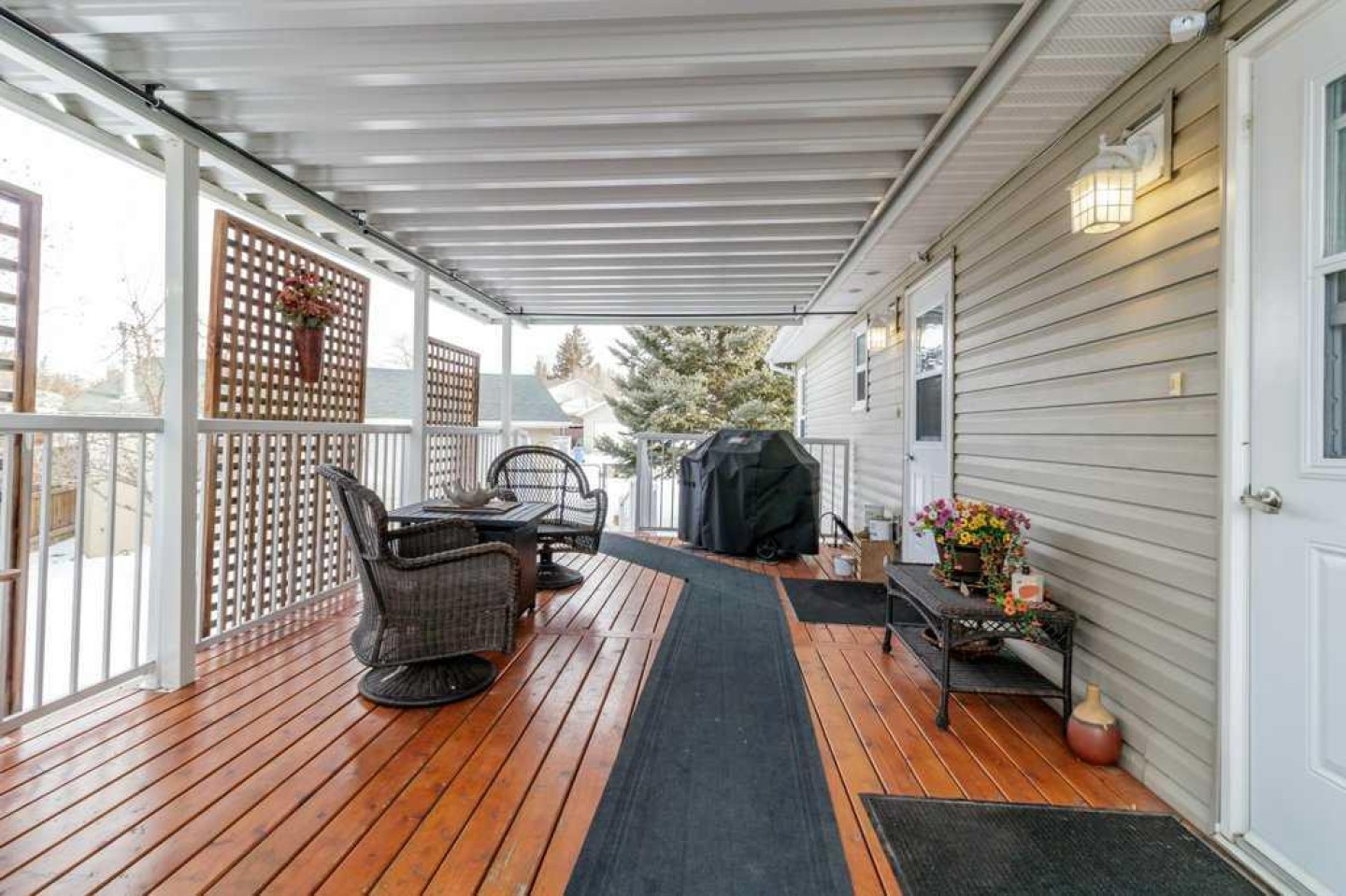 Nestled in the desirable Pines Subdivision on a quiet close, this south-facing bungalow sits on a beautifully landscaped, pie-shaped lot surrounded by mature trees, fruit orchard including a cherry tree, strawberries, raspberries and lush shrubs, with a watering system included. The fully fenced yard offers privacy and space, complete with a welcoming front veranda and a covered back deck—perfect for relaxing or entertaining. Conveniently located close to parks and schools, this home is ideal for families and those seeking a peaceful yet connected community setting. Inside, the bright open-concept layout features sloped ceilings, vinyl flooring throughout, and an abundance of natural light. The spacious kitchen is well-appointed with stainless steel appliances, a granite sink, ample cabinetry, and a walk-in pantry. This home offers two bathrooms, including a private three-piece ensuite in the primary bedroom, which also features a walk-in closet. Additional highlights include central air conditioning, main floor laundry, a new furnace and hot water tank, and an oversized double heated garage with parking out front. There is also a private back alley with an RV parking pad at the rear for added convenience. This well-maintained property combines comfort, functionality, and thoughtful updates in a sought-after neighborhood—ready for you to move in and enjoy.