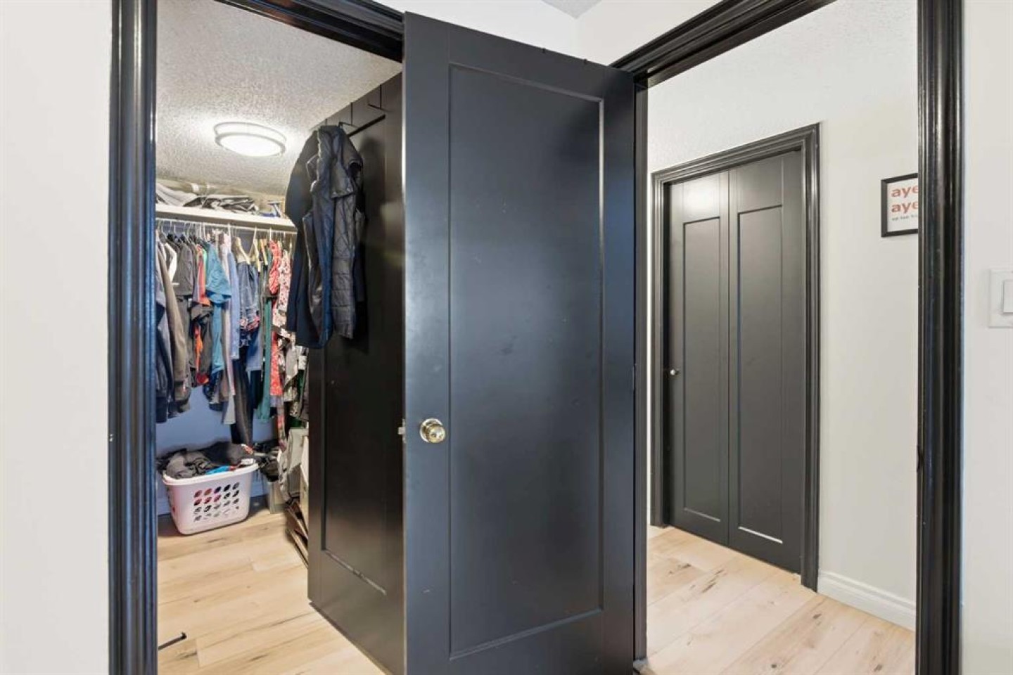 Built-in closet in primary suite, electric fireplace in dining room, kitchen island