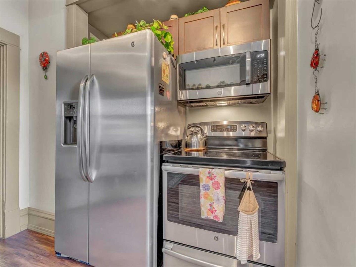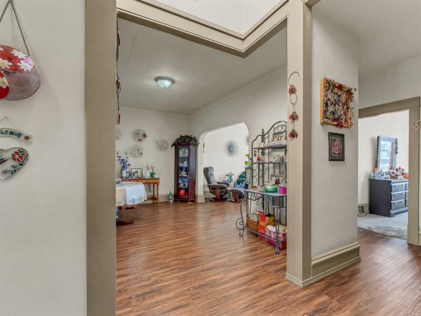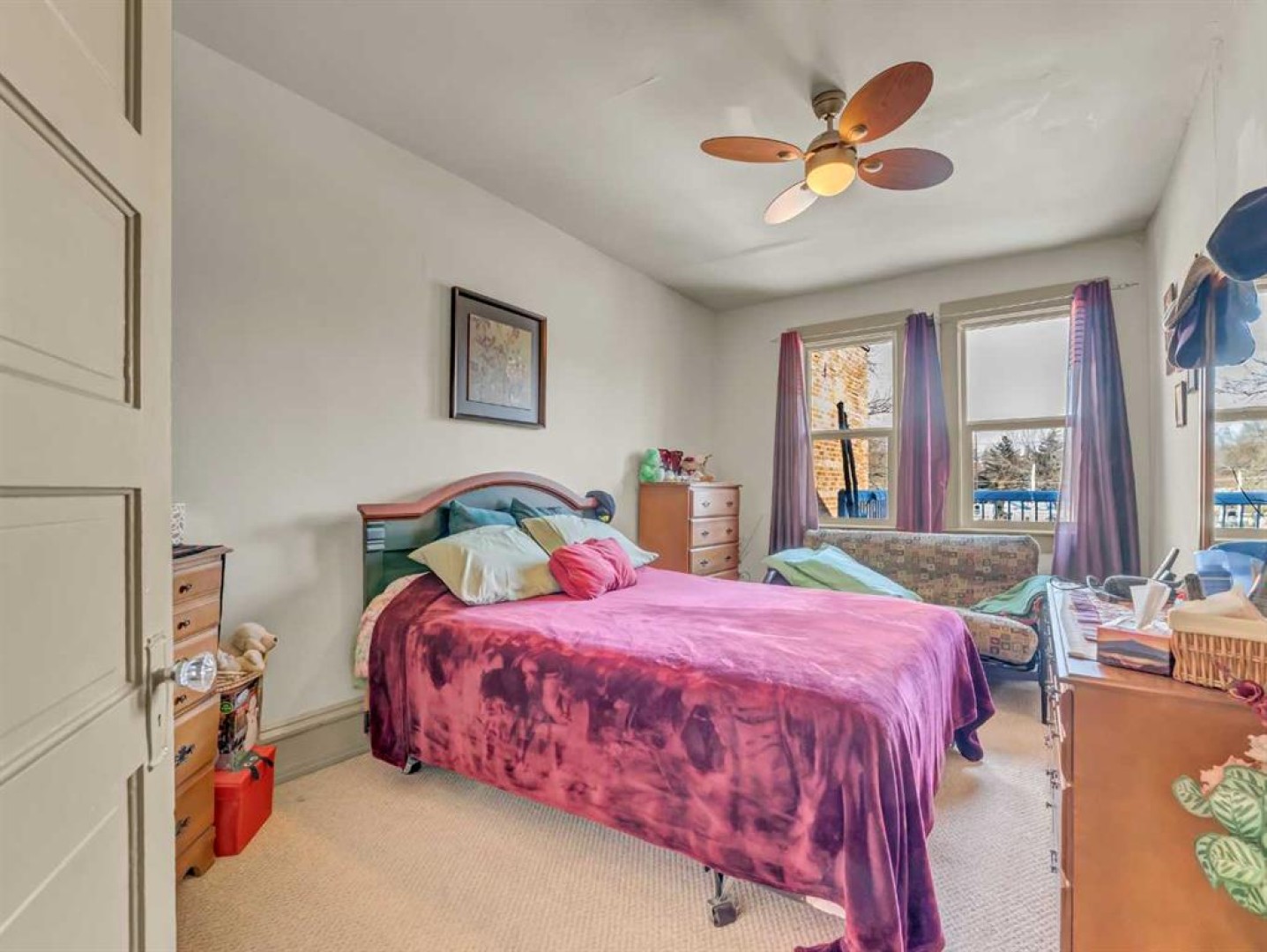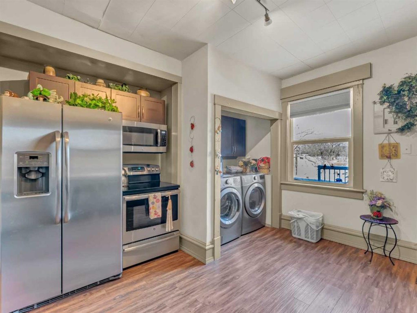 Prepare to be captivated by this truly unique mixed-use property offering exceptional flexibility and diverse revenue opportunities! Zoned for Commercial/Residential use, this solid brick building features an updated 2-bedroom apartment upstairs, a wide open main floor retail or commercial space, and a full basement for added functionality. The upper level boasts 1,184 sq ft of thoughtfully renovated living space, including a spacious kitchen with full appliance package, 4-piece bathroom, in-suite laundry, updated windows, and a newer skylight. High 9-foot ceilings and tall windows fill the suite with natural light, highlighting its timeless character and warmth. The main floor offers 1,130 sq ft of wide open space with soaring 12-foot tin ceilings —perfect for retail, office, studio, or recreation. Previously operated as a successful appliance business, this area is ready for your vision, whether you lease it out or run your own business. Downstairs, a 1,095 sq ft full basement provides ample room for a workshop, hobby room, or extensive storage. Step outside to enjoy a spacious two-tiered deck, ideal for relaxing or entertaining. Rear off-street parking accommodates multiple vehicles plus an RV. Recent updates include a resurfaced roof, modernized wiring, and plumbing. This exceptional property is move-in ready and offers the rare chance to live and work under one roof, generate rental income, or build your investment portfolio. Endless possibilities await the next proud owner!