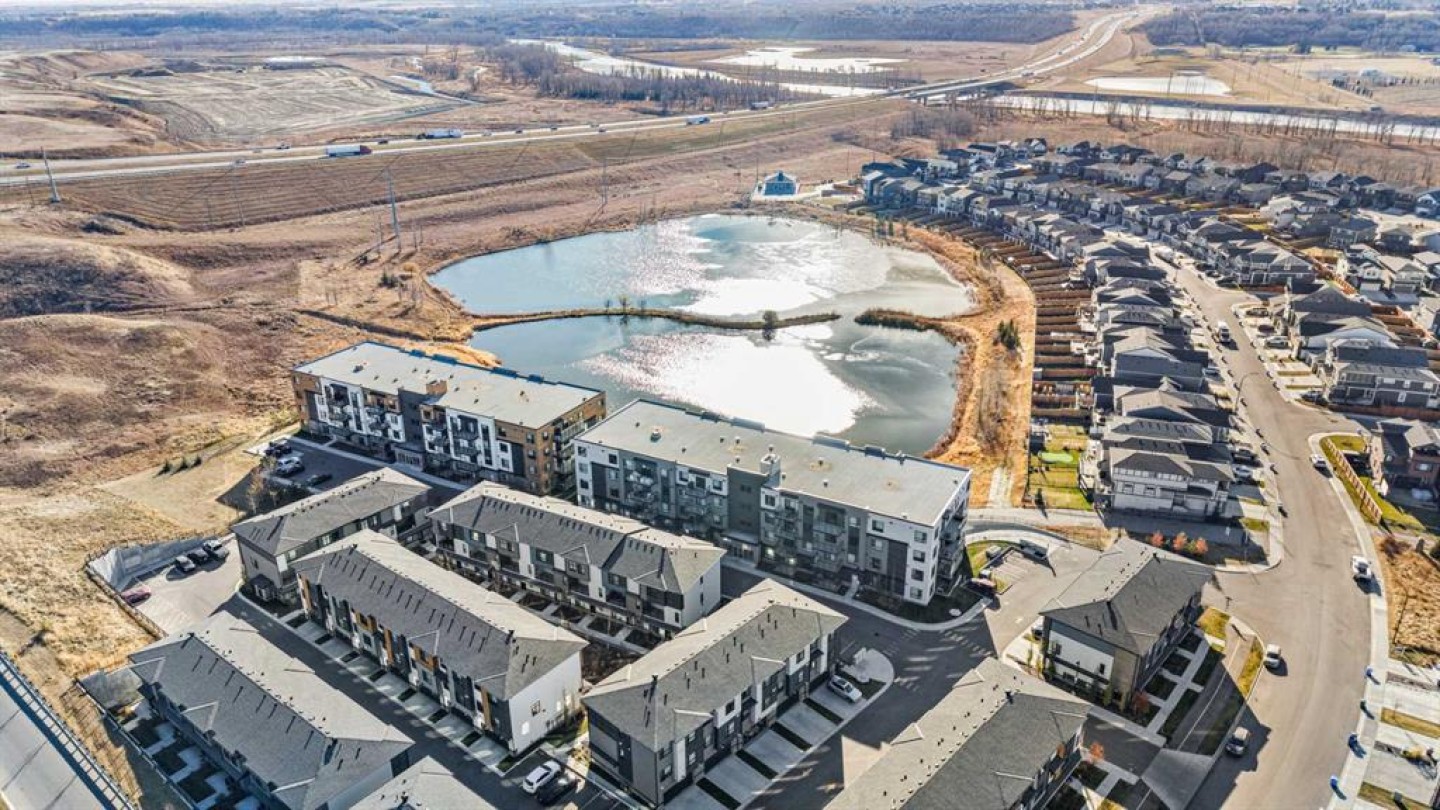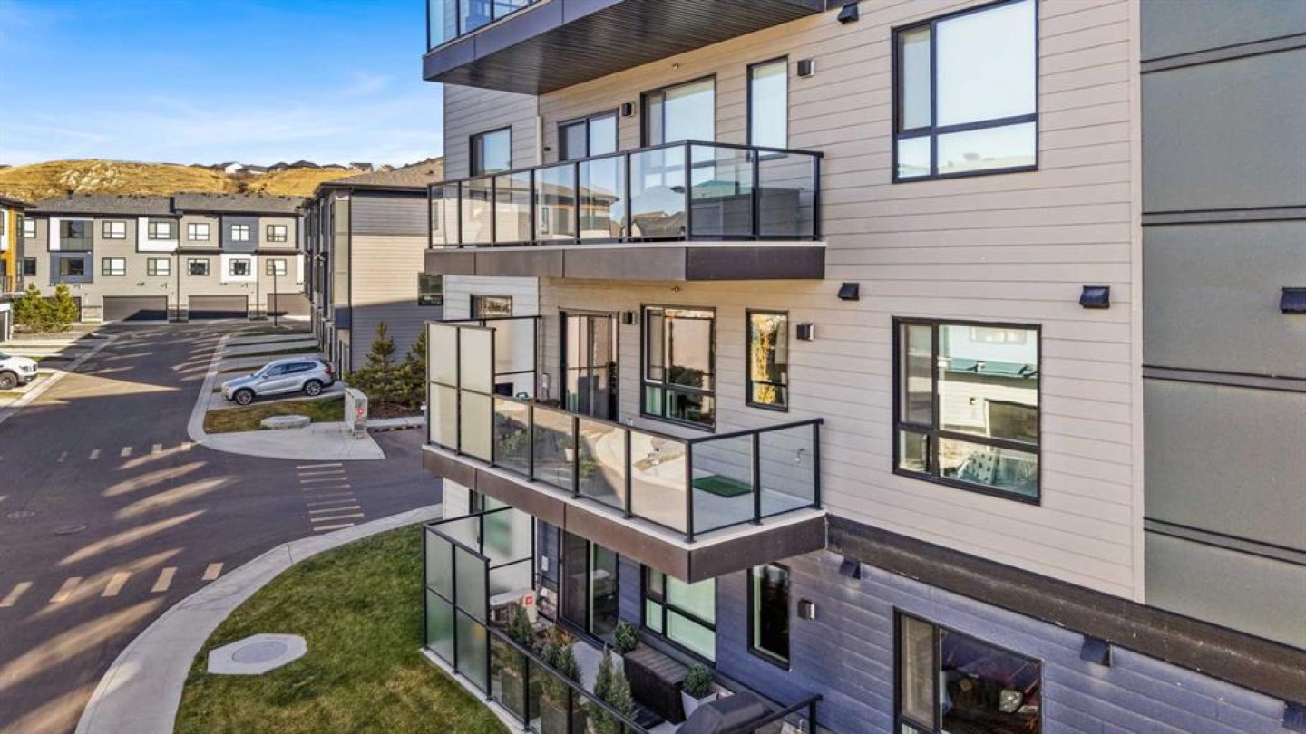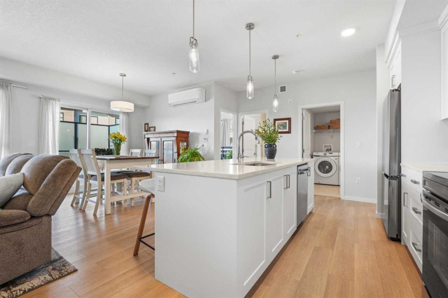 Discover refined living at this bright and beautifully maintained NW corner unit in Riverstone Manor offering over 1,040 sq ft of intelligently designed living space and one of the most private positions in the entire building. With only one shared wall and expansive windows wrapping the corner, natural light pours in throughout the day, creating an airy, refined atmosphere that feels more like a bungalow than a condo. Featuring 2 generous bedrooms, 2 full bathrooms, and a full sized laundry room, the layout is exceptionally functional, with thoughtful separation between the bedrooms for optimal privacy. The inviting foyer opens into a spacious open concept great room anchored by walls of windows. The living and dining areas offer flexibility for entertaining, quiet evenings, or a dedicated work from home setup. The kitchen integrates seamlessly and showcases full height cabinetry, quartz countertops, stainless steel appliances, and a large island designed for gathering. Step outside through double patio doors to a rare 20 x 7 west facing balcony. With no direct neighbours beside you, this is one of the most private outdoor spaces in the complex. Enjoy uninterrupted sky, peaceful evenings, and golden sunsets as an extension of your living space. Inside, luxury vinyl plank flooring runs throughout, with no carpet. The primary suite features a walk through closet and a well appointed 4 piece ensuite with dual sinks and a walk in shower. The second bedroom sits on the opposite side of the unit, ideal for guests, a home office, or additional flex space, and is positioned next to a full 4 piece bathroom. A large dedicated laundry room adds rare in suite storage and everyday practicality. Additional highlights include 9 foot ceilings, ductless air conditioning, heated titled underground parking, and Alberta New Home Warranty still in place, offering confidence and peace of mind. The true differentiator is the setting. Located steps from the Bow River, extensive pathway systems, and the natural beauty of Fish Creek Park, Riverstone offers a lifestyle that feels removed from the city, yet remains minutes to Seton’s shopping, dining, and South Health Campus. This is not simply condo living, it is low maintenance living in one of Calgary’s most serene and tightly held communities, where outdoor access, privacy, and smart design come together. At this size and location within Riverstone, opportunities at this price point are increasingly rare.
