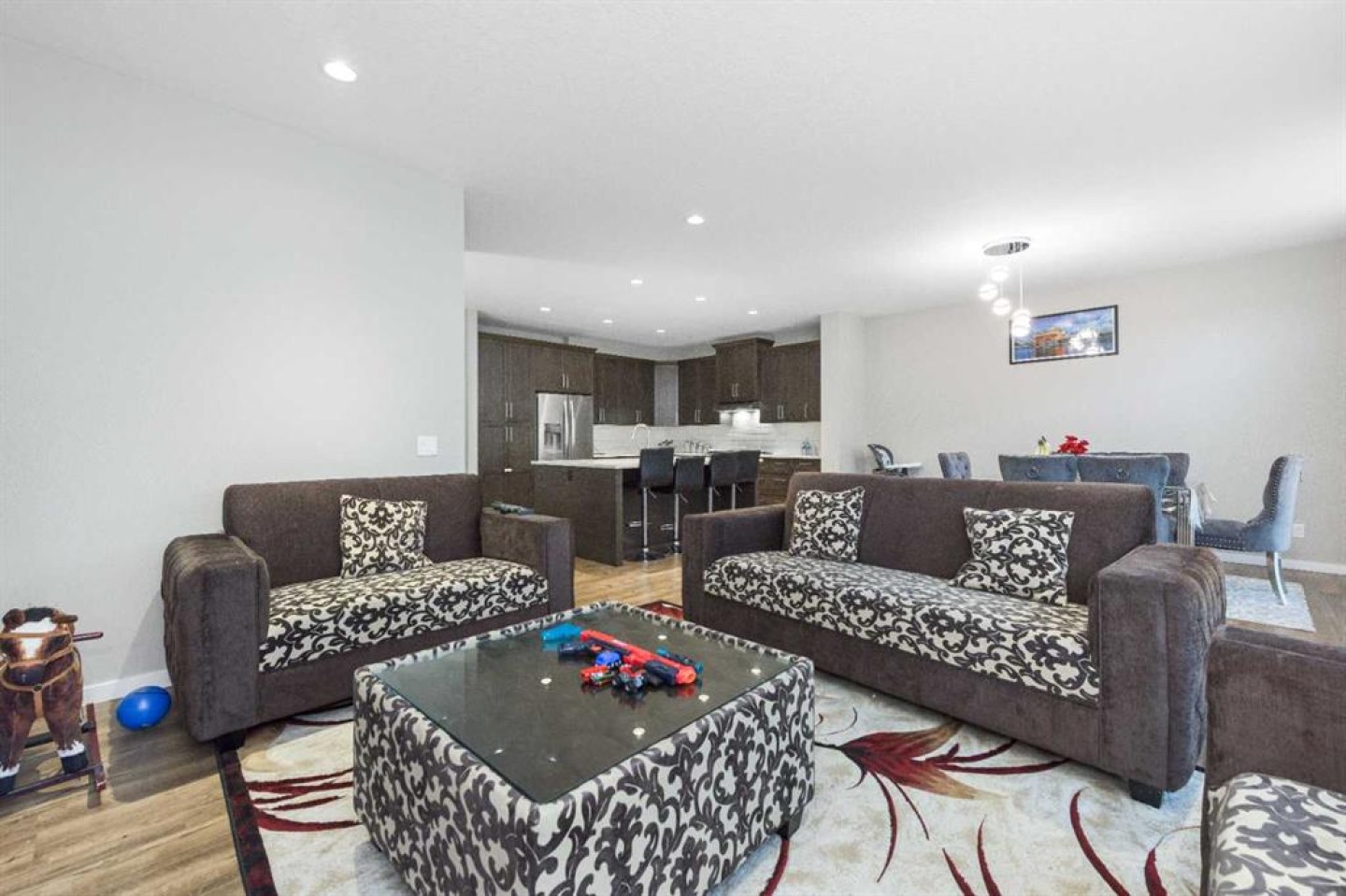**2 Bedroom Illegal Suite** Welcome to this Exceptional 5 Bedroom and 4 Full bathroom move in Home! with over 2700 Sq/Ft of living space in the community of Kinniburgh South. Abundant natural light throughout the home from the many over sized windows, Stunning living area , Large family room and formal dining space and open sight lines to the kitchen. The spectacular gourmet kitchen and living space is built for entertaining, boasting farmhouse style cabinetry , Large size central island, Quartz counter tops, French door fridge and Large pantry . The atrium nook with large sun filled windows supply plenty of sunlight throughout the main floor Stunning custom rail staircase leads you to the second floor where you will find an Large Bonus room and 3 generous sized bedrooms. The impressive over sized master retreat contains a large walk in closet. over sized shower with glass door, custom vanity with dual sinks with quartz countertops and tile floor. Other 2 bedrooms share the main bathroom which features a bathtub, a custom vanity and tile floor. Fully Finished Illegal basement Suite with separate entrance offers an abundance of space, 2 generous size Bedrooms and 4pc bathroom and Brand new Custom Kitchen Cabinets. Lower level has separate laundry. The large quiet backyard offers great privacy. This beautiful house has double oversized garage. The quiet backyard offers great privacy and large exterior deck with aluminum railings connects the main floor. This family-oriented community has access to the best schools, Great location just steps away from school and shopping. Don't miss this move in home!