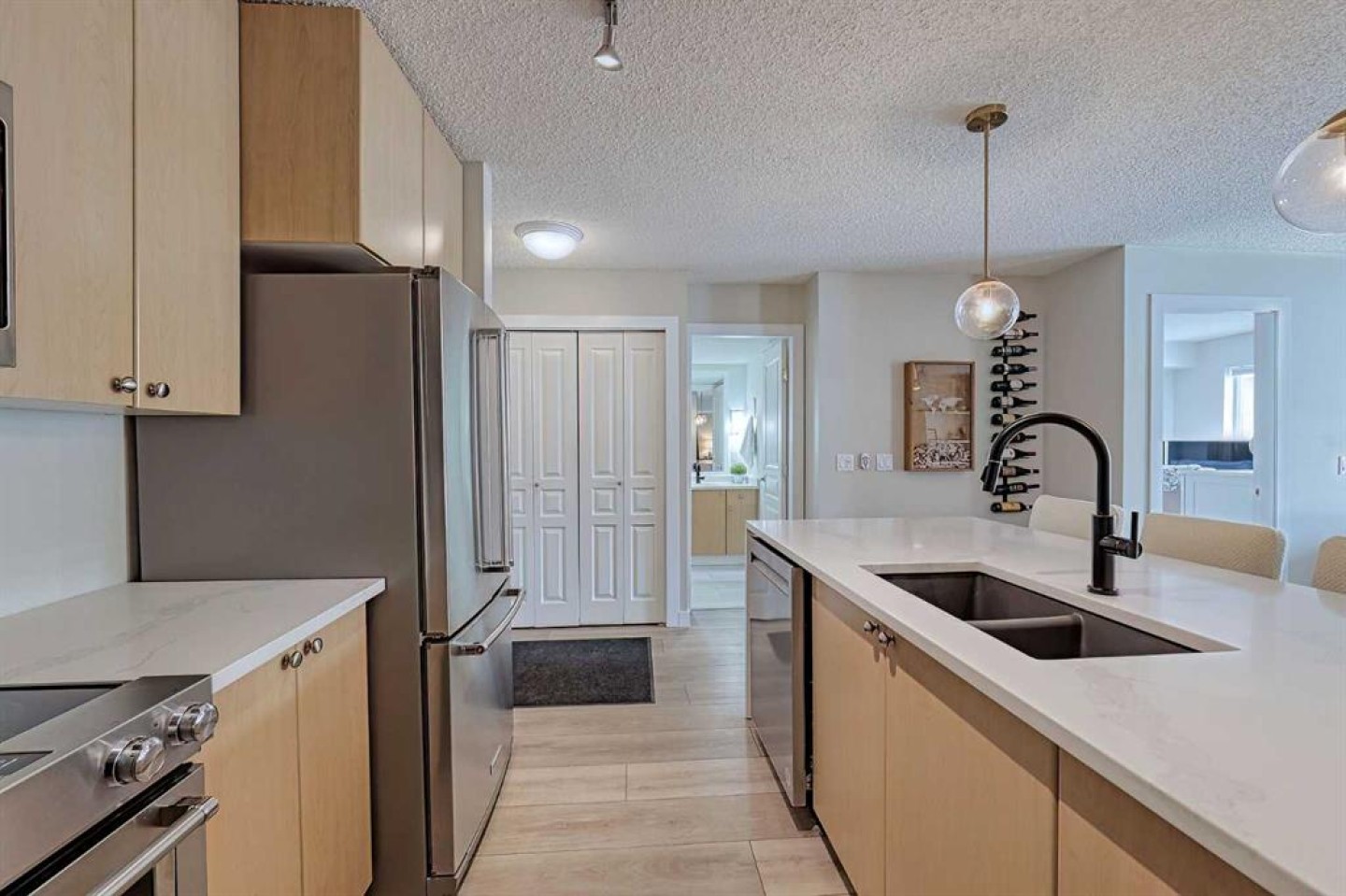 Welcome to Laurel House At The Park where this unit showcases an absolutely stunning renovation and courtyard views! Offering 940 SF of well-designed living space with dual master suites for ultimate functionality. The bright and open layout features vinyl plank and tile flooring throughout, a gorgeous kitchen with updated stainless steel appliances, timeless maple cabinetry, waterfall Quartz countertops, breakfast bar and undermount sink with modern black faucet. The living room has a cozy gas fireplace and offers access to the large, sunny WEST facing balcony with courtyard views. Both primary suites are generously scaled and offer ample closet space each with their own ensuite (4 piece ensuite and a 3 piece ensuite) with quartz countertops and updated faucets. Don't overlook the insuite laundry, secure underground and titled parking, assigned storage unit, bike storage, on-site gym and party/rec room. Pets are welcome with approval. The complex backs onto extensive walking paths near Mount Royal University, and the surrounding area continues to grow with an array of amenities and restaurants, providing plenty of dining and lifestyle options. Book your showing today!