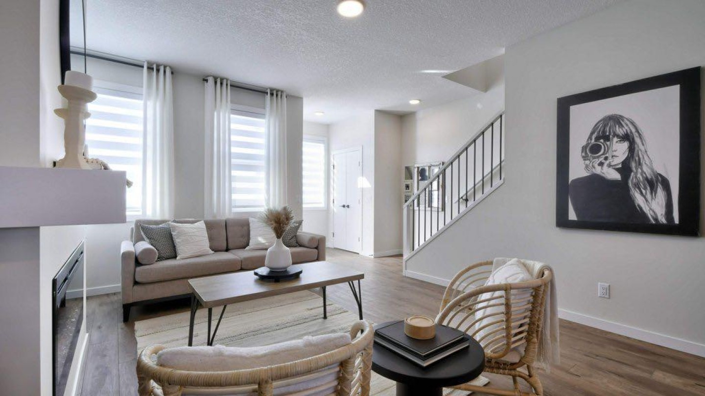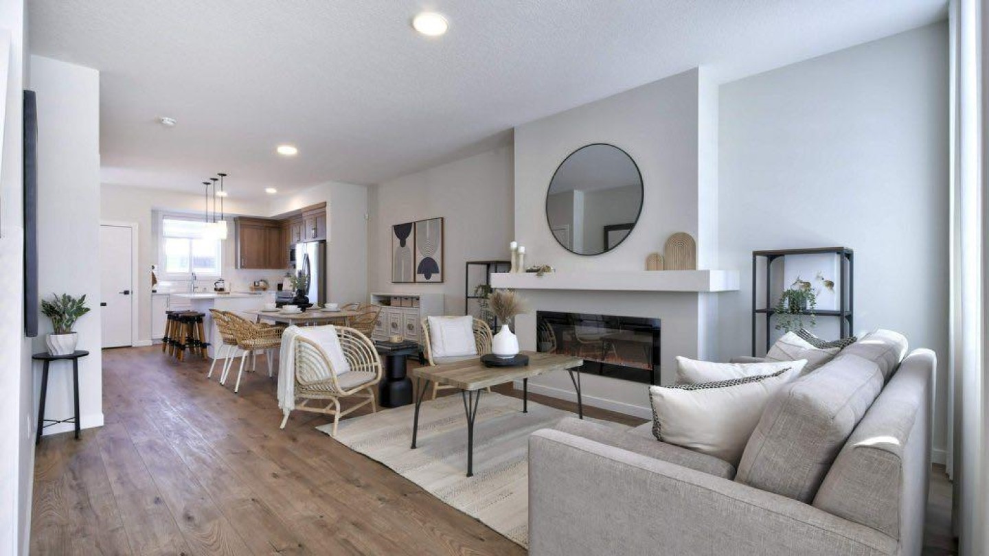 OPEN HOUSE SATURDAY FEB 28th and SUNDAY MARCH 1st FROM 12:30 PM - 4:30 PM *** LUXURIOUS STREET TOWN * NO CONDO FEES * DOUBLE CAR GARAGE * SIDE ENTRY DOOR * FULLY LANDSCAPED * DECK * WINDOW COVERINGS * UPGRADED FINISHINGS * Wonderful home located within a 5 minute walk to the Bow River where nature is right at your back door! As you enter this "open concept floor plan", the first features you'll see are the gorgeous wide plank floors, the 9 foot high ceilings, a cozy fireplace and elegant metal railing on the staircase. The spacious living room allows for casual family gatherings or a fun movie night. The dining room is located in the middle of the home and has the capacity to fit a large dining room table. The kitchen is at the REAR of the home and has an island with eating bar, a pantry, quartz countertops, Slim Line lighting and pendant lighting. The mudroom has a bench and hooks for jackets. The upper floor has a huge primary bedroom that has a walk in closet and a 4 piece ensuite bathroom which includes a 5 ft. wide TILED shower and 2 sinks. The 2 spare bedrooms are at the back of the home where you'll also find a 4 piece bathroom. The laundry room is on the upper floor as well. There's also a Tech space for a desk at the top of the stairs. The basement is unfinished but has plumbing rough-ins for a bathroom, laundry facilities and a bar sink. As you enter the backyard from the mudroom a 100 square foot deck is there to get your future backyard plans started. We have provided a rough-in gas line for your BBQ here. To get you out of Calgary's long winters, a double car garage is waiting for you! Grass will be provided for both the front yard and the back. Energy saving components are triple pane windows, a 96% high efficient furnace, LED lighting, a high end Air Filtration System ( HRV ) and a ECOBEE SMART thermostat that's an "all in one Smart Device. There's a shallow concrete swale in the backyard for drainage. Pictures are representative. Not all components in the pictures are included. Pictures are of a showhome but not the exact home. Builder's representative will clarify all details prior to a contract being written. RMS measurements taken from Builder's blueprints.