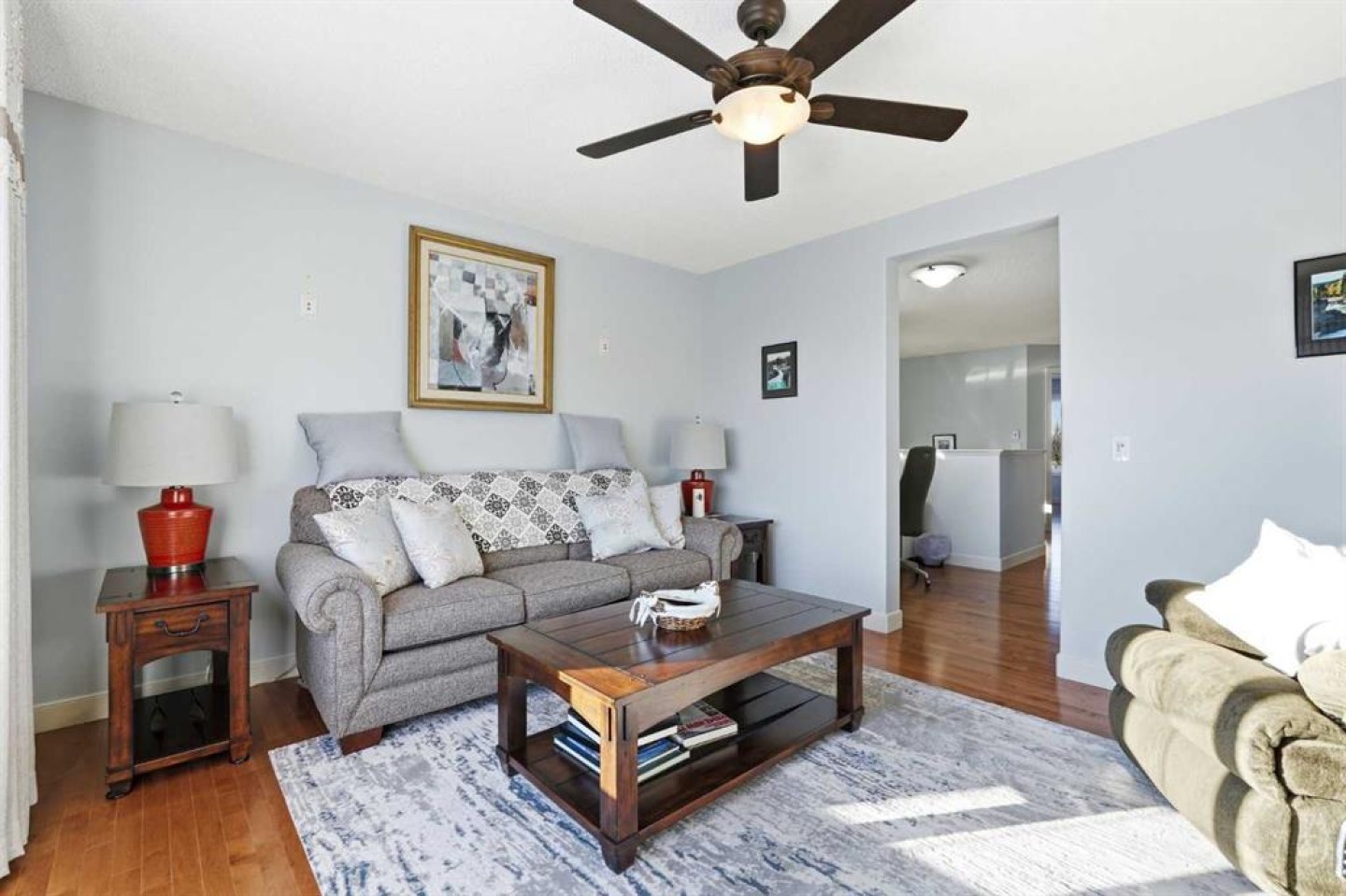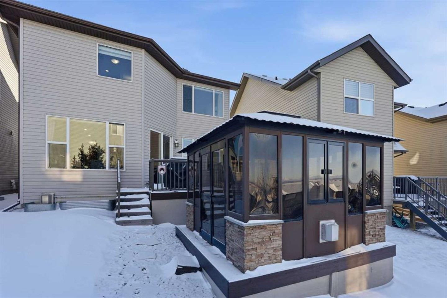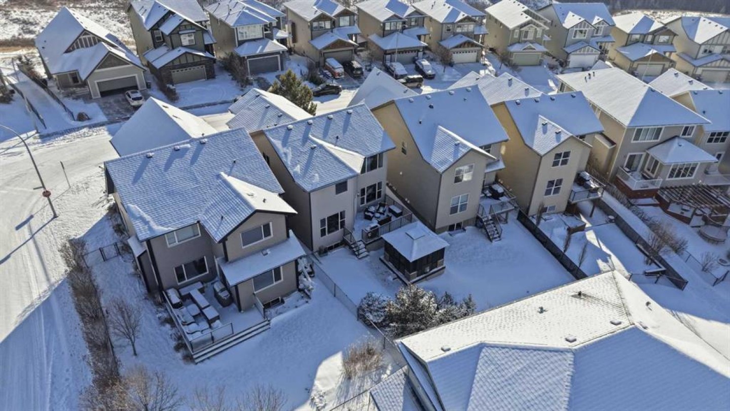 Welcome to one of the most uniquely positioned homes on the street, offering clear, unobstructed MOUNTAIN VIEWS from the backyard, dining room, primary bedroom, and even the ensuite bath. Surrounded by three green spaces, this home delivers a rare sense of privacy, openness, and connection to nature where morning coffee comes with mountain sunrises and evenings wind down under Cochrane’s painted skies. Extensively renovated and thoughtfully upgraded, the home features a 3-year-old designer kitchen with new appliances and three custom waterfall countertops, a true focal point for gathering and entertaining. Motion sensored Under-cabinet lighting, rounded drywall corners, hardwood floors on the main and upper levels, comfort, and quality throughout. Major mechanical upgrades provide peace of mind and everyday comfort, including AC, high-efficiency furnace (2021) with UV air purification system for crisp, clean air, an upgraded 60-gallon electric hot water tank, water softener, and a full home water filtration system with reverse osmosis (2013) for premium drinking water. Fireplaces have been recently cleaned and serviced. Fully wired with Telus security and surround sound speakers. Designed for both relaxation and entertaining, the home features two custom decks with a gas fire pit that capture the mountain views, along with a fully wired backyard gazebo complete with gas fireplace, TV hookup, electricity, and space to host year-round. The basement offers a wet bar, steam shower, and a versatile soundproofed entertainment area easily transformed into a theatre room, home gym, or yoga retreat. Zero-scaped landscaping ensures a low-maintenance lifestyle so you can spend more time enjoying the setting and less time maintaining it. A rare opportunity to own one of the few homes in this location with true unobstructed mountain views, thoughtful upgrades, and a lifestyle that’s hard to replicate.