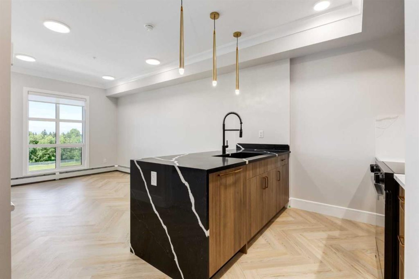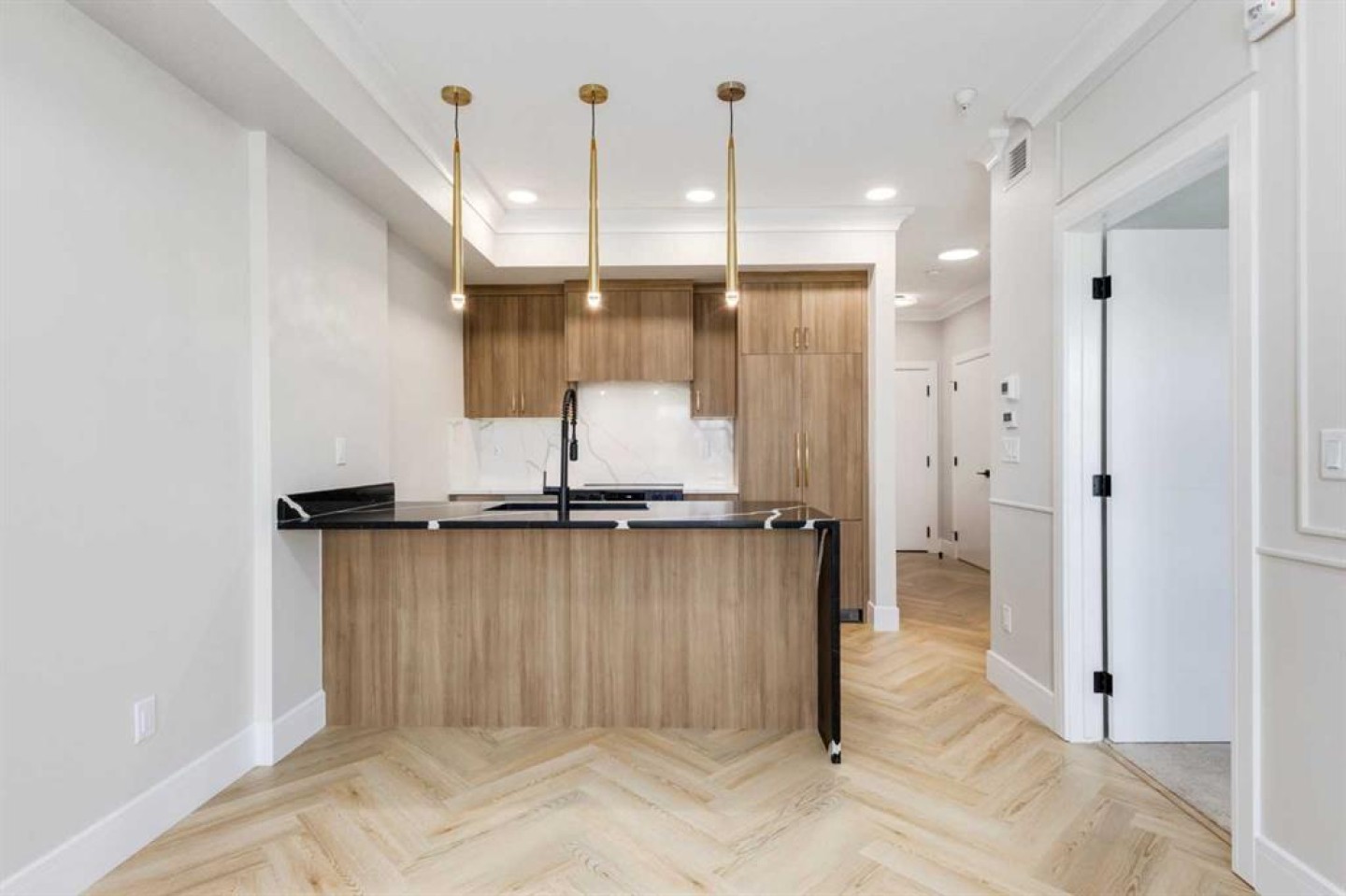 Welcome to the “Verde” floorplan by Rohit Homes—a thoughtfully designed 1-bedroom + den, 1-bathroom residence that perfectly balances comfort and style. Ideally situated on the 5th floor of Quesnay at Currie Barracks, this elevated home offers enhanced privacy along with beautiful natural light and west-facing views. Finished in the timeless Neoclassical Revival color palette, the interior showcases warm, refined tones and elegant detailing that create a sophisticated yet inviting atmosphere. The Verde floorplan is designed with both aesthetics and practicality in mind, featuring 9’ ceilings, quartz countertops with a waterfall edge, a coordinating quartz backsplash, full-height cabinetry, stainless steel appliances, designer light fixtures, and window coverings. The open-concept layout seamlessly connects the kitchen, dining, and living areas, making the space feel bright and expansive—perfect for entertaining or quiet evenings at home. The primary bedroom serves as a relaxing retreat, while the versatile den provides flexibility for a home office, study space, or additional storage. The bathroom offers a spa-inspired feel with fully tiled walls, polished finishes, and a tub/shower combination. Step outside onto your private west-facing balcony to enjoy sunset views and fresh air from your 5th-floor vantage point. This pet-friendly and AIRBNB-friendly building includes titled heated underground parking and ample visitor parking. Located just minutes from downtown, Mount Royal University, and the vibrant amenities of 17th Ave and Marda Loop, the Verde floorplan offers exceptional urban convenience paired with refined design. Don’t miss your opportunity to own this beautifully finished 5th-floor home. **Photos are taken from existing buildings of the same models and are not of the exact unit.**