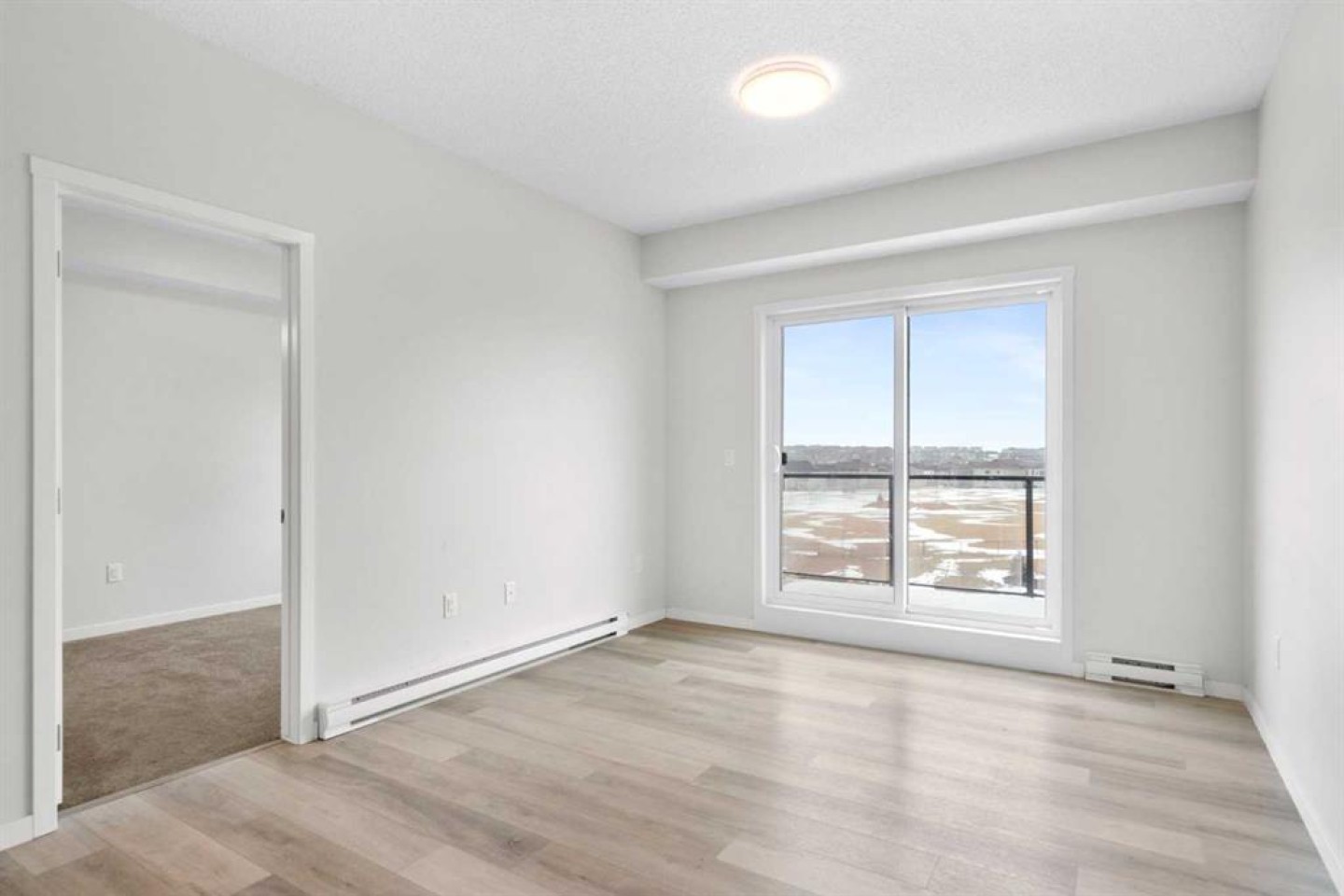 Modern, bright, and thoughtfully designed, welcome to this beautiful 2 bedroom, 2 bathroom condo in Carrington Plaza. Offering 842 sqft of well-planned living space, this east-facing unit enjoys excellent morning light and a unique sense of privacy thanks to the open field directly across the street, meaning no neighbours looking in. Inside, the open-concept layout creates an inviting flow between the kitchen, dining, and living areas, making the space ideal for both everyday living and entertaining. The modern kitchen features white quartz countertops, stainless steel appliances, light maple-toned cabinetry that extends to the ceiling, a white subway tile backsplash, pantry storage, and a convenient breakfast bar perfect for casual dining or morning coffee. Luxury vinyl plank (LVP) flooring runs throughout the main living areas, while the bedrooms offer soft carpeting for added comfort. One of the standout features of this home is the smart bedroom layout, with the two bedrooms positioned on opposite sides of the unit, ideal for privacy, guests, or a home office setup. The spacious primary bedroom easily accommodates a king-sized bed and connects to a walk-through area leading to your walk-in closet and private 4-piece ensuite. The ensuite features a full-sized shower and a double vanity with plenty of countertop space and storage. The second bedroom is also generously sized and includes its own walk-in closet, located just steps from the second full 4-piece bathroom with modern finishes that complement the rest of the home. Additional highlights include in-suite laundry with extra storage, a heated underground titled parking stall, and a separate storage locker. Located in the growing community of Carrington, you’ll enjoy quick access to Stoney Trail, major roadways, and nearby amenities, making commuting and everyday errands easy.