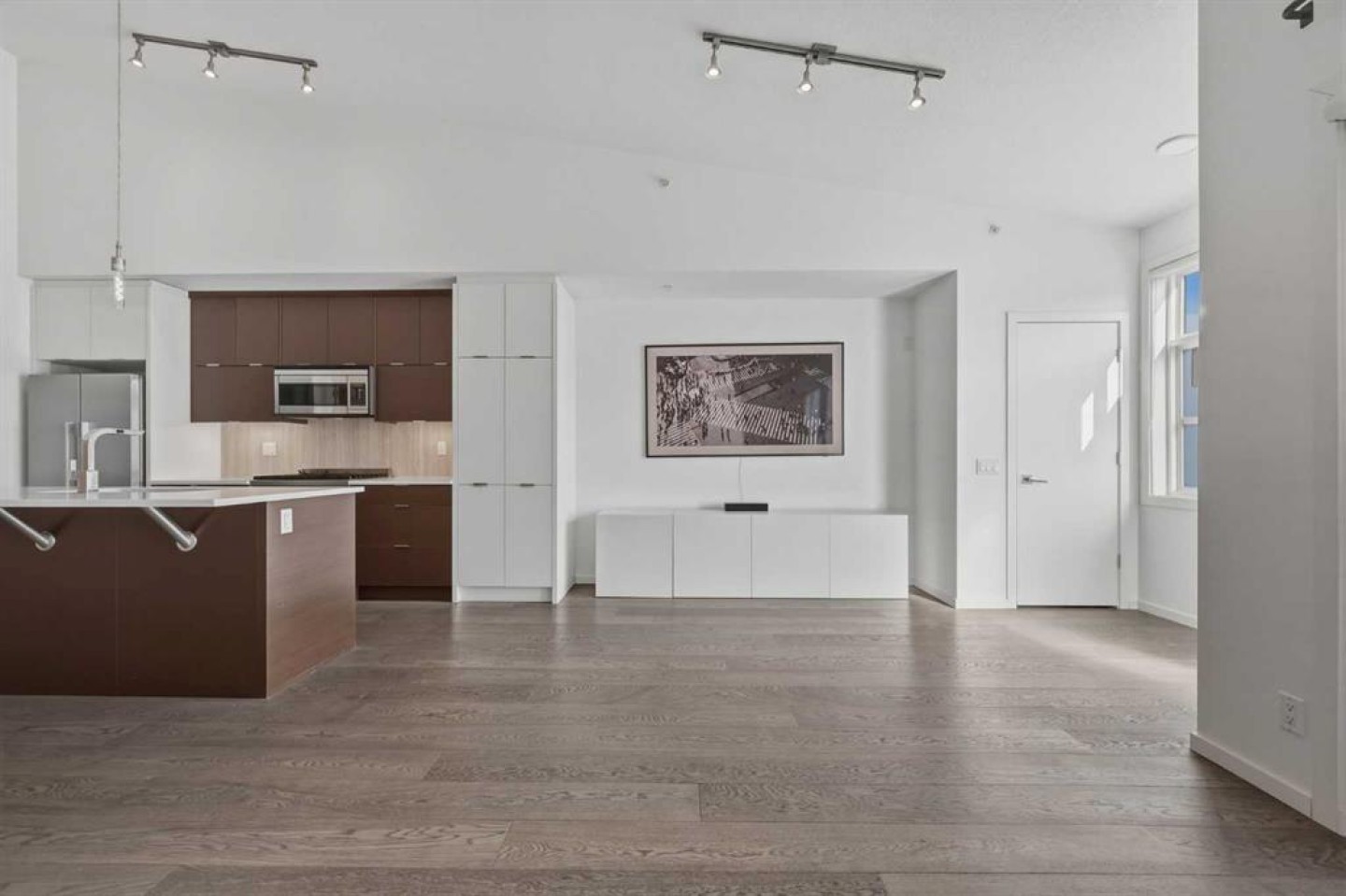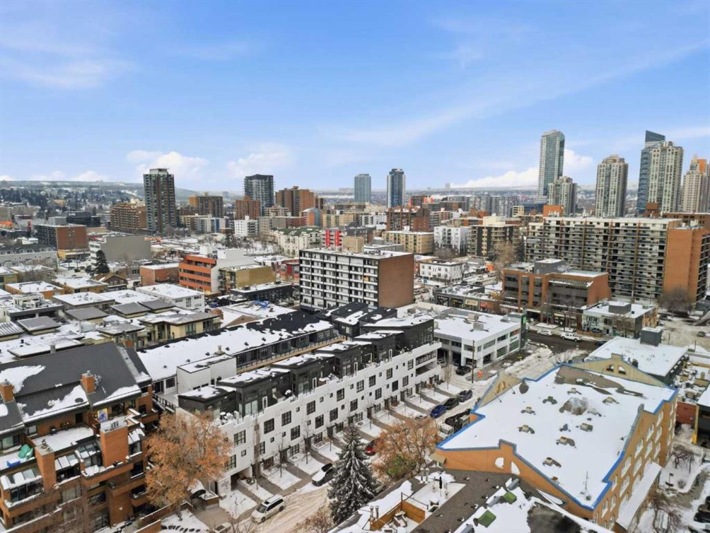 Lower Mount Royal – #433, 1719 9A Street SW: Welcome to The Block built by Avi Urban. This modern, TOP FLOOR unit offers 612 sq ft of living space plus a 99 sq ft loft (not included in measurements due to ceiling height), 1 bedroom, 1 bathroom, and titled underground parking. The bright entry opens to a vaulted living area with room for both living and dining, along with sliding doors leading to the patio overlooking the courtyard. The kitchen features quartz countertops, tile backsplash, a pantry, and stainless steel appliances, including a gas range, fridge, dishwasher, and microwave. The impressive 13-foot ceiling height in the primary bedroom has been transformed into a unique lofted feature designed by Calgary’s Studio North, creating a space that is both practical and distinctive. Thoughtfully redesigned, the bedroom offers a flexible layout with a walk-in closet, home office/fitness space on the main level, complemented by the private lofted sleeping area. Additional highlights include hardwood flooring throughout, in-suite laundry, air conditioning, and separate storage in the underground parkade. Ideally located in the vibrant community of Lower Mount Royal, just half a block from the energy of 17th Avenue, this home offers an exceptional walkable lifestyle with shops, restaurants, cafes, amenities, and public transit all just steps from your door. This cool, unique space is a must-see. Turn key with quick possession available.