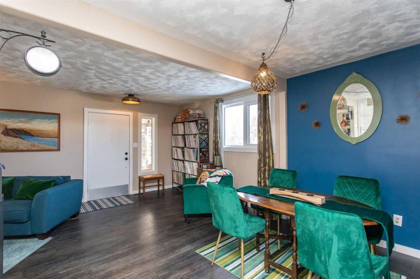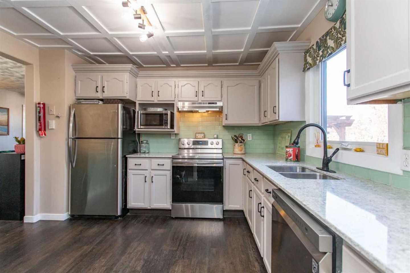 Welcome to this stylish two story home nestled in a sought after mature area known for its quiet streets and established trees. A stand out home with great curb appeal you can already picture yourself sitting on the large covered front porch savoring a morning coffee. Inside you will find a thoughtfully renovated interior where vintage, inspired details meet contemporary finishes. The low maintenance laminate flooring throughout the main floor is perfect for easy upkeep & durability plus a sculptured style ceiling enhances the additional details of the room. The open living room & dining combo is perfect for hosting guests keeping everyone in the social circle of things. Next you will find an updated kitchen which offers newer counter tops, stainless steel appliances plus cabinets have been resurfaced. Large butcher block style island comes with lots of extra drawers for your additional cook ware plus plenty of counter space for meal prep. Trendy wood feature wall plus ceiling trays give the home a unique feel. Convenient main floor laundry plus two piece powder room all in one. Custom storage shelves designed for music or video library. Upstairs offers a two large twin style Primary bedroom plan with dormer windows and storage cupboards for seasonal wear. The large main bath offers a deep soaker tub plus a separate shower. Windows have all been replaced in home, shingles have been updated, both furnace & Hot water tank recently replaced plus the electrical panel has been upgraded as well. Extensive landscaping has been done throughout the years giving the backyard its own private oasis. Plenty of flowering trees and low maintenance shrubs, huge two tier double deck plus fire pit area all make for an enjoyable spring to look forward to. Double detached garage is not only ideal for vehicle storage but could also substitute for someone wanting a hobby space. Home is also within close proximity to neighborhood schools, parks and local shopping amenities.