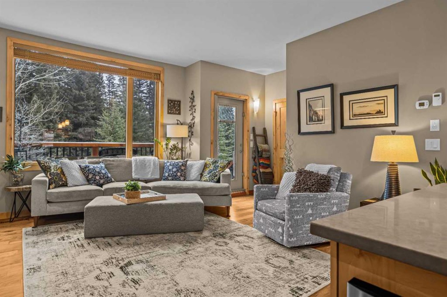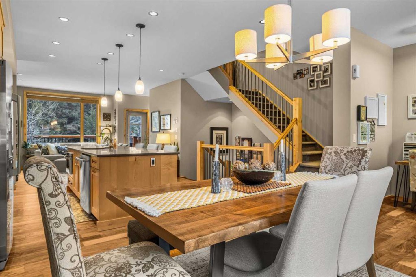 Set directly along the banks of Policeman’s Creek, this 4-bedroom, 3.5-bathroom, over 2,000sqft villa offers a rare opportunity in Spring Creek Mountain Village, all just steps from downtown Canmore. The entry level features a heated single-car garage, two bedrooms, a full bathroom, and a dedicated laundry area, ideal for guests, family, or a flexible workspace. The main living level is open and inviting, anchored by warm hardwood flooring and expansive windows that frame the creek and surrounding trees. The kitchen is well-appointed with quartz countertops, stainless steel appliances, generous cabinetry, and a large island suited for gatherings. The dining area opens to a secondary deck, while the living room is centered around a striking Rundle stone fireplace and provides direct access to the primary deck, with stairs leading down to the creekside patio. The upper level is dedicated to the primary retreat, featuring vaulted ceilings, a walk-in closet, and a spacious 5-piece ensuite. A fourth bedroom with its own 3-piece ensuite completes this level, offering privacy and flexibility for guests. Outdoor living is a defining feature of this home, with multiple decks and patio spaces designed to fully embrace the creekside setting. A peaceful location immersed in nature, yet within easy walking distance of Main Street, trails, restaurants, and shops this is Canmore living at its finest.