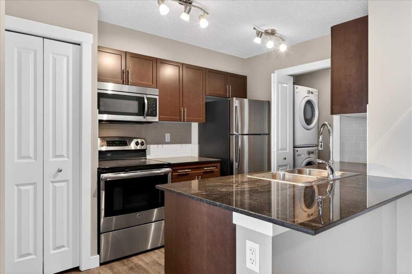 Dishwasher, Electric Stove, Microwave Hood Fan, Refrigerator, Washer/Dryer Stacked