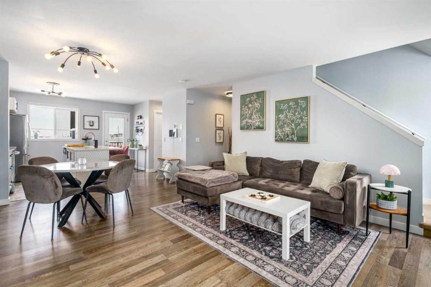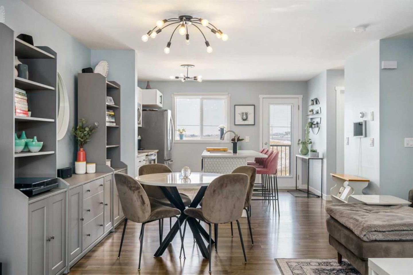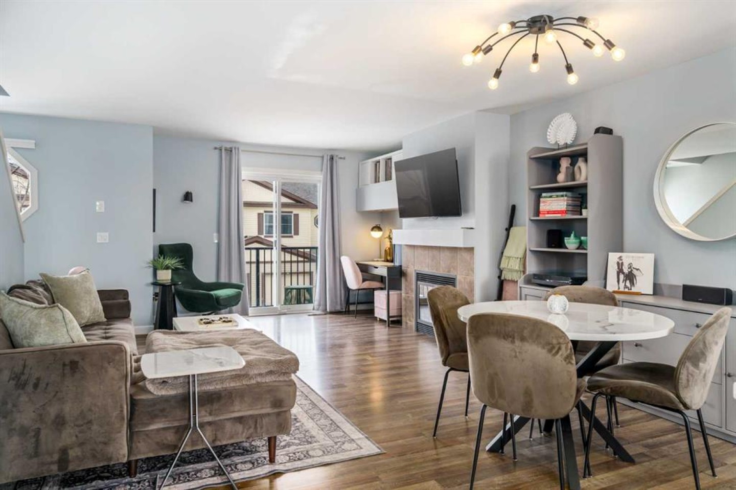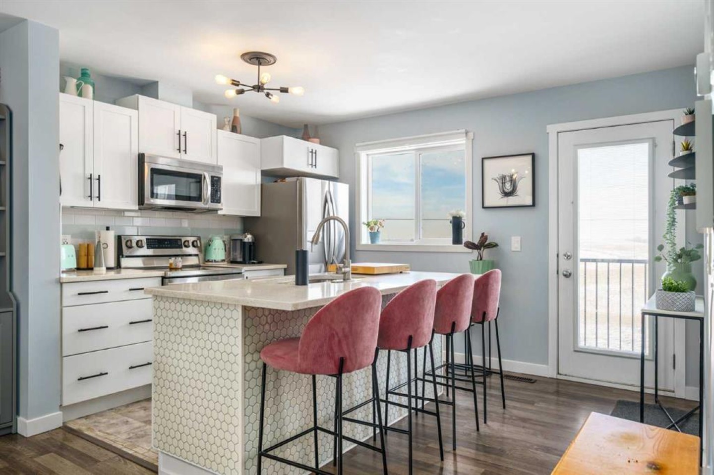 Welcome to Aura in Copperfield, a beautifully finished 3-storey townhome that pairs an elevated interior with a premium backdrop of open green space and wetlands behind. From the moment you arrive, the layout just works for real life. The entry level offers a single attached garage and a bright flex/office space that’s perfect for a home workspace, Peloton room, play area, or a cozy TV den, plus it walks out to a lower patio, making summer evenings and weekend lounging feel effortless. Upstairs, the main floor is where everyone naturally gathers, finished with laminate flooring throughout and an airy, light-filled feel. The rear kitchen is crisp and contemporary with white cabinetry, quartz countertops, and a generous island wrapped in a standout hexagon tile detail, the kind of finish that instantly feels more custom. Add tile flooring, newer stainless appliances, and thoughtful storage (including two closets by the kitchen that easily function as a pantry and broom/utility closet), and you’ve got a space that’s as practical as it is stylish. The dining area sits right in the center of the floor plan—anchored by a modern light fixture, making it ideal for everything from casual weeknight dinners to hosting friends, and yes, it sets up perfectly for those holiday meals where everyone ends up lingering at the table. At the front of the home, the living room is impressively sized and inviting, featuring a central fireplace with a tile surround and access to a second deck, great for catching the sun, sipping coffee, or creating a little outdoor lounge zone separate from the kitchen deck. On the top floor you’ll find three bedrooms, including a spacious primary retreat with a walk-in closet and 4-piece ensuite, plus two additional bedrooms at the back with large windows and another 4-piece bath conveniently placed just outside their doors. Set within a well-established southeast Calgary community known for its parks, ponds, and interconnected pathways, Copperfield offers a lifestyle that’s easy to love—whether it’s evening walks, bike rides, playground time, or meeting neighbours at local green spaces. Residents also enjoy access to the Copperfield Community Association amenities and programming, including community gathering spaces and seasonal features like outdoor recreation. And when it’s time to get around the city, you’re well-positioned with convenient access to major routes like Stoney Trail and Deerfoot Trail, plus everyday shopping and services nearby.