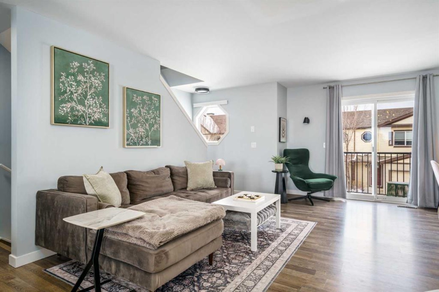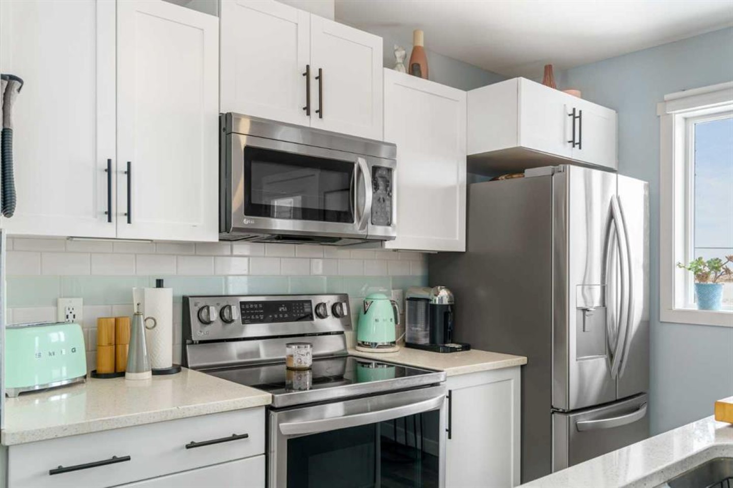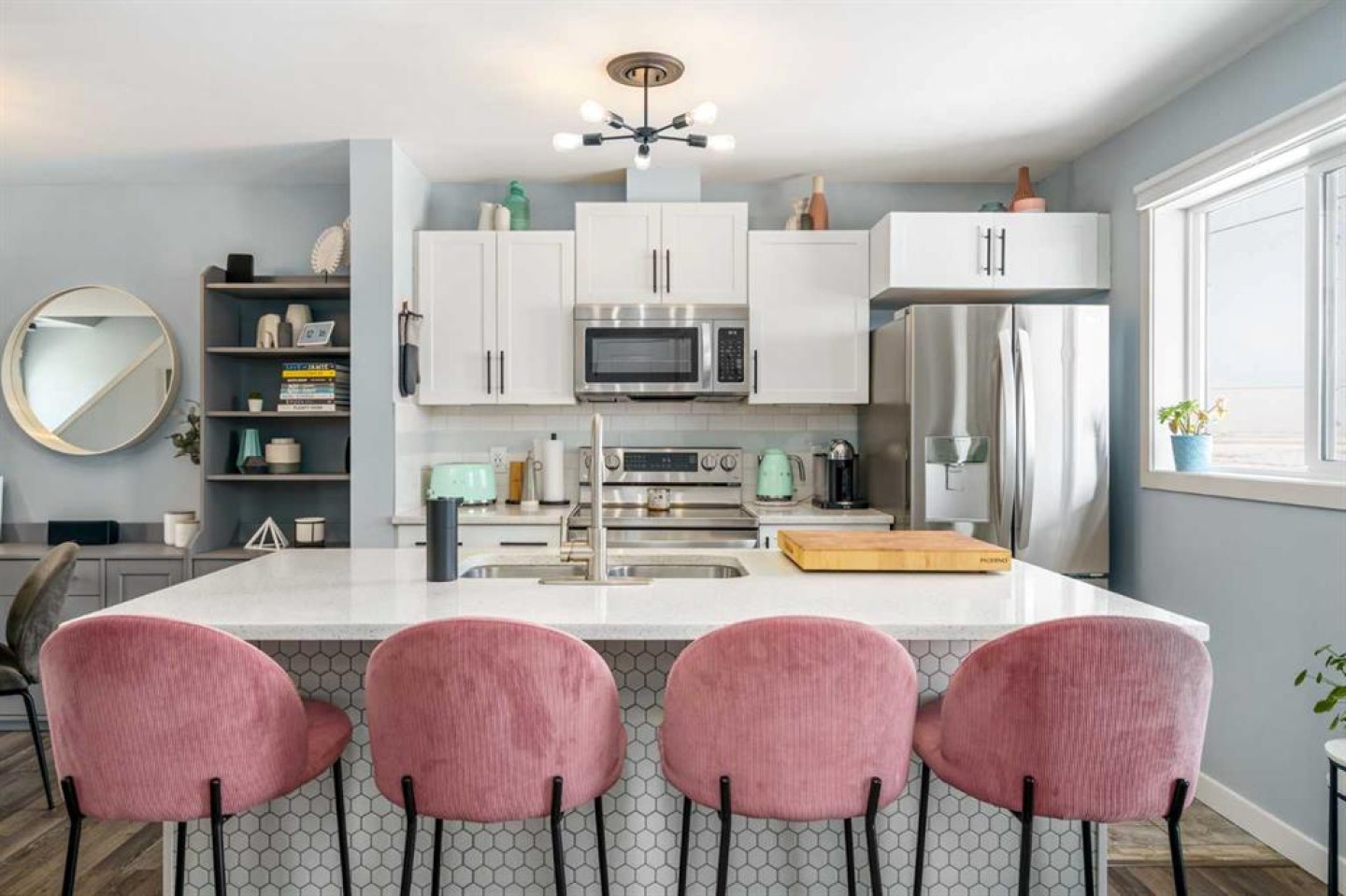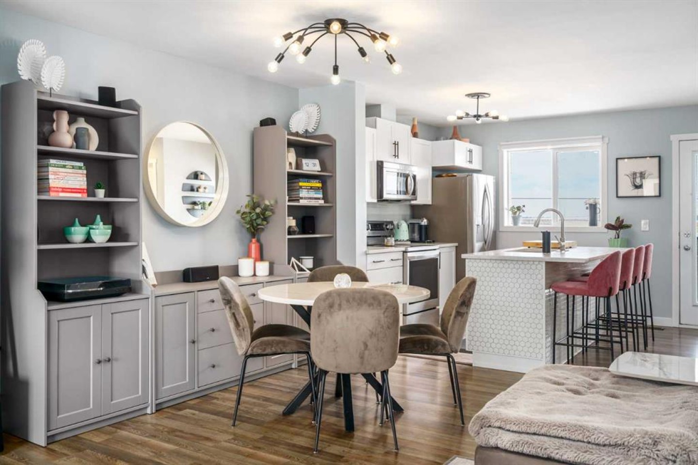 Welcome to Aura in Copperfield, a beautifully finished 3-storey townhome that pairs an elevated interior with a premium backdrop of open green space and wetlands behind. From the moment you arrive, the layout just works for real life. The entry level offers a single attached garage and a bright flex/office space that’s perfect for a home workspace, Peloton room, play area, or a cozy TV den, plus it walks out to a lower patio, making summer evenings and weekend lounging feel effortless. Upstairs, the main floor is where everyone naturally gathers, finished with laminate flooring throughout and an airy, light-filled feel. The rear kitchen is crisp and contemporary with white cabinetry, quartz countertops, and a generous island wrapped in a standout hexagon tile detail, the kind of finish that instantly feels more custom. Add tile flooring, newer stainless appliances, and thoughtful storage (including two closets by the kitchen that easily function as a pantry and broom/utility closet), and you’ve got a space that’s as practical as it is stylish. The dining area sits right in the center of the floor plan—anchored by a modern light fixture, making it ideal for everything from casual weeknight dinners to hosting friends, and yes, it sets up perfectly for those holiday meals where everyone ends up lingering at the table. At the front of the home, the living room is impressively sized and inviting, featuring a central fireplace with a tile surround and access to a second deck, great for catching the sun, sipping coffee, or creating a little outdoor lounge zone separate from the kitchen deck. On the top floor you’ll find three bedrooms, including a spacious primary retreat with a walk-in closet and 4-piece ensuite, plus two additional bedrooms at the back with large windows and another 4-piece bath conveniently placed just outside their doors. Set within a well-established southeast Calgary community known for its parks, ponds, and interconnected pathways, Copperfield offers a lifestyle that’s easy to love—whether it’s evening walks, bike rides, playground time, or meeting neighbours at local green spaces. Residents also enjoy access to the Copperfield Community Association amenities and programming, including community gathering spaces and seasonal features like outdoor recreation. And when it’s time to get around the city, you’re well-positioned with convenient access to major routes like Stoney Trail and Deerfoot Trail, plus everyday shopping and services nearby.