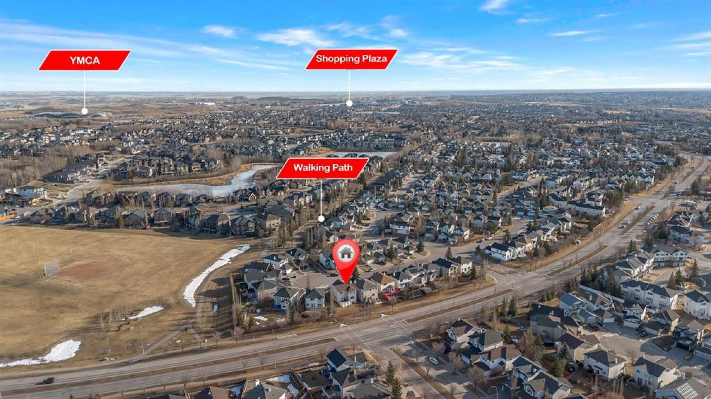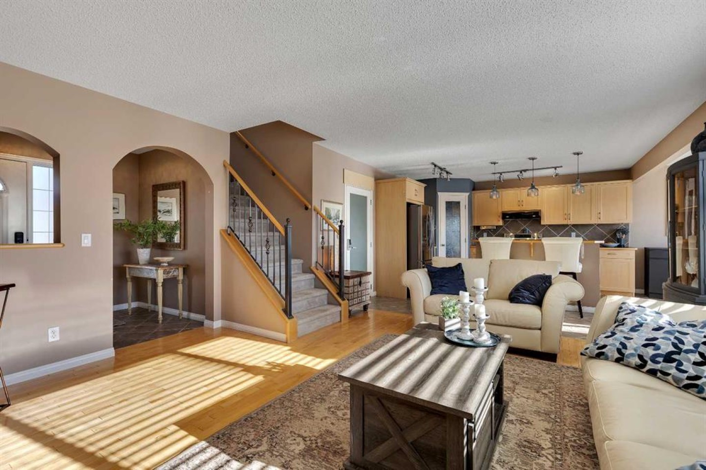 Stunning family home with spectacular mountain views in a quiet cul-de-sac location with no neighbours behind! Offering 1,909 SQFT above grade plus an additional 710 SQFT in the fully developed basement, this beautifully designed home delivers exceptional space, comfort, and lifestyle appeal. The main floor features rich hardwood flooring, a bright, functional island kitchen with a pantry, and spacious living and dining areas ideal for entertaining. A cozy main floor fireplace creates a warm focal point, while expansive windows fill the home with natural light and frame breathtaking mountain views. The west facing backyard is perfect for enjoying evening sunsets and outdoor gatherings. Upstairs features 4 generous bedrooms plus a large bonus room with its own fireplace, creating an ideal family retreat. The impressive primary suite offers vaulted ceilings, a private ensuite bath, and a spacious walk-in closet. The fully developed basement adds incredible versatility with massive windows, a third fireplace, separate thermostat control, and a convenient kitchenette with its own fridge, perfect for extended family or multi-generational living. This home offers 3 full bathrooms and 1 half bath, a rare total of 3 fireplaces, and stunning views from all levels. Ideally located close to transit and surrounded by expansive open spaces, soccer fields, and numerous nature pathways throughout the neighbourhood. Just three blocks from the community recreation area, featuring tennis courts, playgrounds, a rowing lake for summer enjoyment, and skating in the winter, creating a true year round outdoor lifestyle. A rare opportunity combining privacy, views, space, and an unbeatable family-friendly location.