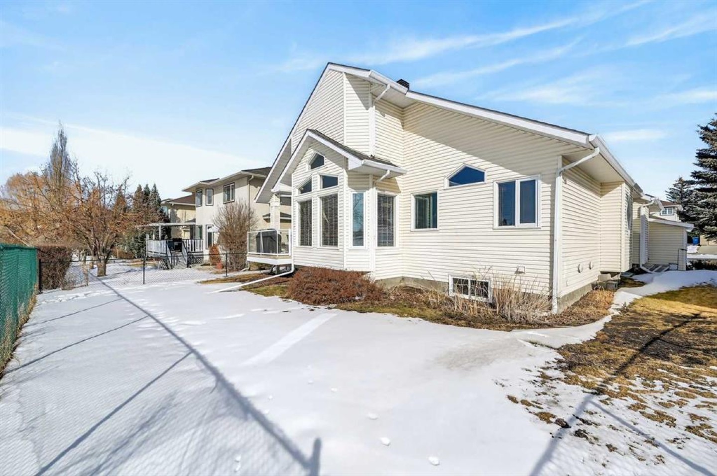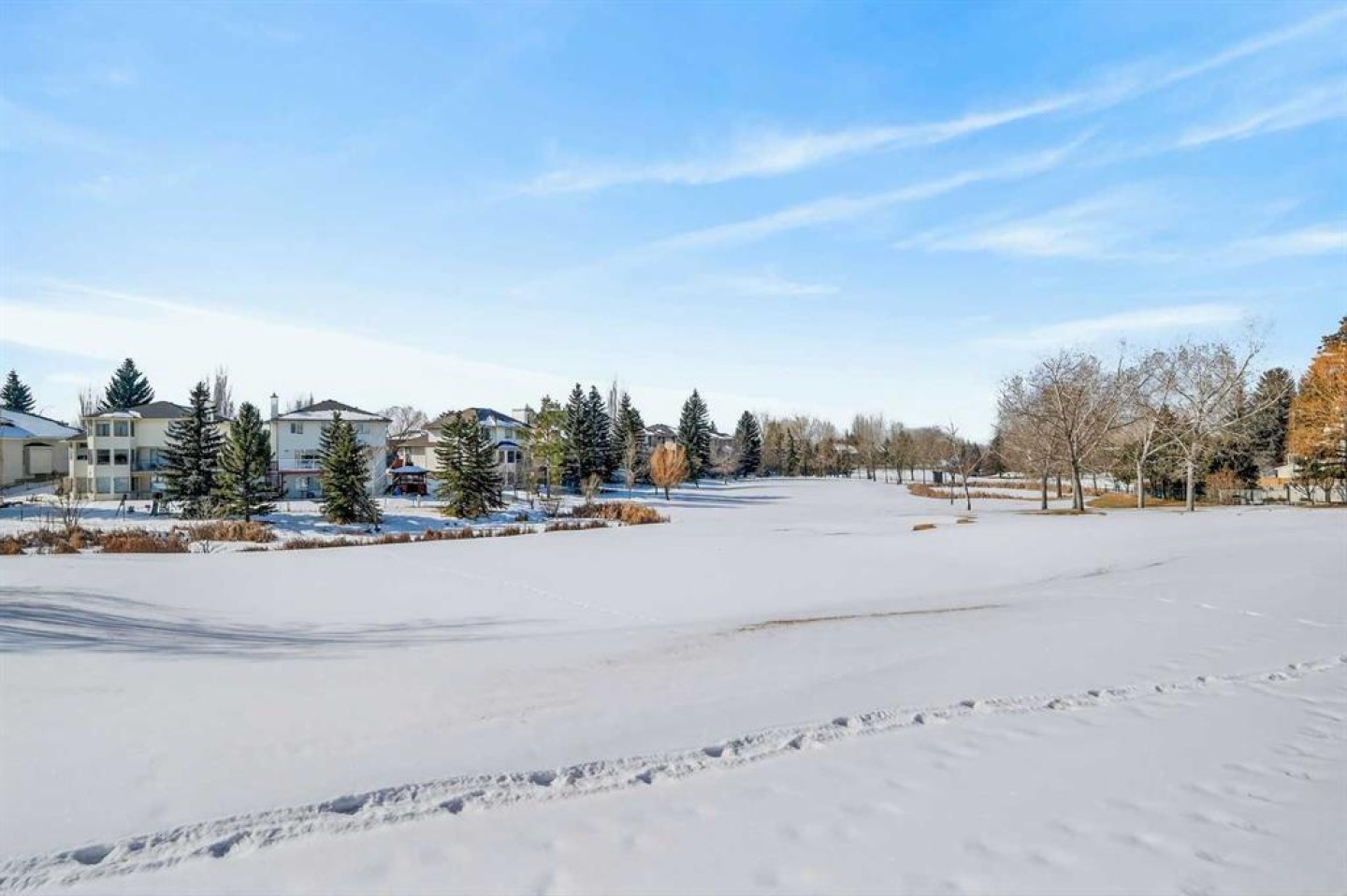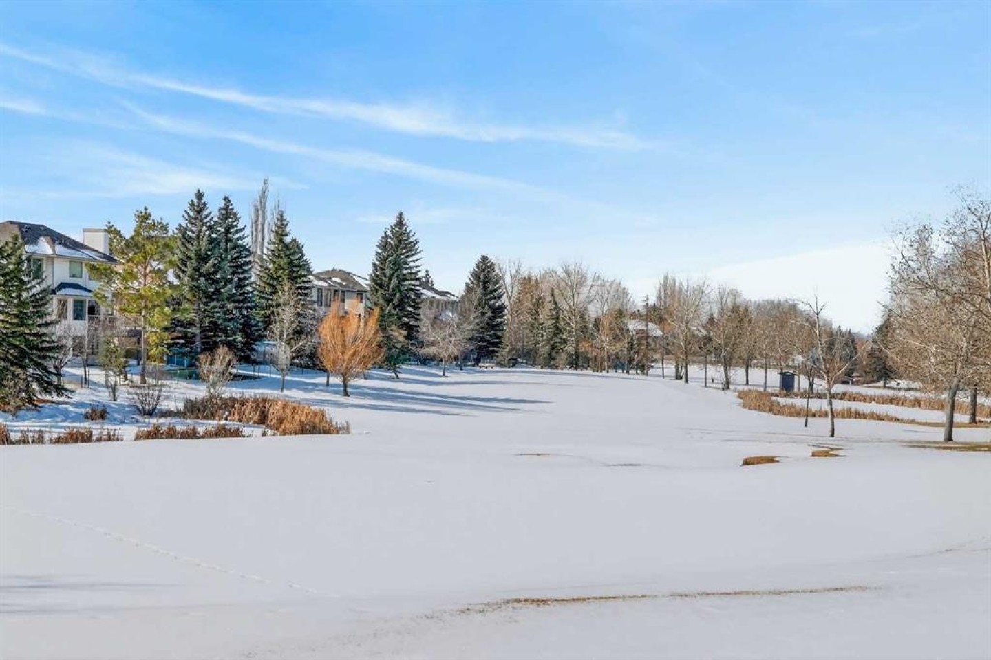 Open House this Sunday March 8 from 2-4pm Perfectly positioned in the sought-after community of Douglasdale Estates, this executive fully finished bungalow backs directly onto the golf course, offering a rare combination of privacy, views, and everyday luxury living in one of Calgary’s most established estate neighborhoods. Vaulted ceilings span the main floor, creating an airy, light-filled atmosphere that enhances the home’s spacious design and architectural appeal. The open-concept layout seamlessly connects the kitchen, dining, and living spaces — ideal for entertaining or relaxed daily living. The kitchen features hardwood flooring, skylight, white cabinetry, stainless steel appliances, and a functional layout overlooking the eating area with access to a covered deck perfect for enjoying peaceful golf course views year-round. A striking three-way gas fireplace anchors the main living space, adding warmth and ambiance throughout. The main level offers two bedrooms, including a generous primary retreat with a full ensuite featuring dual sinks, separate shower, and jetted soaker tub, plus an additional full bathroom and a versatile front flex room originally designed as a formal dining space. Downstairs, the fully finished lower level with in-floor heating expands your lifestyle possibilities with two additional bedrooms, full bathroom, family/media area, and dedicated office space — ideal for guests, multigenerational living, or working from home. Additional value features include a double-attached garage, completed Poly-B plumbing replacement. Rare opportunity to secure a move-in-ready executive bungalow on a golf course lot in a prestigious, amenity-rich community.