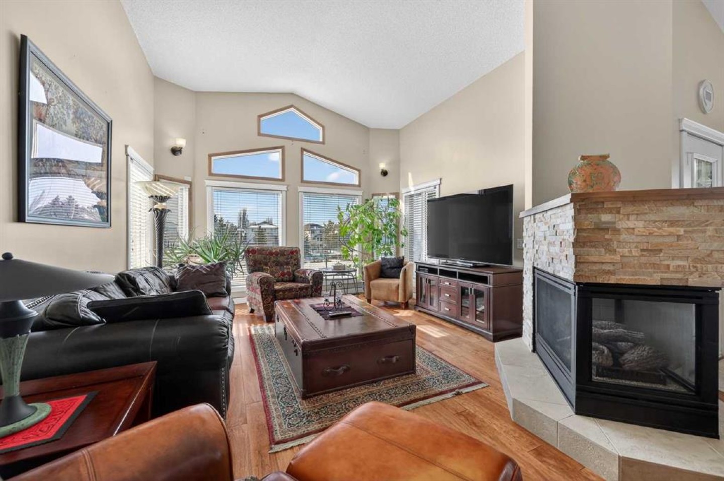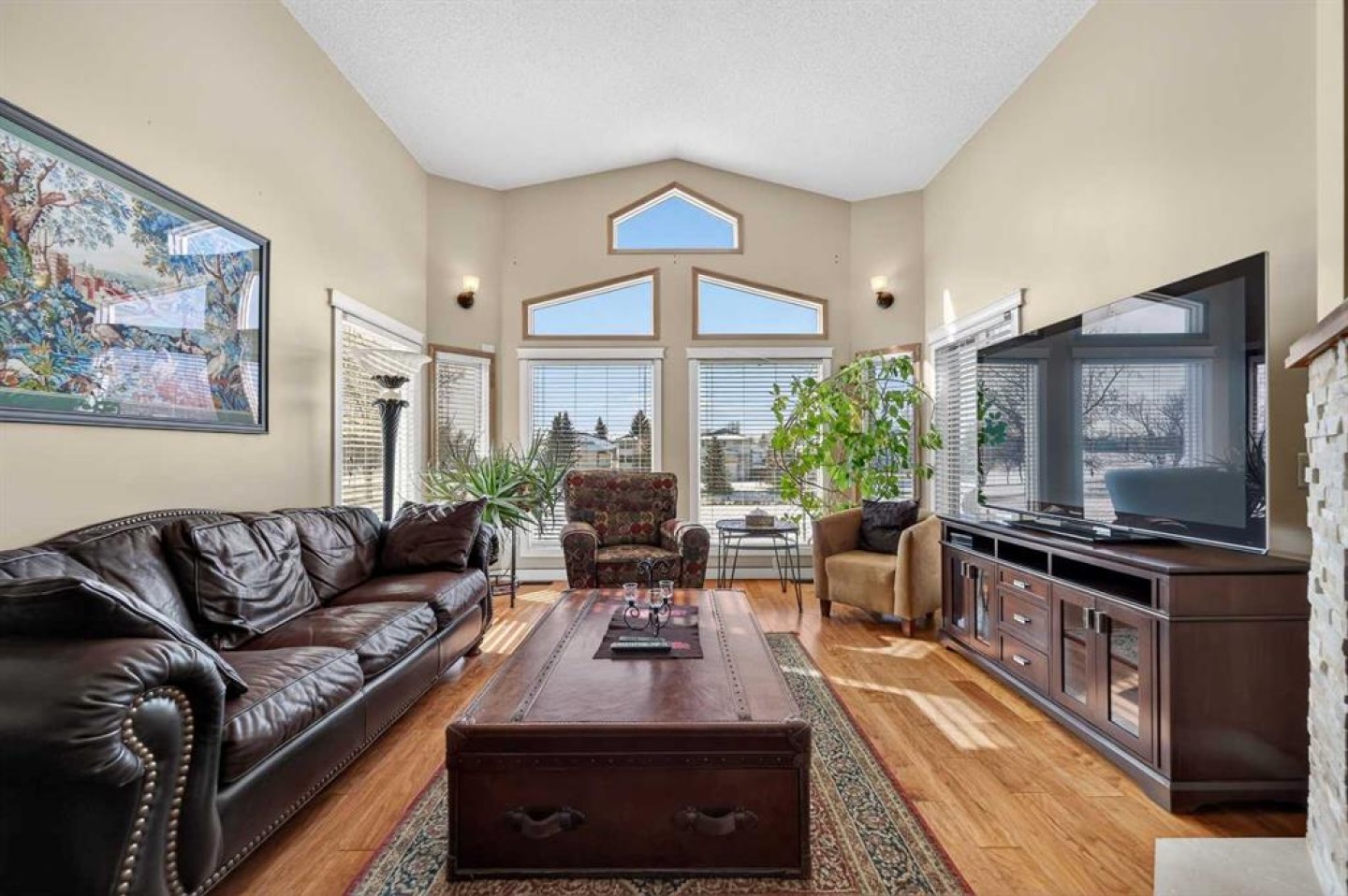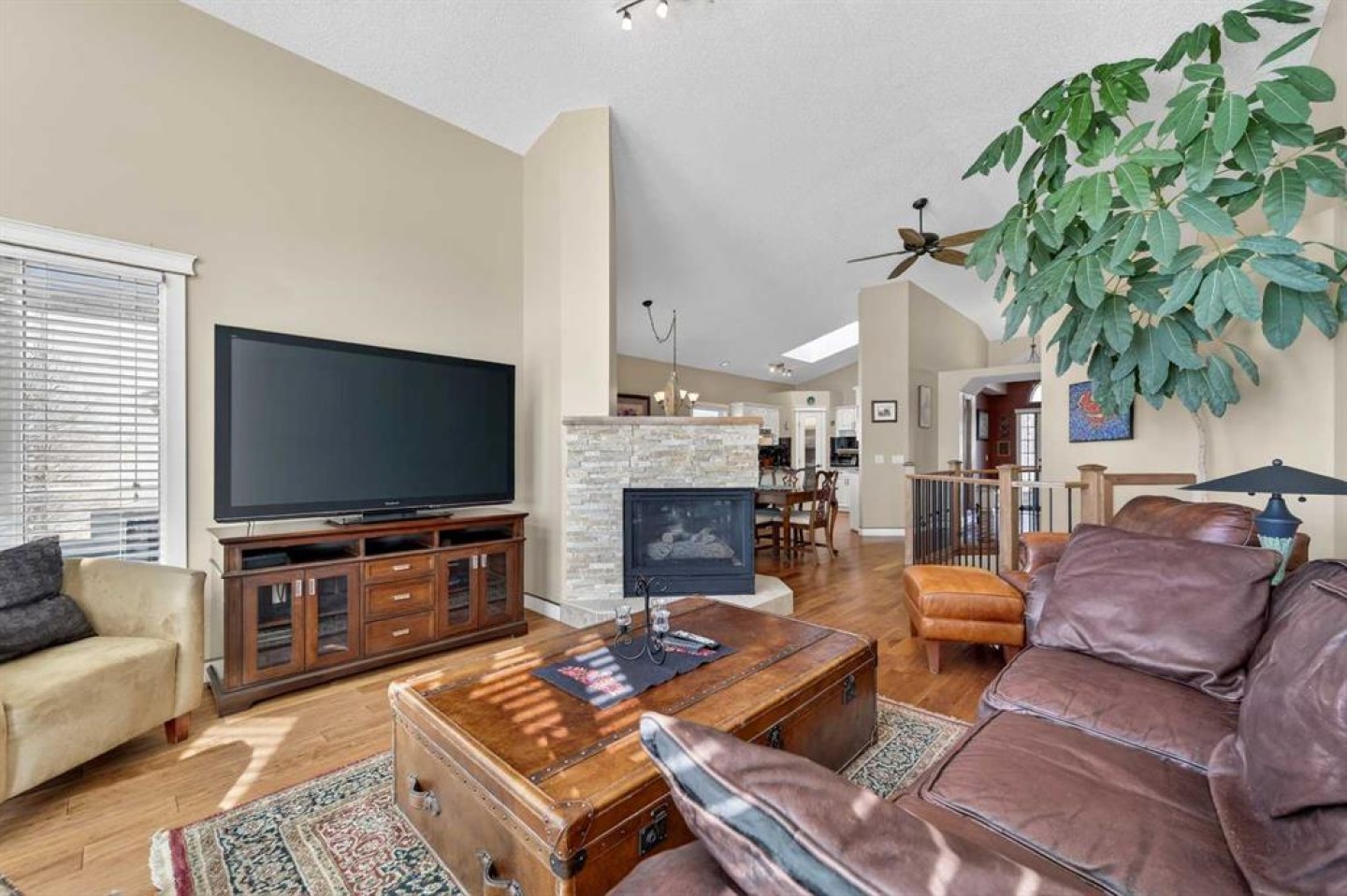 Open House this Sunday March 8 from 2-4pm Perfectly positioned in the sought-after community of Douglasdale Estates, this executive fully finished bungalow backs directly onto the golf course, offering a rare combination of privacy, views, and everyday luxury living in one of Calgary’s most established estate neighborhoods. Vaulted ceilings span the main floor, creating an airy, light-filled atmosphere that enhances the home’s spacious design and architectural appeal. The open-concept layout seamlessly connects the kitchen, dining, and living spaces — ideal for entertaining or relaxed daily living. The kitchen features hardwood flooring, skylight, white cabinetry, stainless steel appliances, and a functional layout overlooking the eating area with access to a covered deck perfect for enjoying peaceful golf course views year-round. A striking three-way gas fireplace anchors the main living space, adding warmth and ambiance throughout. The main level offers two bedrooms, including a generous primary retreat with a full ensuite featuring dual sinks, separate shower, and jetted soaker tub, plus an additional full bathroom and a versatile front flex room originally designed as a formal dining space. Downstairs, the fully finished lower level with in-floor heating expands your lifestyle possibilities with two additional bedrooms, full bathroom, family/media area, and dedicated office space — ideal for guests, multigenerational living, or working from home. Additional value features include a double-attached garage, completed Poly-B plumbing replacement. Rare opportunity to secure a move-in-ready executive bungalow on a golf course lot in a prestigious, amenity-rich community.