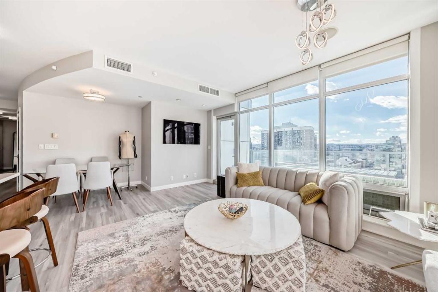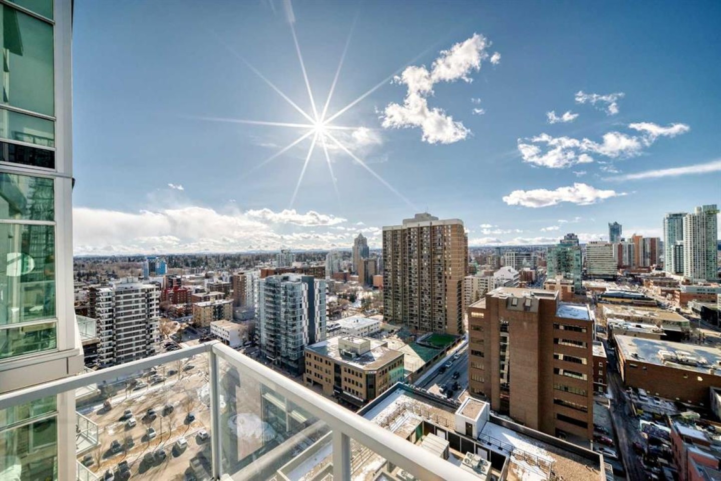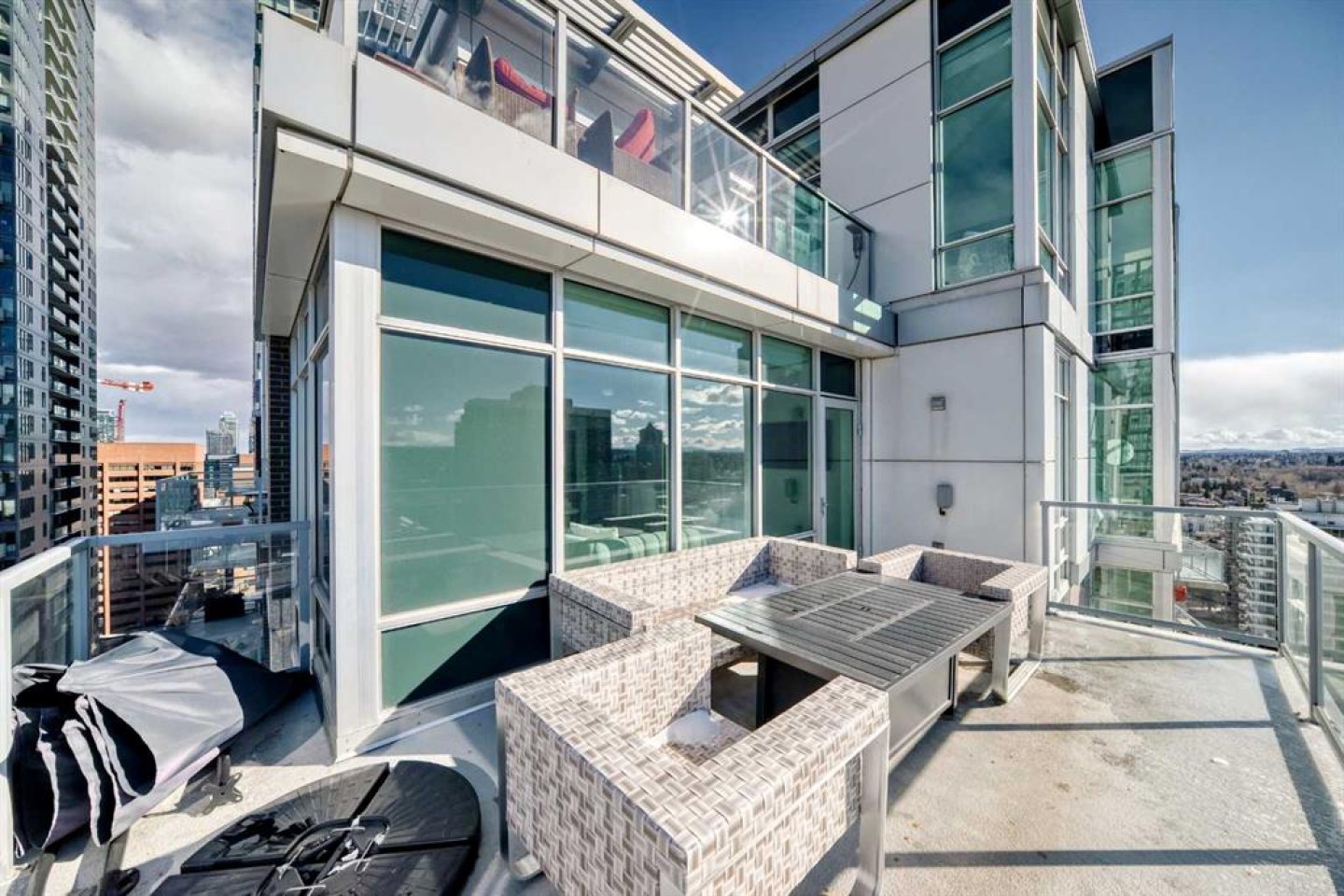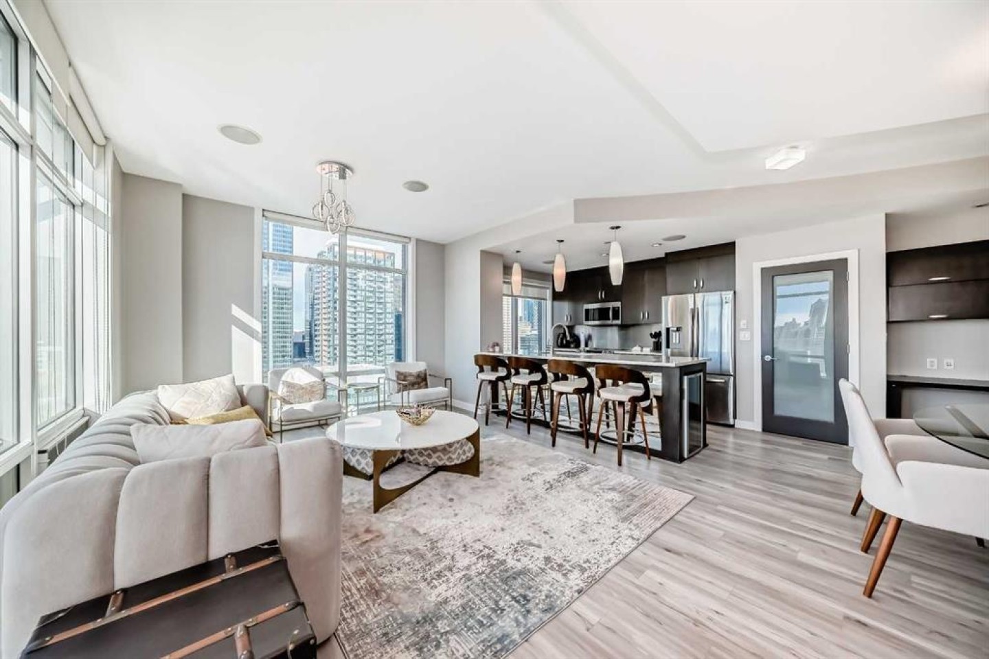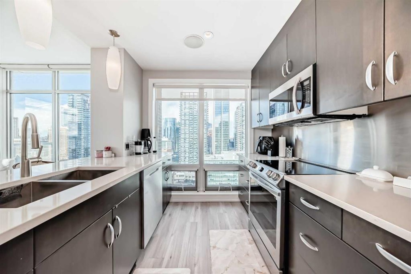Sub Penthouse!! Experience elevated urban living in this stunning executive condo, featuring unobstructed panoramic city and mountain views. Flooded with natural light by day and illuminated by the glow of city lights at night, this spacious and immaculate suite offers an open floor plan with 9-ft ceilings, floor-to-ceiling windows, modern floors, and solid concrete construction. The generous kitchen is designed for both everyday living and entertaining, complete with extensive cabinetry, stainless steel appliances, quartz countertops, and a built-in wine cooler. The bright living area is surrounded by glass and seamlessly extends to an impressive 190 sq. ft. balcony with sweeping city views, creating the perfect setting for entertaining or relaxing while enjoying spectacular sunsets and the vibrant downtown skyline. The primary retreat features a spa-inspired ensuite with quartz counters, double vanity, large glass-enclosed steam shower, and walk-in closet. A spacious second bedroom, full bath, and convenient laundry complete the interior. Additional highlights include central air conditioning, titled storage locker, and 2 titled parking stalls. Ideally located in the heart of Calgary’s vibrant urban core, this exceptional residence offers the perfect blend of luxury, comfort, and lifestyle.