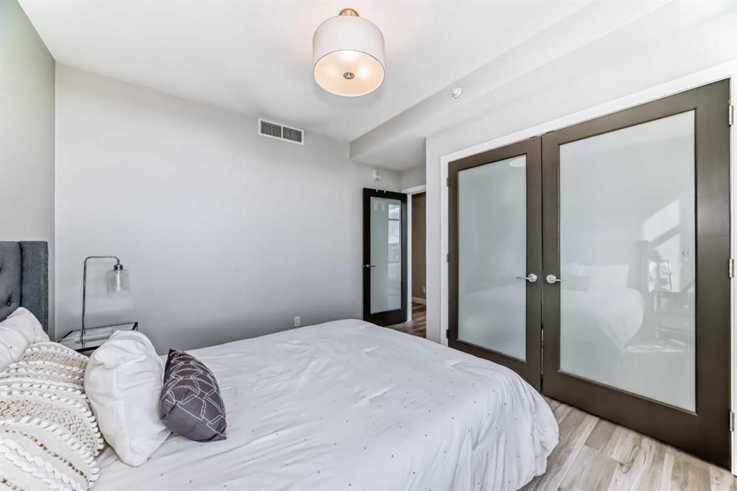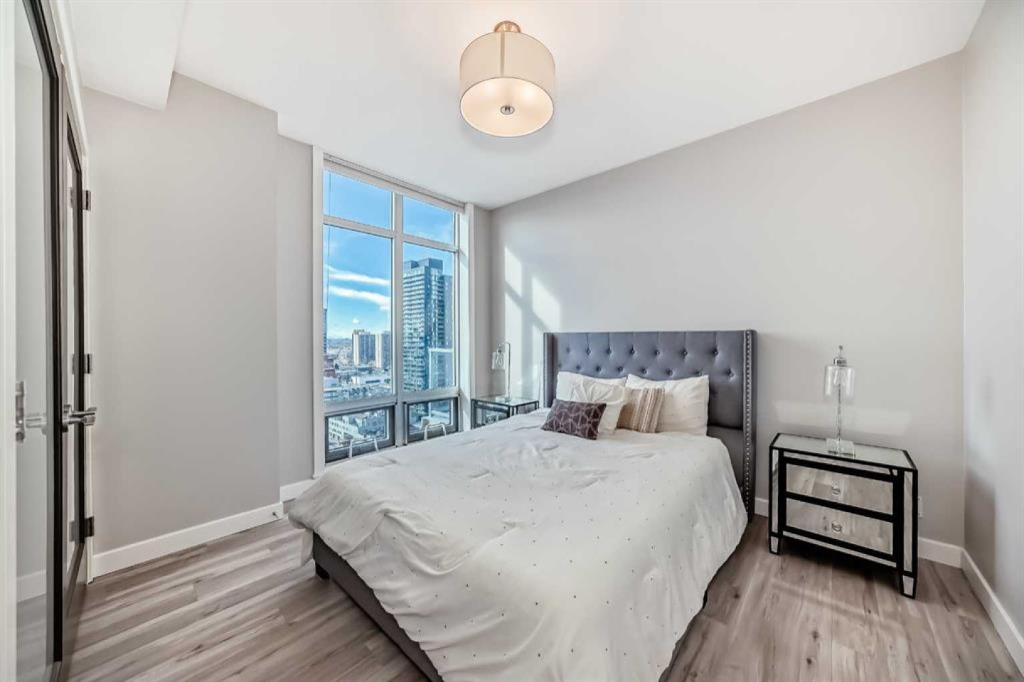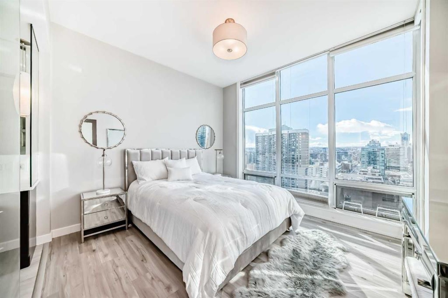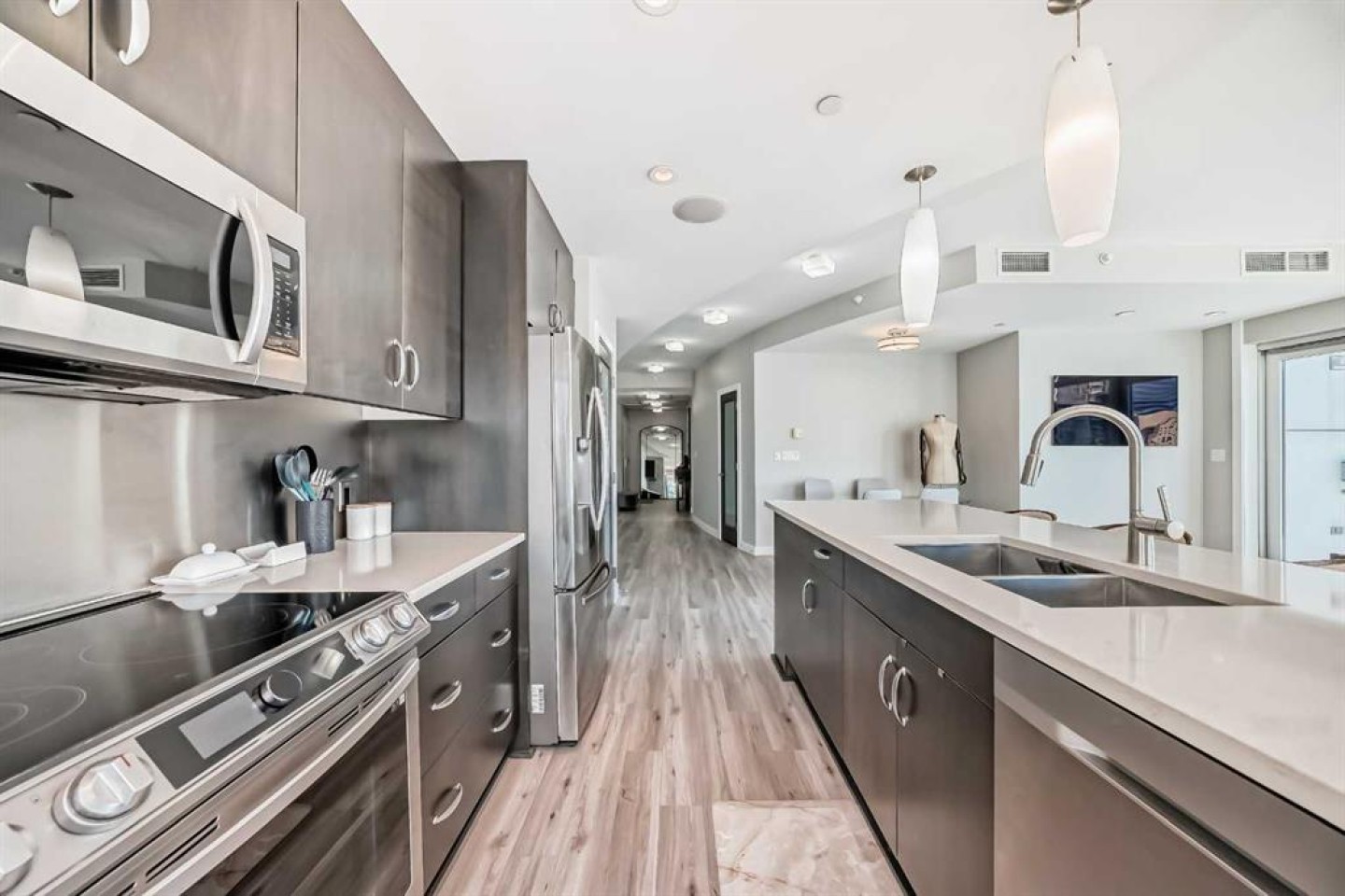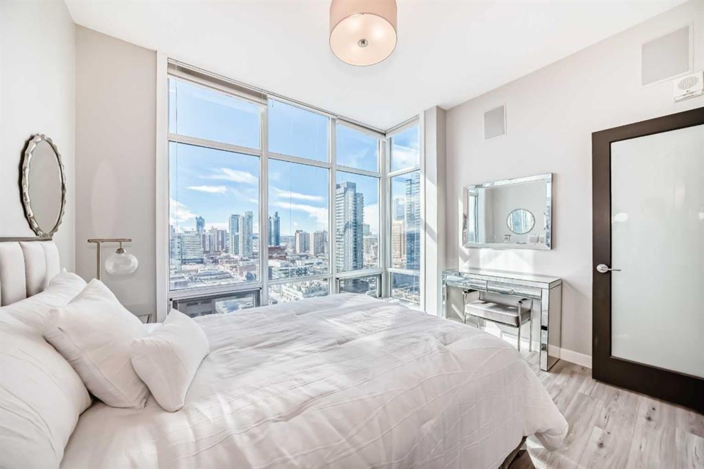 Sub Penthouse!! Experience elevated urban living in this stunning executive condo, featuring unobstructed panoramic city and mountain views. Flooded with natural light by day and illuminated by the glow of city lights at night, this spacious and immaculate suite offers an open floor plan with 9-ft ceilings, floor-to-ceiling windows, modern floors, and solid concrete construction. The generous kitchen is designed for both everyday living and entertaining, complete with extensive cabinetry, stainless steel appliances, quartz countertops, and a built-in wine cooler. The bright living area is surrounded by glass and seamlessly extends to an impressive 190 sq. ft. balcony with sweeping city views, creating the perfect setting for entertaining or relaxing while enjoying spectacular sunsets and the vibrant downtown skyline. The primary retreat features a spa-inspired ensuite with quartz counters, double vanity, large glass-enclosed steam shower, and walk-in closet. A spacious second bedroom, full bath, and convenient laundry complete the interior. Additional highlights include central air conditioning, titled storage locker, and 2 titled parking stalls. Ideally located in the heart of Calgary’s vibrant urban core, this exceptional residence offers the perfect blend of luxury, comfort, and lifestyle.