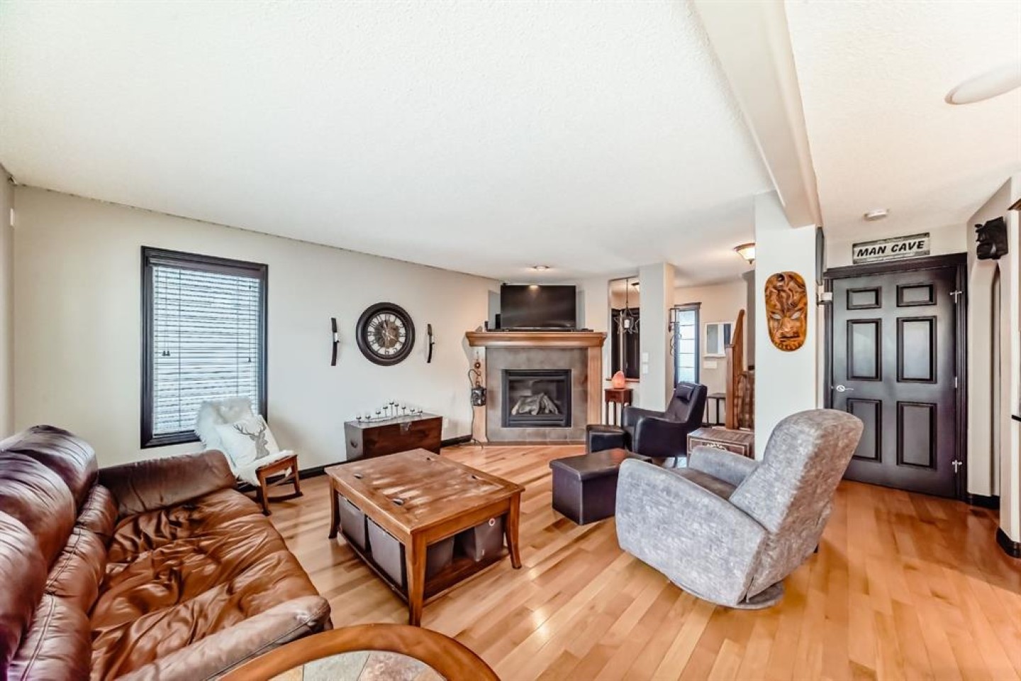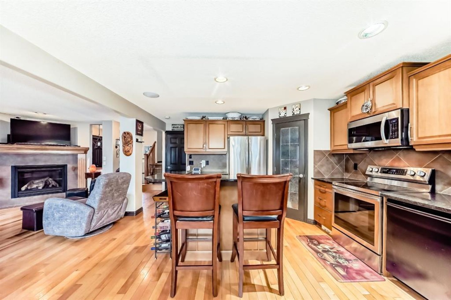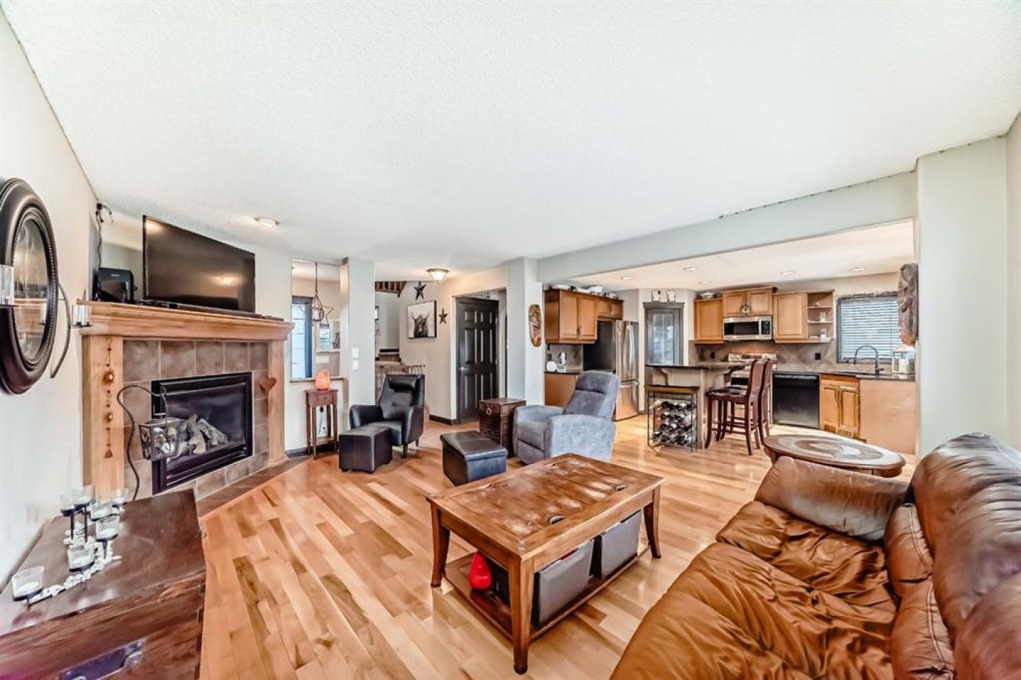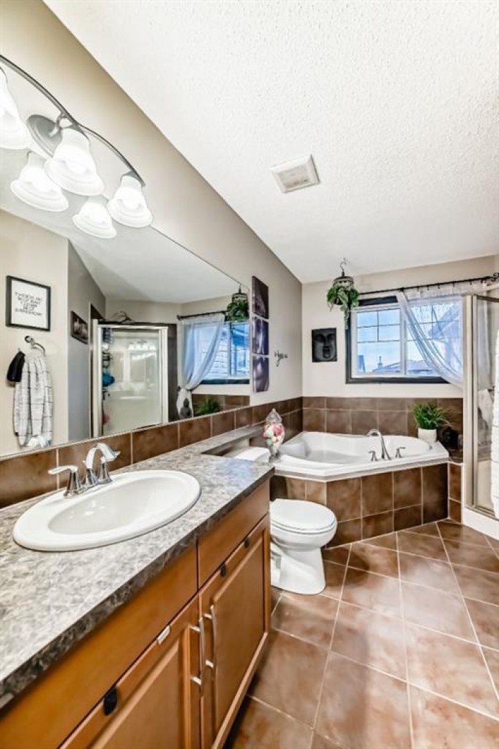 Welcome to your new home at 2071 Sagewood Rise in the family friendly community of Sagewood. This fully finished, meticulously maintained 2-storey residence offers exceptional curb appeal with a beautifully manicured front yard featuring lush shrubs, neat landscaping, and thoughtful details that welcome you home every day. Step inside through the tiled entry foyer, which flows seamlessly into an open and inviting main floor plan adorned with genuine hardwood flooring throughout. The spacious living room is a cozy focal point, highlighted by a stylish corner fireplace with an elegant mantle and tile surround, complemented by in-ceiling speakers for effortless entertainment. Large, ample windows bathe the space in natural light, creating a bright and airy atmosphere. The heart of the home is the upgraded kitchen, featuring newer SS appliances, granite countertops, an undermount granite sink, and abundant cabinetry with generous storage. A convenient corner pantry keeps everything organized, while the spacious dining area overlooks the stunning south-facing rear yard—perfect for family meals or hosting gatherings with views of your private outdoor oasis. Upstairs, the layout provides excellent separation for privacy, featuring a large bonus room ideal for movie nights or relaxation, complete with in-ceiling speakers, abundant natural light from numerous windows, and a striking feature wall. The primary bedroom is a true retreat, offering a 4pc ensuite bathroom with a large corner soaker tub, a standalone shower, and a generous walk-in closet. Two additional well-sized bedrooms and a full 4pc main bathroom complete this level. The fully developed basement serves as the ultimate “man cave” or family entertainment space, including a large living area anchored by another corner fireplace, two additional bedrooms for extended family, guests, or a home office setup, and a convenient 3-piece bathroom. Outside, the south-facing backyard is an absolute paradise designed for year-round enjoyment and privacy. Relax in the nearly new (2-year-old) Master Spa hot tub, fully enclosed for seclusion. A secondary private lounge area beneath the pergola offers another tranquil retreat. The yard is beautifully landscaped with numerous perennials and mature shrubs, a dedicated dog run for your furry friends, and a handy storage shed. The attached garage is a standout feature, complete with a built-in heater for year-round comfort, plus numerous wood shelving units—including upper shelving designed for larger items—providing excellent organized storage for tools, seasonal gear, sports equipment, and more. Additional premium upgrades throughout the home include central AC and a central vacuum system for added comfort and convenience. Ideally located near C.W. Perry School, this home provides easy access to top-rated education, parks, shopping, and all the amenities Airdrie has to offer, while still enjoying a peaceful, family-friendly neighborhood.