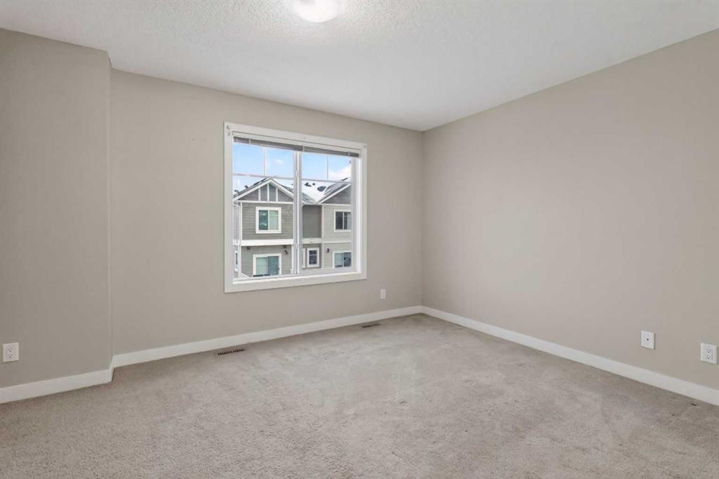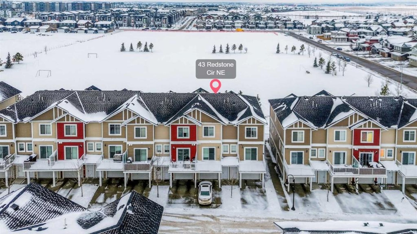 BACKING ONTO A HUGE GREEN SPACE, this bright and spacious open-concept townhouse condo in Kintalla of Redstone offers an exceptional location and layout. The main floor features laminate flooring, a generous living room, and a beautifully designed kitchen with ceiling-height cabinets, ample counter space, and a centre island with breakfast bar, along with a large dining area that opens to the balcony and a convenient 2-piece bath. Upstairs includes two primary bedrooms, each with its own ensuite, plus upper-level laundry for added convenience. Ideally situated near shopping, parks, playgrounds, a future school site, transit, quick access to Stoney Trail, and just minutes from Calgary International Airport, this home is perfect for first-time buyers and investors alike.