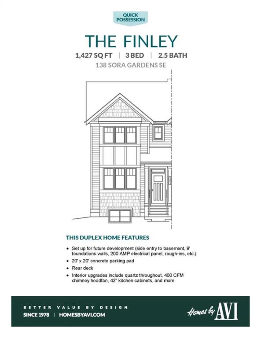 Welcome to the community of SORA in Calgary's South. This Homes by Avi semi detached FINLEY model has everything you are looking for. The kitchen carries presence: 42" UPPER CABINETS, QUARTZ COUNTERTOPS, a 400 CFM CHIMNEY HOOD FAN, and finishes that feel cohesive and elevated. The wood-look LVP, rich cabinetry, and matte black accents give it weight and warmth without locking you into a trend. Upstairs, the primary bedroom stands out for a detail most people don’t expect — A WALK-IN CLOSET WITH A WINDOW. It sounds simple. It isn’t. Natural light in a closet turns it from storage into real space. Both full bathrooms continue the quartz surfaces, keeping the finish level consistent throughout. And the laundry is right where it should be — upstairs, close to the bedrooms — because nobody dreams about carrying baskets down two flights of stairs. The basement is already prepared for what’s next: SEPARATE SIDE ENTRY, 9' FOUNDATION WALLS, a 200-AMP ELECTRICAL PANEL, and ROUGH-INS FOR A FUTURE BATHROOM, LAUNDRY, AND BAR SINK. This isn’t “maybe someday” planning — it’s real infrastructure. Whether that future is additional living space, extended family, or long-term flexibility, the framework is already in place. Outside, the REAR DECK is built and ready for summer evenings that stretch a little longer than planned — coffee in the morning, friends at night, and that quiet half-hour when the sky finally goes pink over your backyard. A concrete parking pad is ready to go to keep things in their place. Just beyond, Sora is steadily taking shape — PONDS, PATHWAYS, PLAYGROUNDS, and the kind of community growth you can actually see happening. There’s energy here. You’ll know your neighbours’ names. You’ll watch the trees mature. It’s the kind of neighbourhood where you’ll look back in a few years and realize YOU GOT IN AT EXACTLY THE RIGHT TIME. This is a home you can move into with CONFIDENCE — and grow into with PRIDE. Call your agent. Book the showing. You’ll be glad you did. • PLEASE NOTE: Photos are of a Showhome of the same model – fit and finish may differ. Interior selections and floorplans shown in photos.