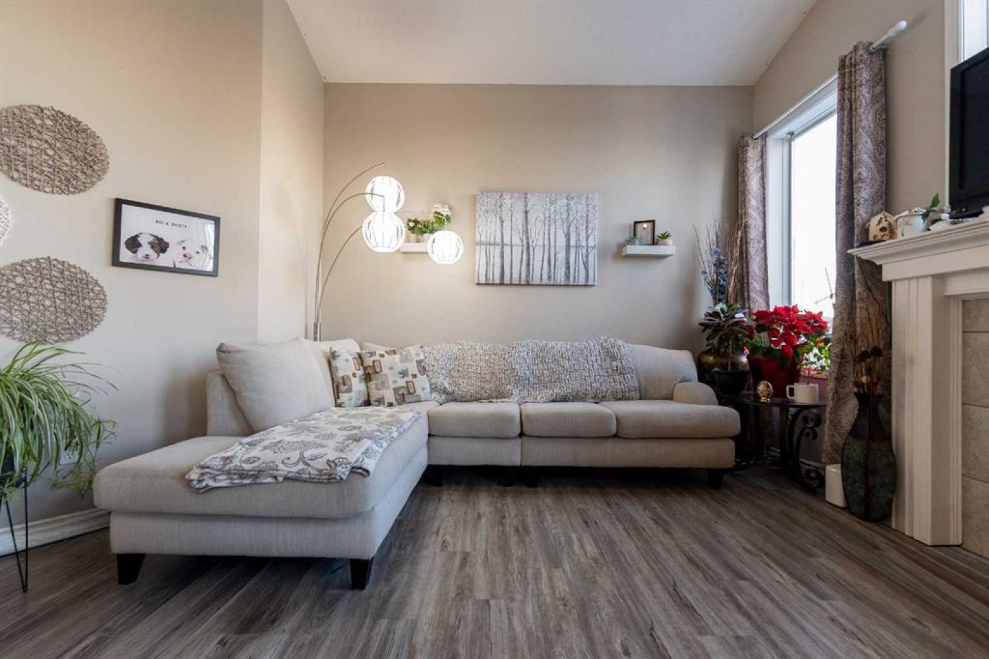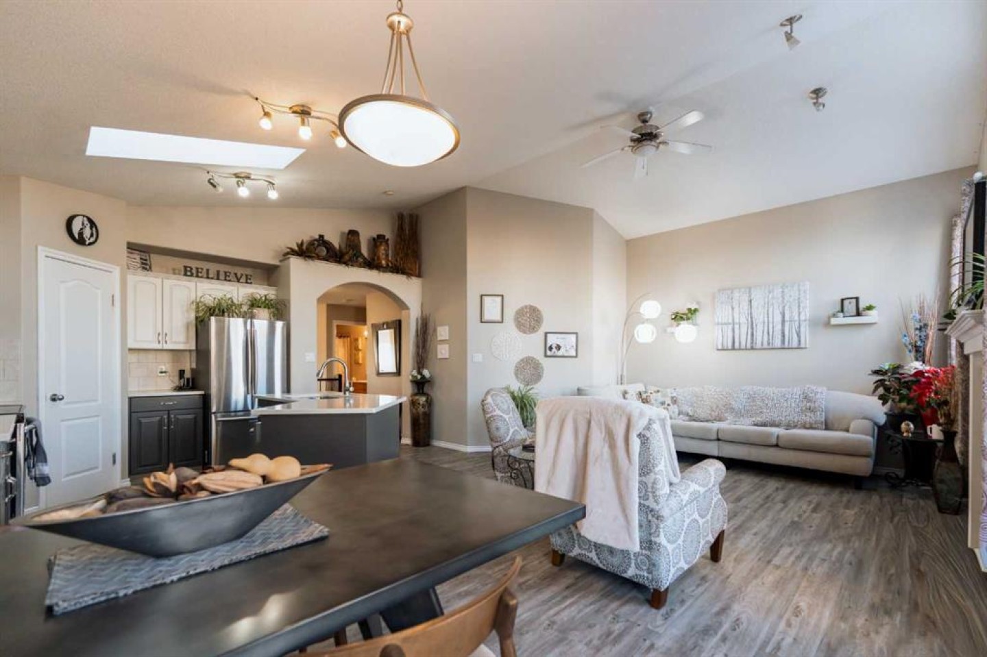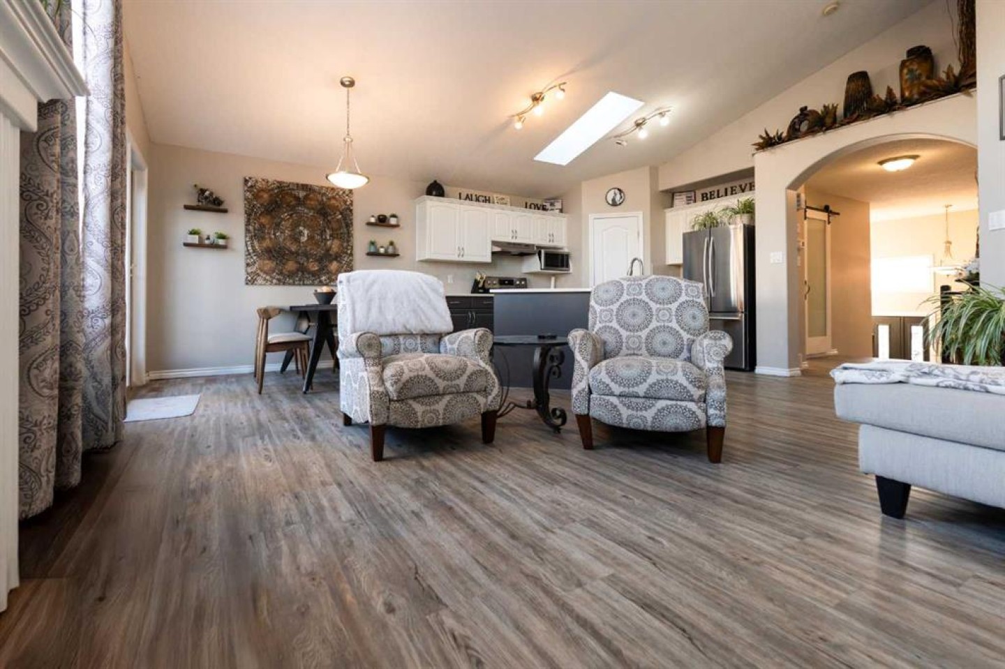65 Heritage Circle W, Lethbridge Heritage Heights | 5 Bedrooms | 3 Bathrooms | 1,338 Sq.Ft. | Double Attached Garage From the moment you step inside, the home feels open and inviting. A bright entryway welcomes you with high ceilings and a split staircase accented by dark iron railing, creating a memorable first impression. The layout naturally draws you into the main living space, framed by soft archways that create seamless flow from room to room. The main floor offers 3 bedrooms and 2 bathrooms, highlighted by vaulted ceilings and large windows that flood the living room with natural light. A central fireplace with a classic white mantle anchors the space, creating a warm and welcoming focal point. The kitchen is centered around a large island with white countertops and an under-mount sink. Dark lower cabinetry contrasts beautifully with white upper cabinets, and a skylight above brings in additional natural light, brightening the kitchen and dining area throughout the day. The dining space sits just off the kitchen and is framed by glass doors that lead outside. The primary bedroom features vaulted ceilings, large windows, a walk-in closet, and a private 4-piece ensuite complete with a full tub and shower combination, extended vanity with ample counter space, and tiled flooring. The fully finished basement offers a spacious family room, 2 additional bedrooms, and a full bathroom, with large perimeter windows that provide excellent natural light.
