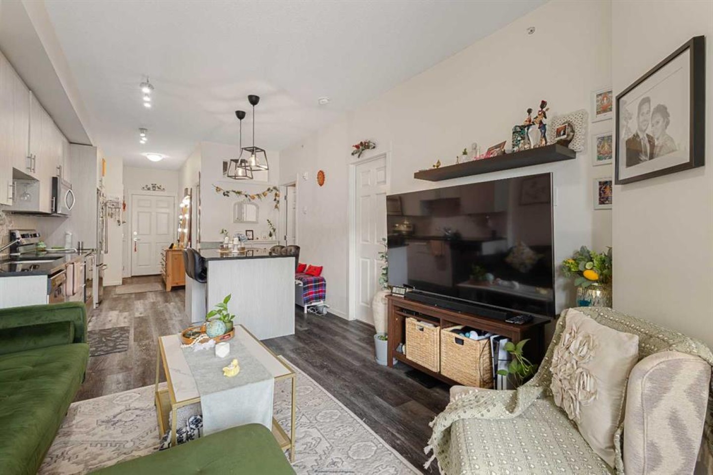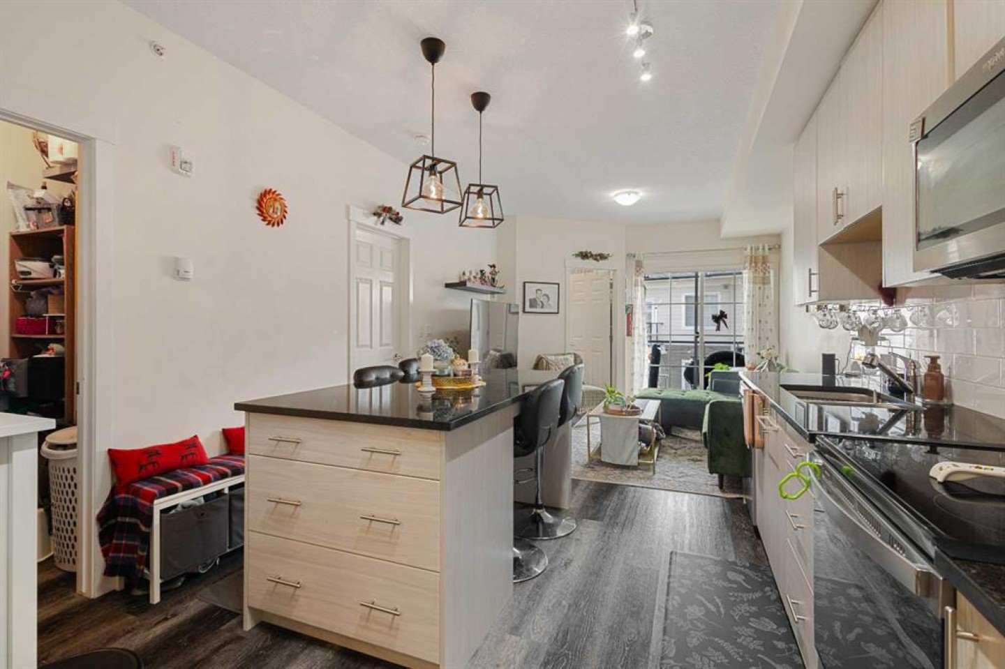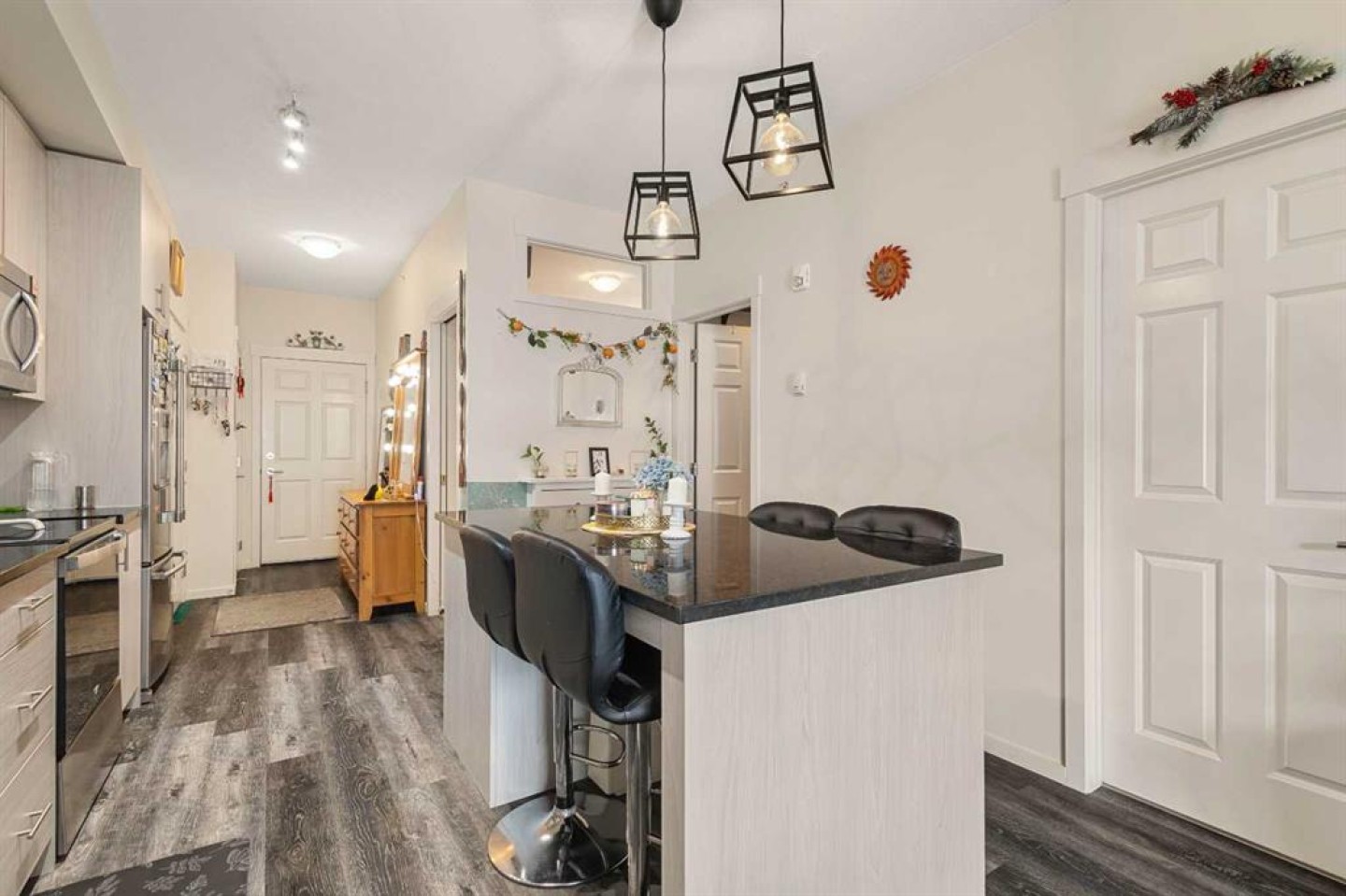 Welcome to Unit - 2414 at 298 Sage Meadows Park NW — a beautifully designed top-floor condo built in 2020, nestled in the desirable northwest community of Sage Hill. This modern, move-in ready home offers 2 spacious bedrooms, 1 full bathroom, and stunning East-facing views of the peaceful pond and surrounding park. Inside, you'll find a bright, open-concept layout featuring 9’ ceilings, durable Luxury Vinyl Plank flooring throughout, and an abundance of natural light from oversized windows. The stylish kitchen is a true highlight, equipped with sleek quartz countertops, full-height cabinetry, stainless steel appliances, and a large island with seating—perfect for cooking, entertaining, or enjoying takeout nights. The living area flows seamlessly off the kitchen, offering a cozy space to relax and unwind. Step out onto your private balcony to enjoy your morning coffee with tranquil water views. The primary bedroom features a generous walk-in closet, while the second bedroom offers versatility for guests, a home office, or even a roommate setup. A well-appointed 4-piece bathroom is conveniently located nearby. Additional features include in-suite laundry, titled surface parking, and a storage locker—ideal for seasonal items, sports gear, or extra storage. This well-managed building offers access to scenic walking paths, green spaces, and nearby ponds and parks, all just steps from your door.